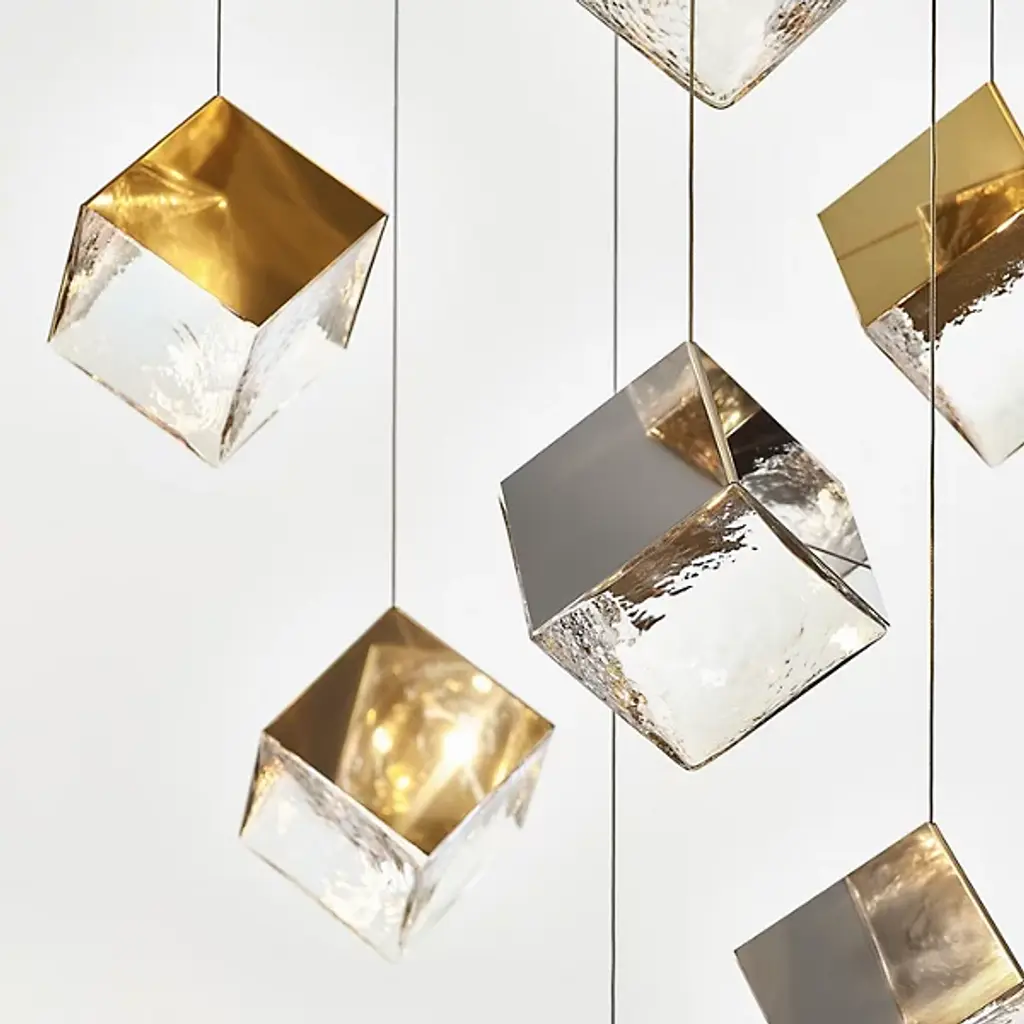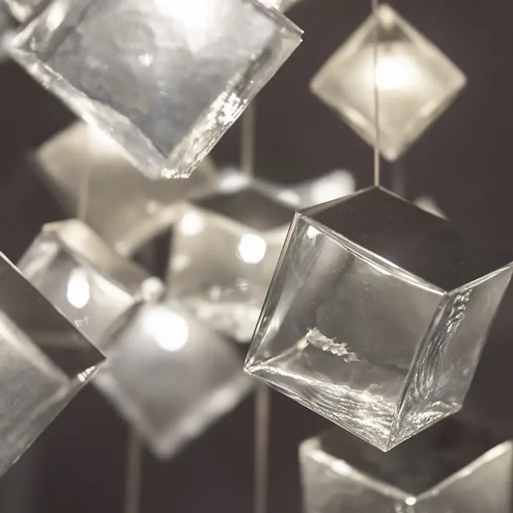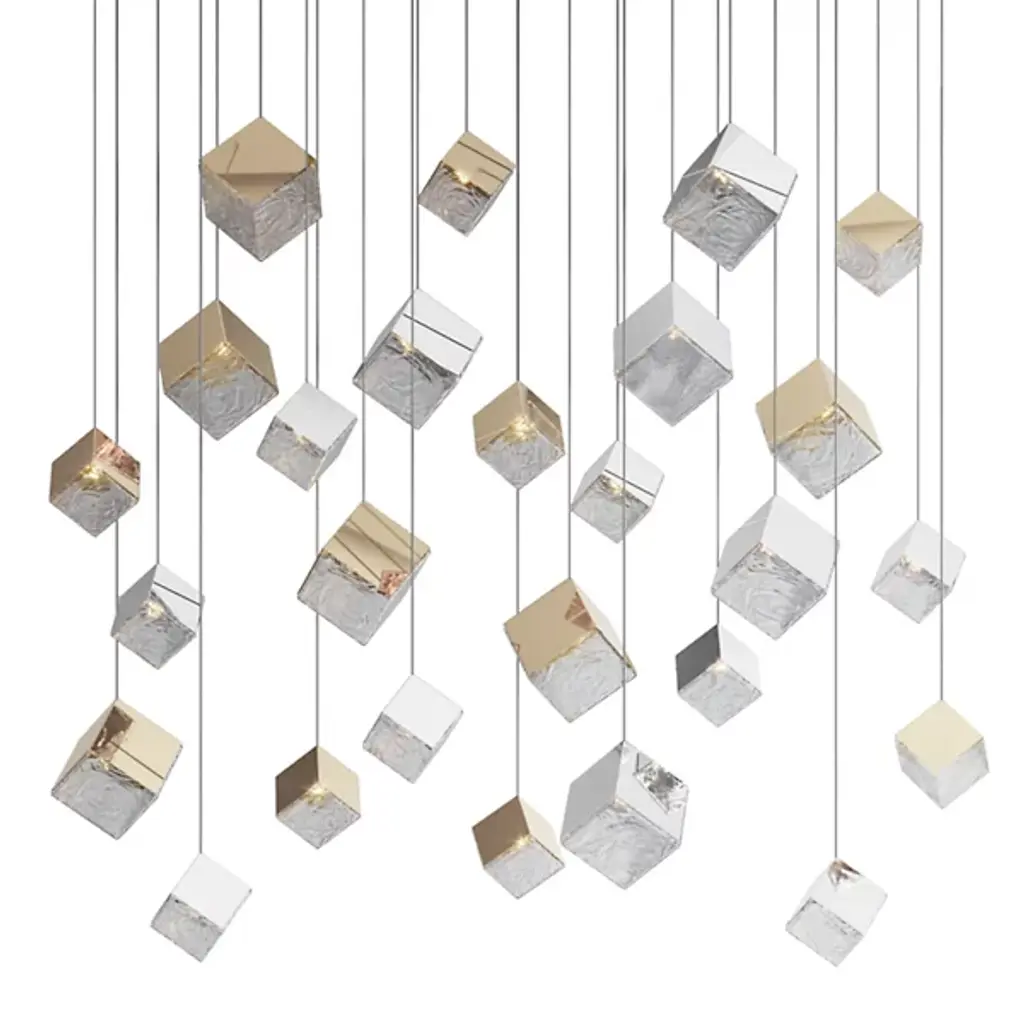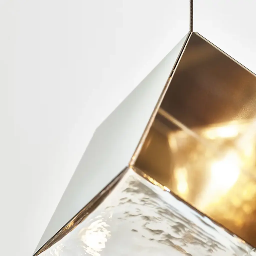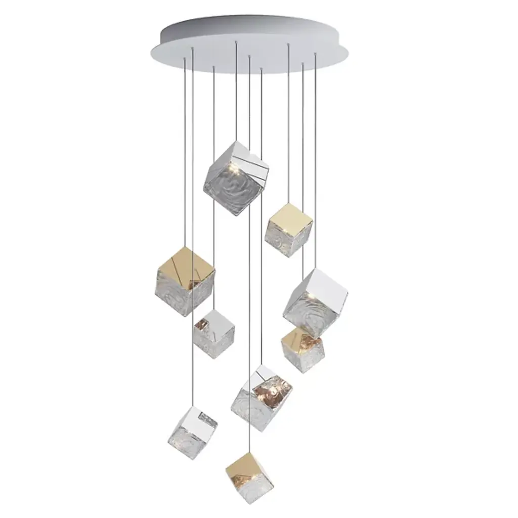 The Pyrite Chandelier from Bomma blends simplicity with a touch of elegance. Handblown molten crystal is shaped into a precise cube, resulting in a unique light fixture with a gleaming, rippled surface encased on three sides by polished metal. Designed by DECHEM Studio, inspired by the beauty of mineral formations, the chandelier comes in two stunning finishes. The golden option reflects its namesake, golden firestone, while the silver finish is inspired by the purity of salt crystals, offering a sophisticated lighting solution for any space.