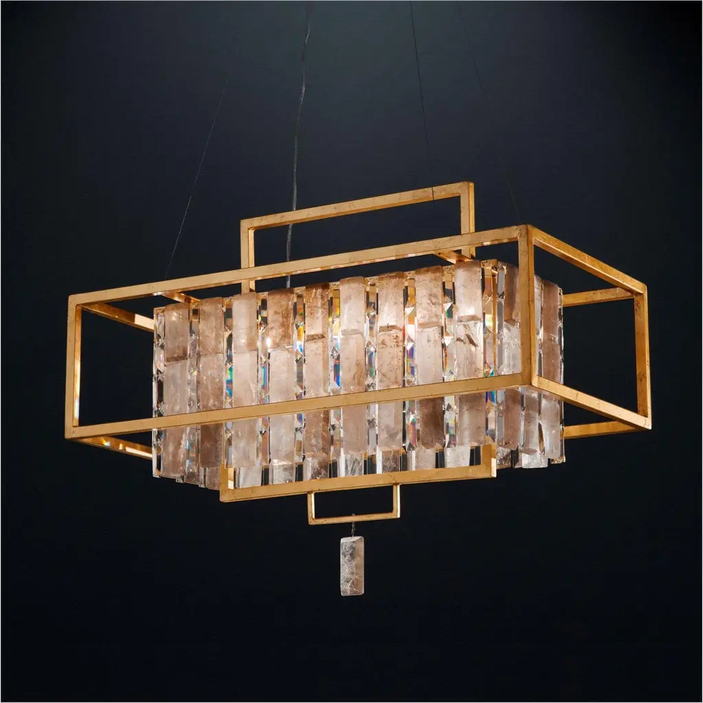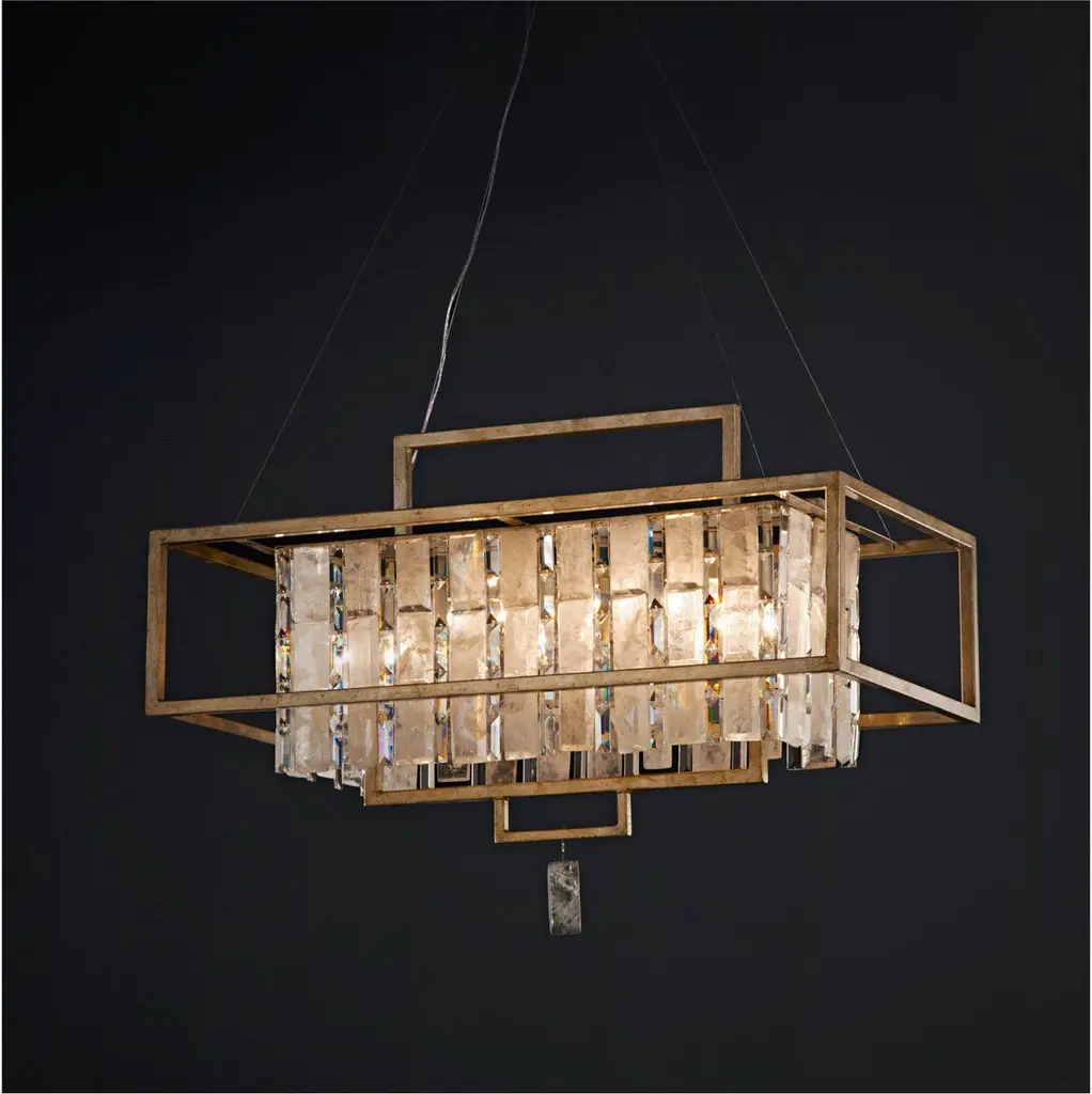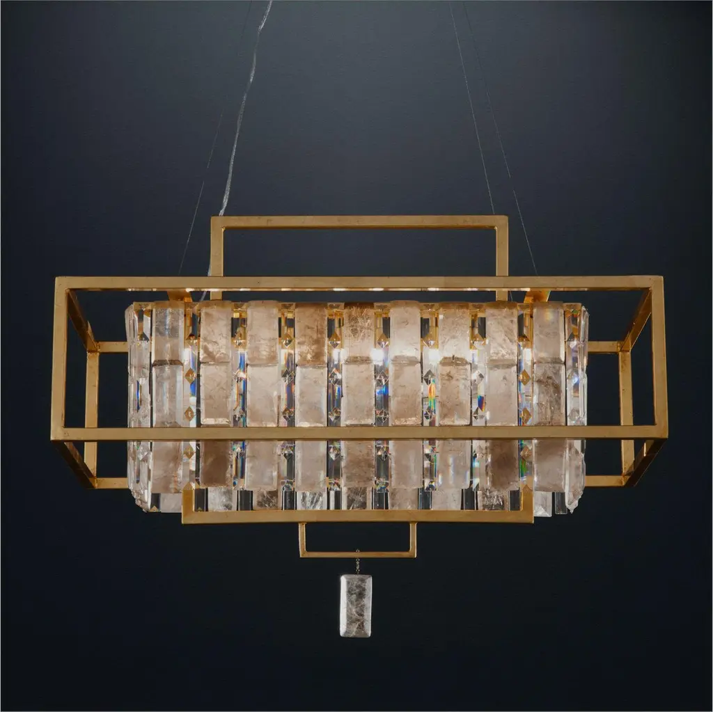 Quartz chandelier lamp by Aver Dimensions: D 50 x W 100 x H 65 cm Materials: Aluminum, plated with gold leaf. Natural Smokey Quartz. Lighting: 10 x E14Finish: Silver veneer, aged silver veneer, gold veneer, aged gold veneer, copper veneer, aged copper veneer, aged gold patina, antique patina.Also available in white quartz, smoky quartz, citrine quartz. All our lamps can be wired according to each country. If sold to the USA it will be wired for the USA for instance.Geometric pendant using rectangular plates of natural rock crystal and cut crystal. The Art Deco movement served as inspiration for the project.The history of Aver Metais as a lighting brand begins with Jefferson Aver manufacturing lamps in a completely handcrafted way and with very few resources in the family business. Over the years, the brand has grown and gained recognition. Today, our products are present in several projects by prestigious professionals, in addition to being resold in lighting boutiques in different regions of Brazil. Through its partners, Aver Metais has several participations in important design and architecture exhibitions. In 2015 the company started its internationalization process and today has clients and projects carried out in places like New York, Los Angeles, Chicago, Dallas, Miami, London, Cardiff, Hamburg, Manila, Santa Cruz de la Sierra, and Lima, attesting to the level quality and competitiveness of Aver Metais products.In our factory, each piece is meticulously produced using modern production processes combined with craftsmanship to detail. The result is original pieces that, more than illuminate, are jewels for your home. Over the years, the brand has been dedicated to creating and producing original and high-quality decorative lighting fixtures that can fit into the most varied and demanding interior architecture projects.