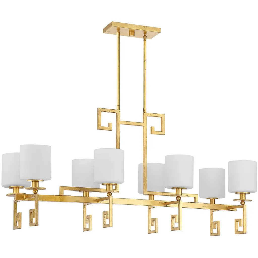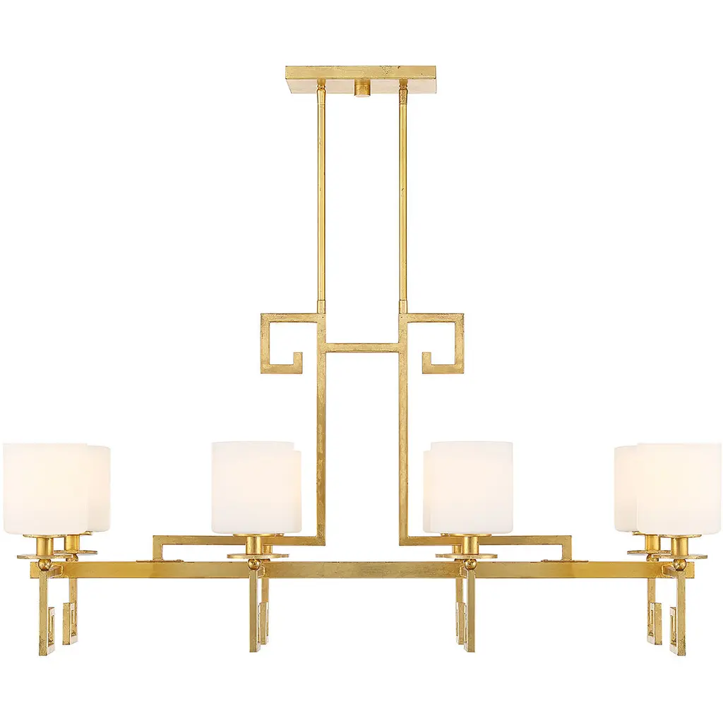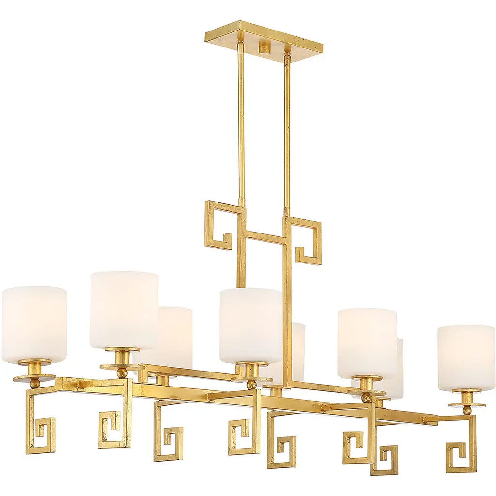 Bring a touch of Mediterranean magic to any space with the Savoy House Quatrain 8-light trestle It showcases Greek key detail, white opal glass shades and a beautifully textured True Gold finish that recalls gold leaf. Quatrain is 41.25" in length, 15.5" in width and has an adjustable height ranging from 21.5" to 75". Comes with eight 12" downrods and two 6" downrods. Uses 8 standard size bulbs with a max of 60 watts per bulb (bulbs not included).