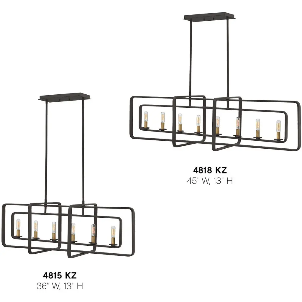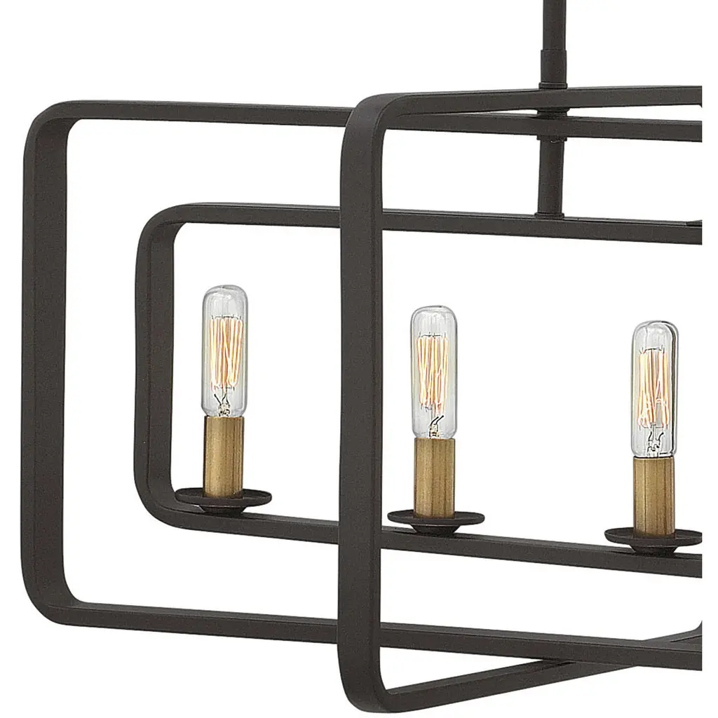 Quentin is constructed of angular forms that create a striking geometric interplay. This stem-hung collection features intersecting rectangles in a bold Buckeye Bronze finish, forming a modern silhouette. Candle sleeves in Heritage Brass add a distinctively vintage feel that is both hip and historical.