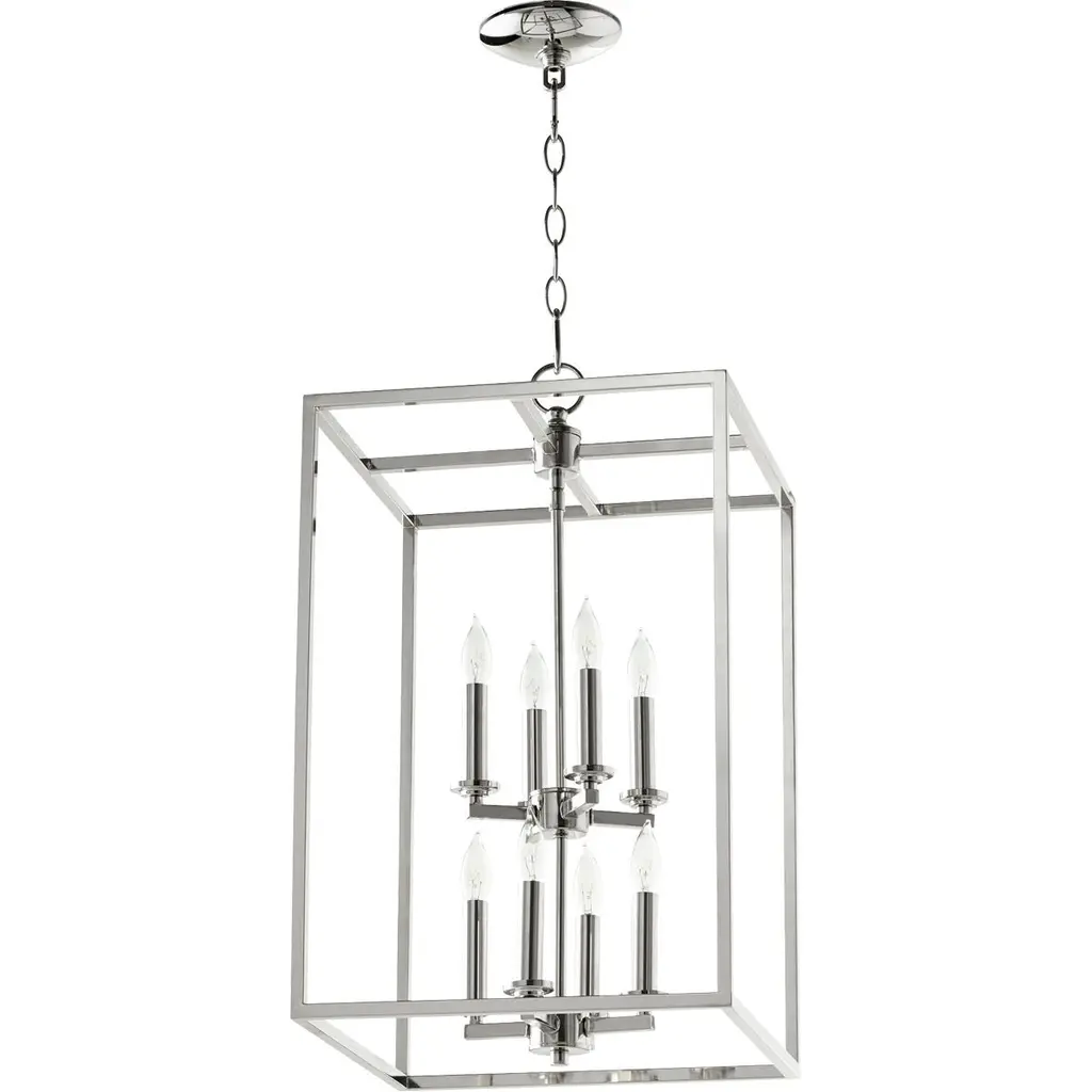 Collection: Cuboid, Finish Color: Polished Nickel, Width: 8", Height: 14", Number Of Bulbs: 4, Wattage: 60 Watts, Dimmable: No, Moisture Rating: Dry Rated, Desc: Cuboid - Four Light Large Entry Pendant Features: Product Type: Entry / Style: Quorum Home Collection / Finish: Aged Silver Leaf . ,