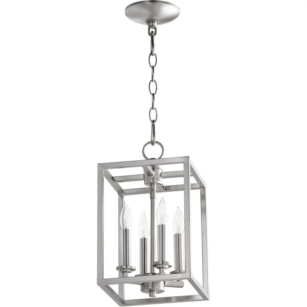 Collection: Cuboid, Finish Color: Satin Nickel, Width: 8", Height: 14", Number Of Bulbs: 4, Wattage: 60 Watts, Dimmable: No, Moisture Rating: Dry Rated, Desc: Cuboid - Four Light Large Entry Pendant Features: Product Type: Entry / Style: Quorum Home Collection / Finish: Aged Silver Leaf . ,