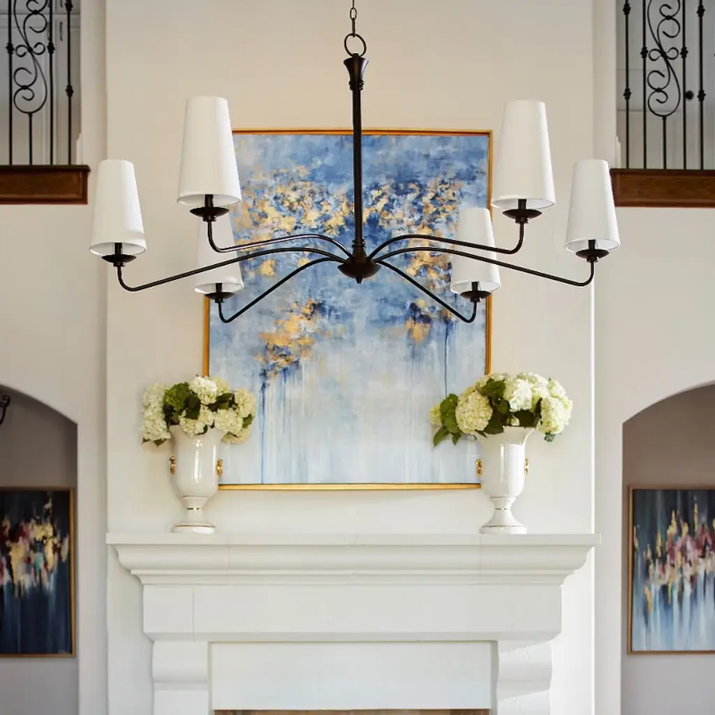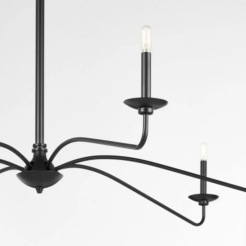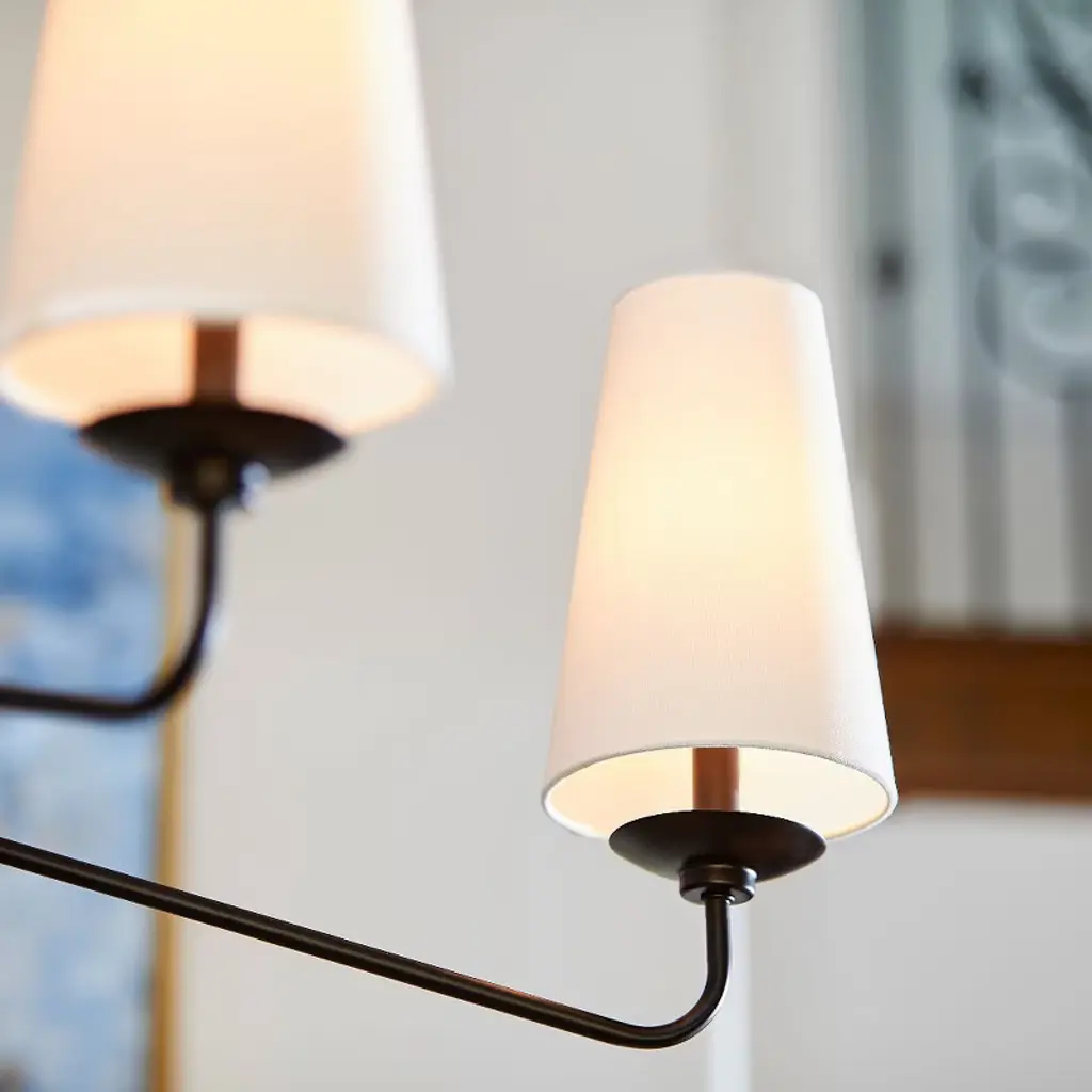 Collection: Euphora, Finish Color: Matte Black, Width: 62", Height: 29.75", Hanging Method: Rod and Chain, Lamping Type: Incandescent, Number Of Bulbs: 6, Wattage: 360 Watts, Moisture Rating: Damp Rated, Desc: Sweeping curves and classic tapered drum white linen shades unite, creating a striking display of transitional charisma in the Eurphora series of lighting. The artistry of the Euphora 6 light chandelier is evident in the soft contour of a slender frame finished in matte black. Adorn your kitchen or dining space with the elegance of the Eurphora. Requires 6 - 60 Watt / Candelabra Base Bulbs / Removable White Linen Shade / Damp Listed / Height adjustable with 2-8", 2-12", 3-16" stems included. ,