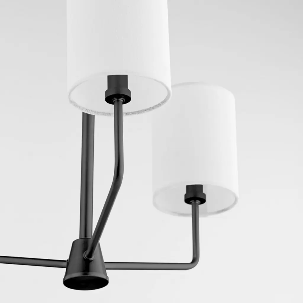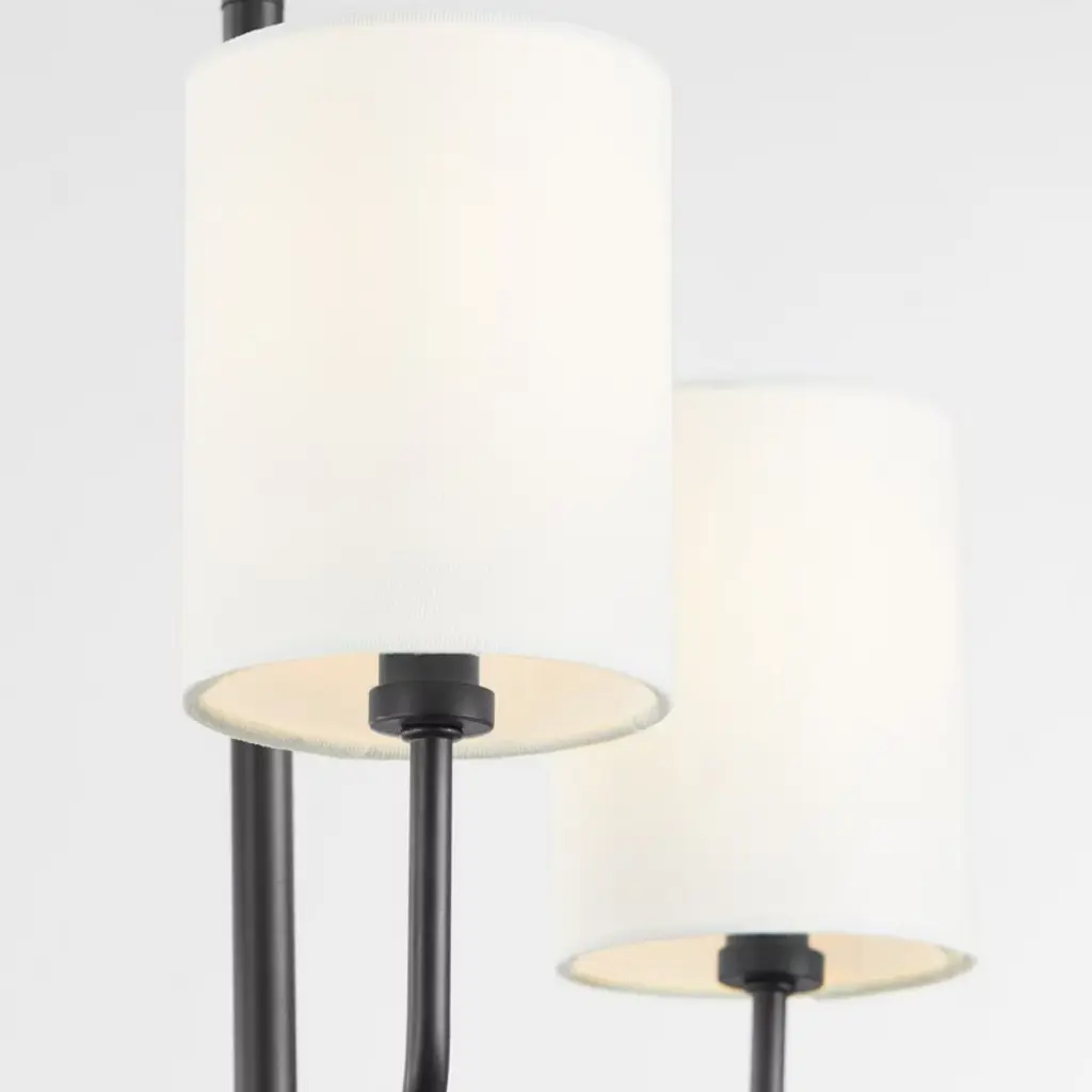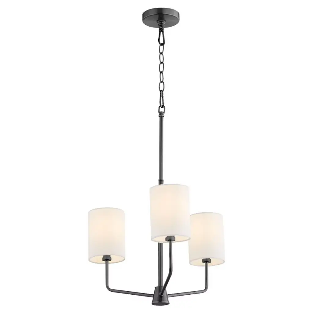 Collection: Harmony, Finish Color: Matte Black, Width: 18", Height: 14.5", Hanging Method: Rod and Chain, Lamping Type: Incandescent, Number Of Bulbs: 3, Wattage: 180 Watts, Moisture Rating: Damp Rated, Desc: Strong, linear profiles frame the lights in the Harmony series, rooting the family in a modest approach to transitional style. Display with or without the included white linen shades for a customized look. The Harmony series is ideal for indoor kitchens, dining rooms, living rooms, or entry foyers. Requires 3 - 60 Watt / Candelabra Base Bulbs / Removable White Linen Shade / Damp Listed / Height adjustable with 2-8", 2-12", 2-16" stems and 1' chain included. ,