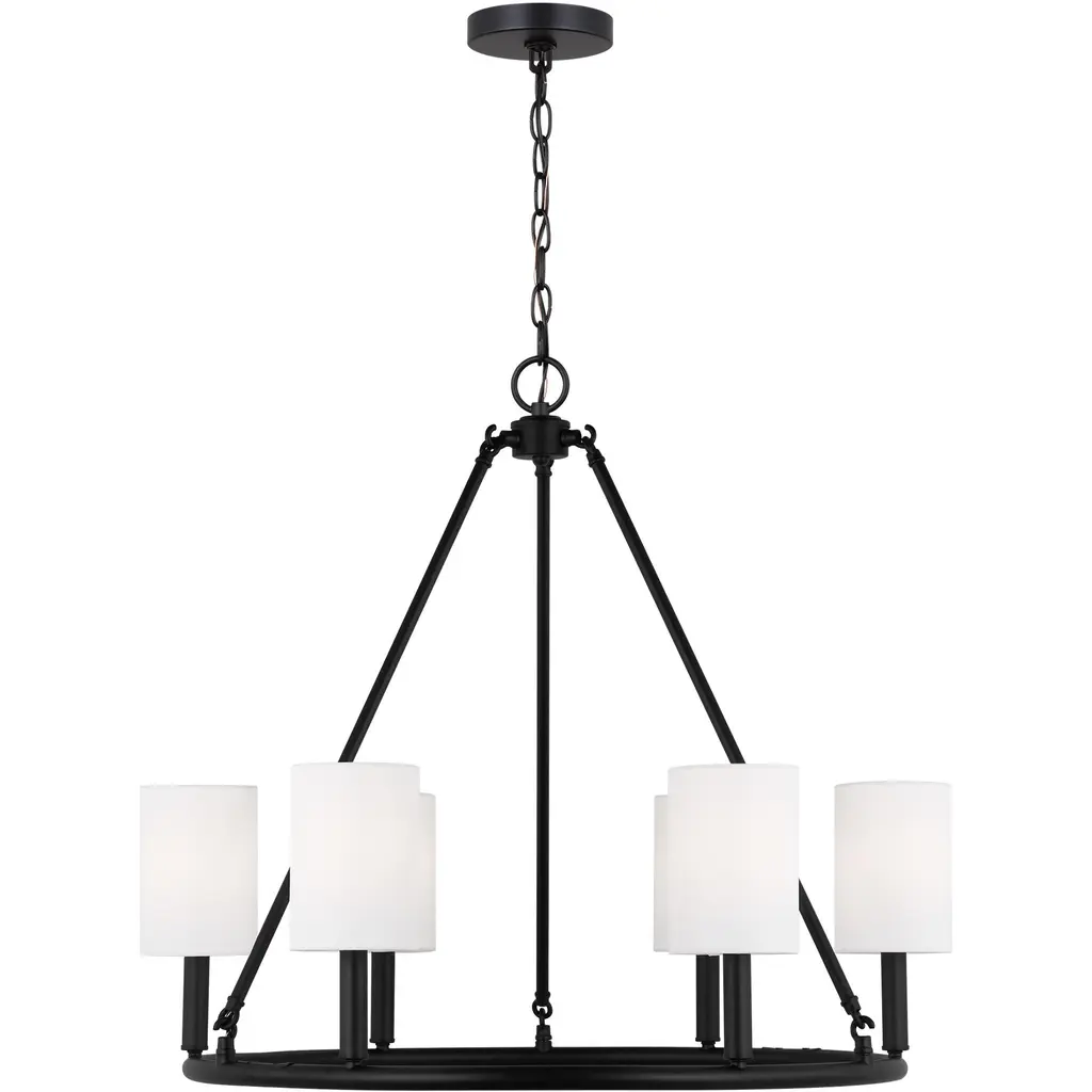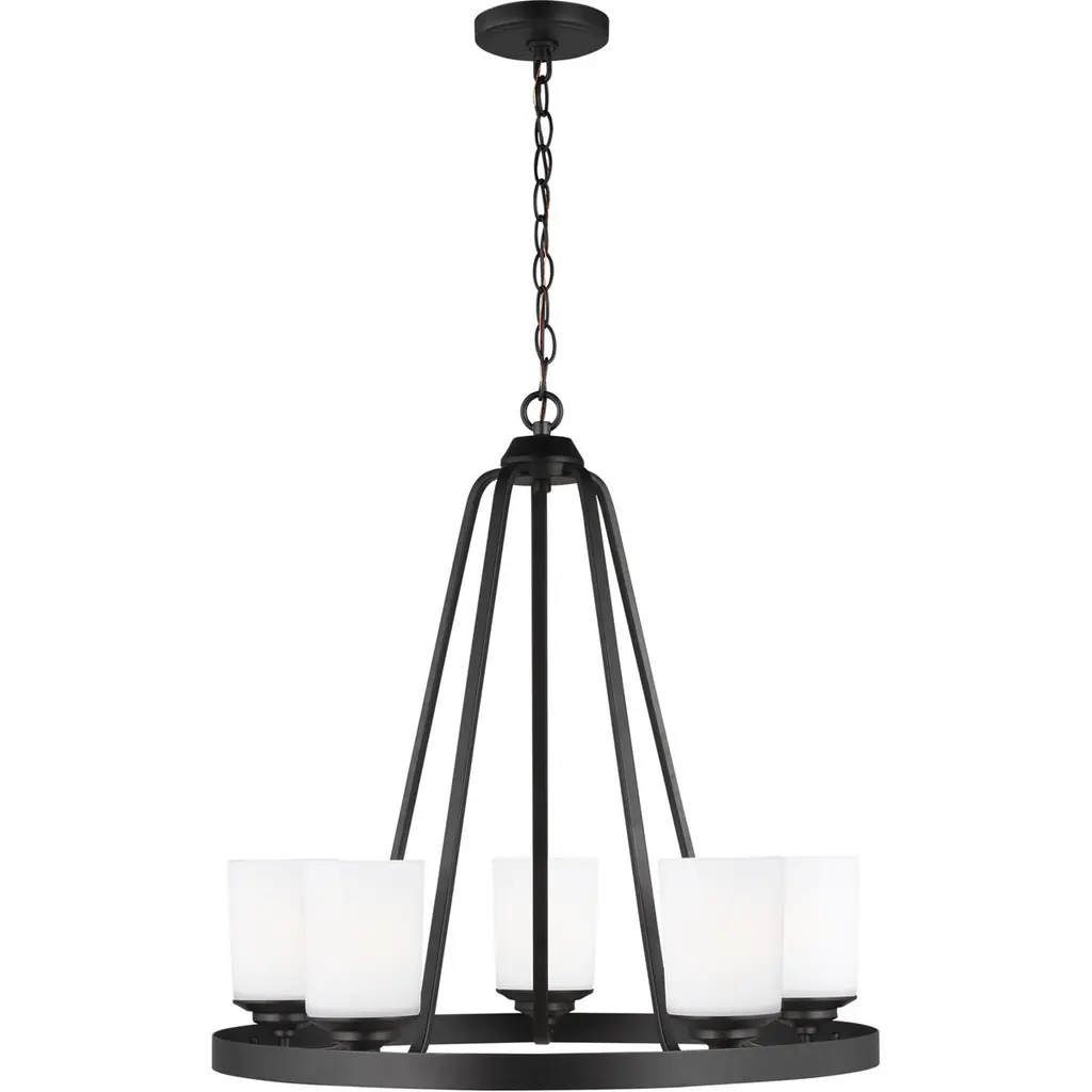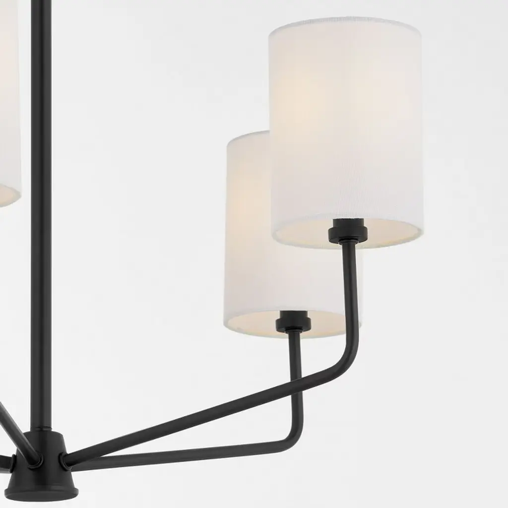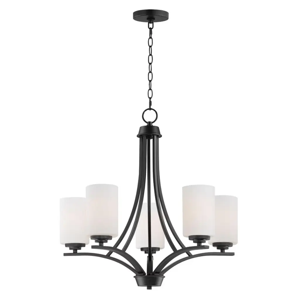 Collection: Harmony, Finish Color: Matte Black, Width: 25", Height: 17.5", Hanging Method: Rod and Chain, Lamping Type: Incandescent, Number Of Bulbs: 5, Wattage: 300 Watts, Moisture Rating: Damp Rated, Desc: Strong, linear profiles frame the lights in the Harmony series, rooting the family in a modest approach to transitional style. Display with or without the included white linen shades for a customized look. The Harmony series is ideal for indoor kitchens, dining rooms, living rooms, or entry foyers. Requires 5 - 60 Watt / Candelabra Base Bulbs / Removable White Linen Shade / Damp Listed / Height adjustable with 2-8", 2-12", 2-16" stems and 1' chain included. ,