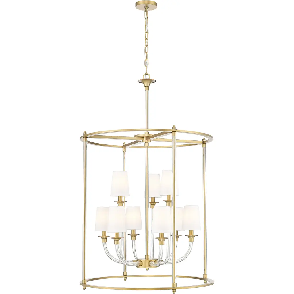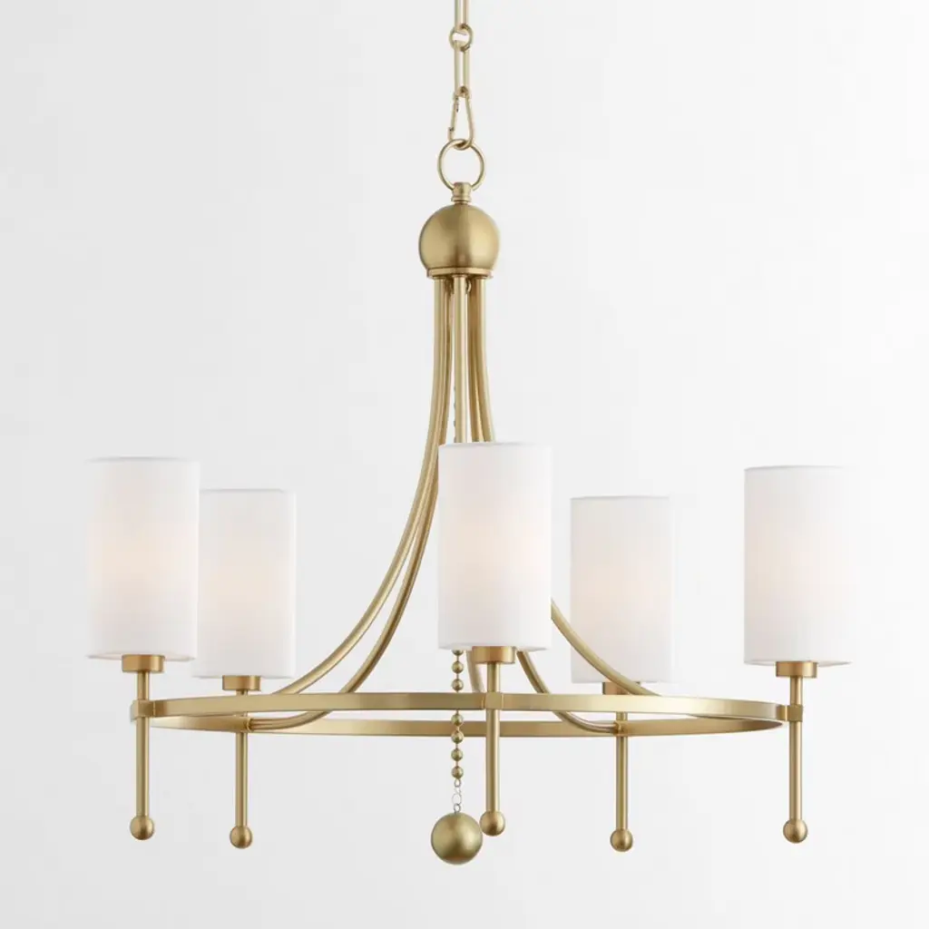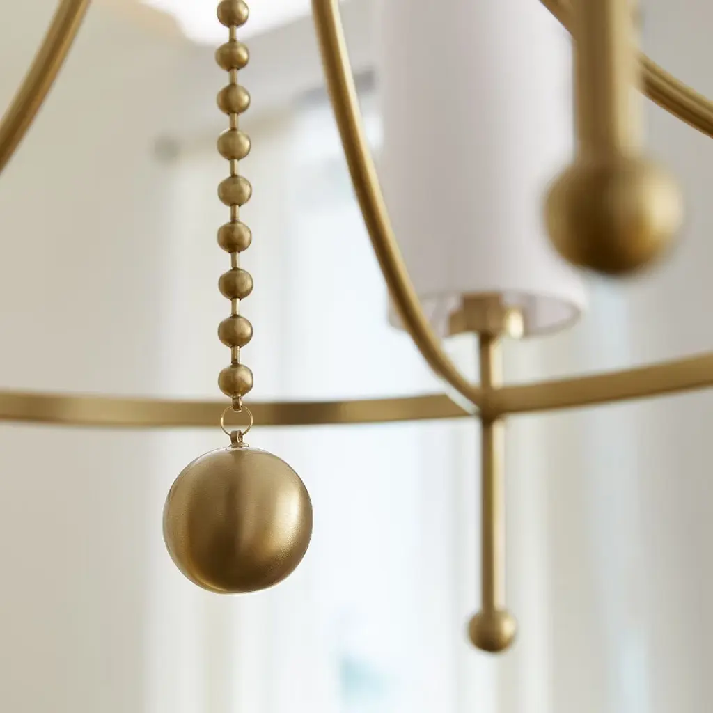 Collection: Lee Boulevard, Material: Fabric, Finish Color: Aged Brass, Width: 28", Height: 26.5", Hanging Method: Chain, Lamping Type: Incandescent, Number Of Bulbs: 5, Wattage: 300 Watts, Moisture Rating: Damp Rated, Desc: Nestled on four acres in the center of Kansas City, the Lee Boulevard home offers a feeling set apart from the city, which inspires Tamara Day to design this collection. A traditional design with a touch of contemporary through spherical details reflects the Lee Boulevard home's little slice of countryside amidst a sprawling citscape. Modern beaded elements and classic white linen shades offer tranisitional comfort with a luxurious impression. Two chandelier designs, linear pendants, wall mounts, and vanities come in options of matte black or aged brass finishes. Include the Lee Boulevard 5 or 8 light bead chandelier in your next home design.,