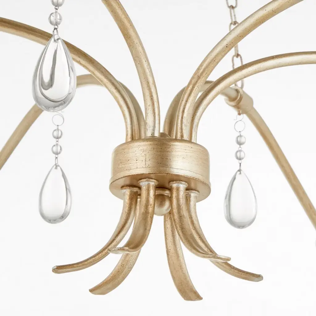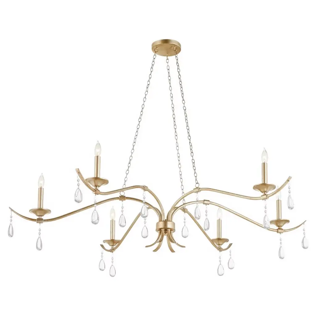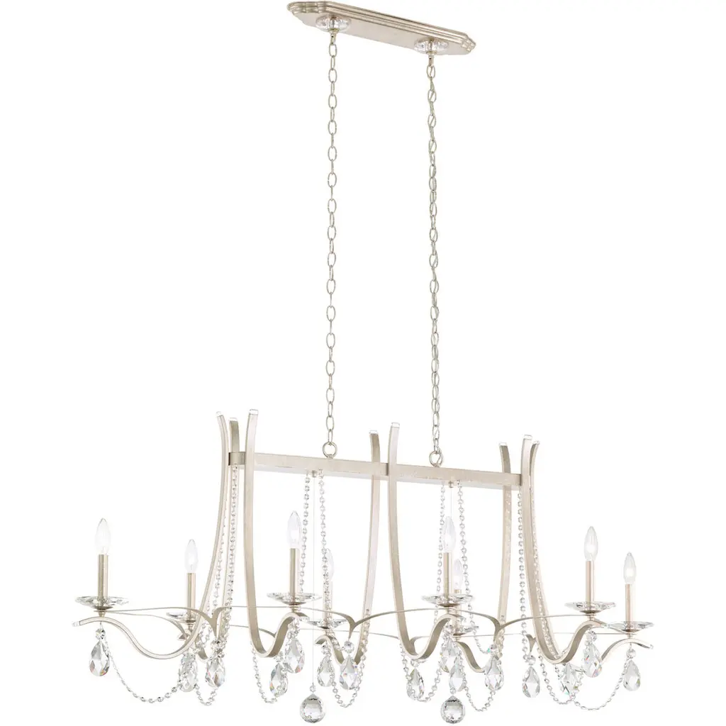 Collection: Lorelei, Finish Color: Antique Silver, Width: 50", Height: 22", Hanging Method: Chain, Lamping Type: Incandescent, Number Of Bulbs: 6, Wattage: 360 Watts, Moisture Rating: Damp Rated, Desc: Refined and simplistic, the Lorelei family of dressed chandeliers offers a feeling of restrained opulence. Options of matte black or aged silver leaf finishes grace elongated, sweeping curves, firmly rooting the series in transitional appeal. Elevate your space with radiance created by hanging crystals and sturdy and dainty chains. Requires 6 - 60 Watt / Candelabra Base Bulbs / Damp Listed / Height adjustable with 8 Ft. included chain, 4 each. ,
