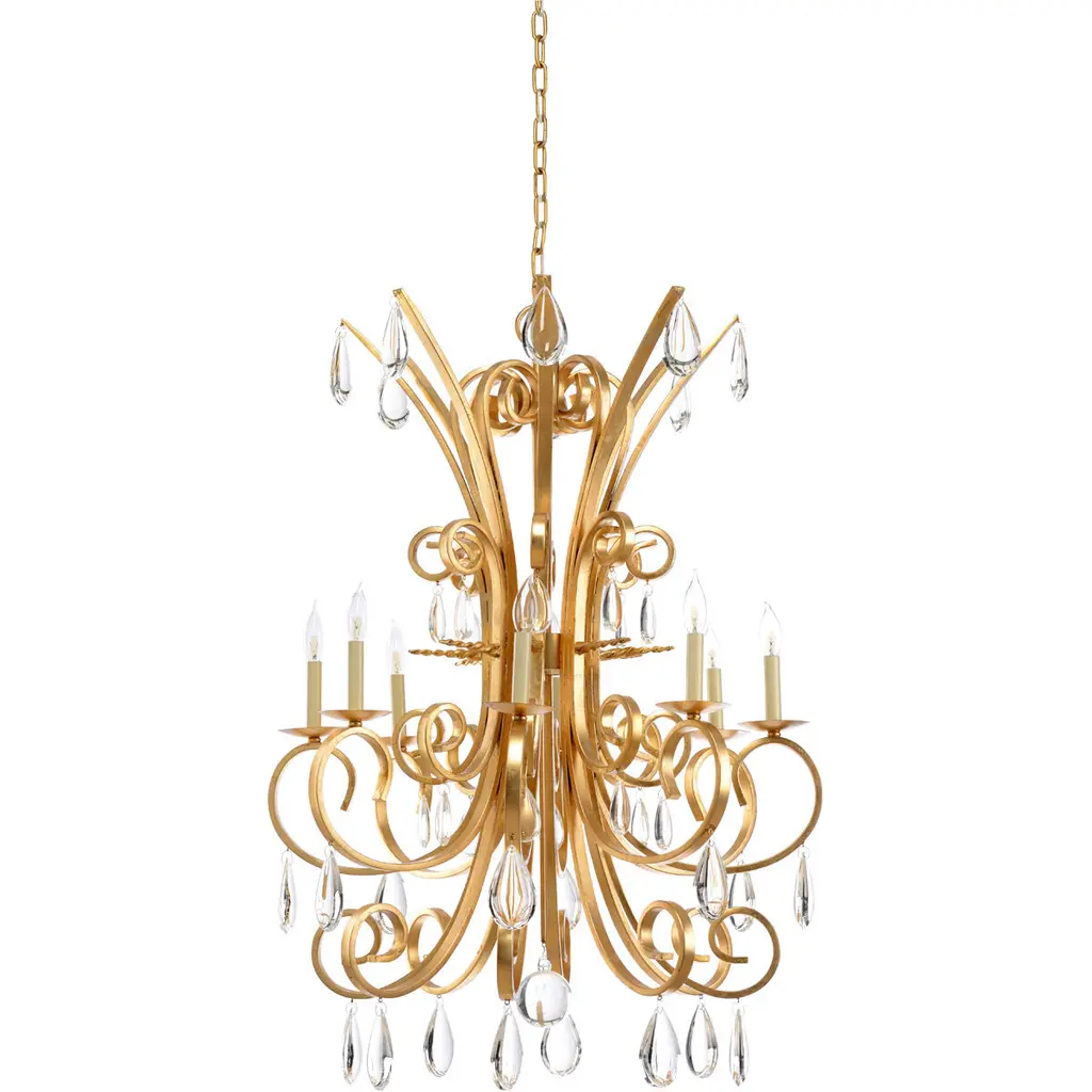 Collection: Majesty, Finish Color: Gold Leaf, Width: 38", Height: 23.75", Hanging Method: Chain, Lamping Type: Incandescent, Number Of Bulbs: 6, Wattage: 360 Watts, Moisture Rating: Damp Rated, Desc: Elegance and charm embody the Majesty series of crystal lighting. Guilded in a gold leaf finish, the lavishly detailed arcs of the frame consort to deliver an opulent presence. Modern bobeches sit below smooth, cylindrical sleeves, adding contemporary appeal to this transitional family. Requires 6 - 60 Watt / Candelabra Base Bulbs / Crystal drops / Damp Listed / Height adjustable with 8 Ft. included chain. ,
