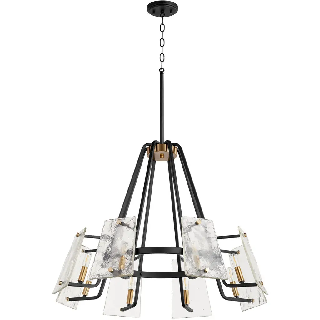 Collection: Tioga, Finish Color: Noir/Aged Brass, Width: 25", Height: 21.75", Hanging Method: Rod and Chain, Chain Length: 12", Lamping Type: Incandescent, Number Of Bulbs: 5, Wattage: 300 Watts, Moisture Rating: Damp Rated, Desc: The Tioga five-light chandelier sports a conical shape with creative elegant undertones. This Mid-Century Modern inspired design is embodied by linear framing and angular accents, while also asserting a unique abstract peculiarity thanks to frosted glass trapezoid shades. With a sleek appeal that is rooted in minimalist design, this luxury luminary exudes a nostalgic essence thanks to its geometric framing and Aged Brass-Noir finish combination. The outward extension of the light sockets creates a sense of free-floating illumination. Almost as if the light sources are orbiting the interior ring of the frame. The Tioga Series is suspended from a combination chain and stem mounting system, with the potential of adjustability for either. Damp listed, making it