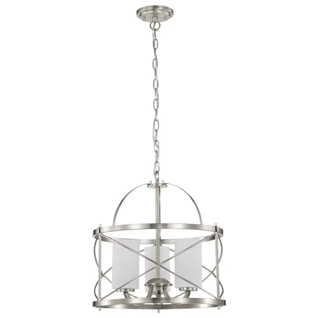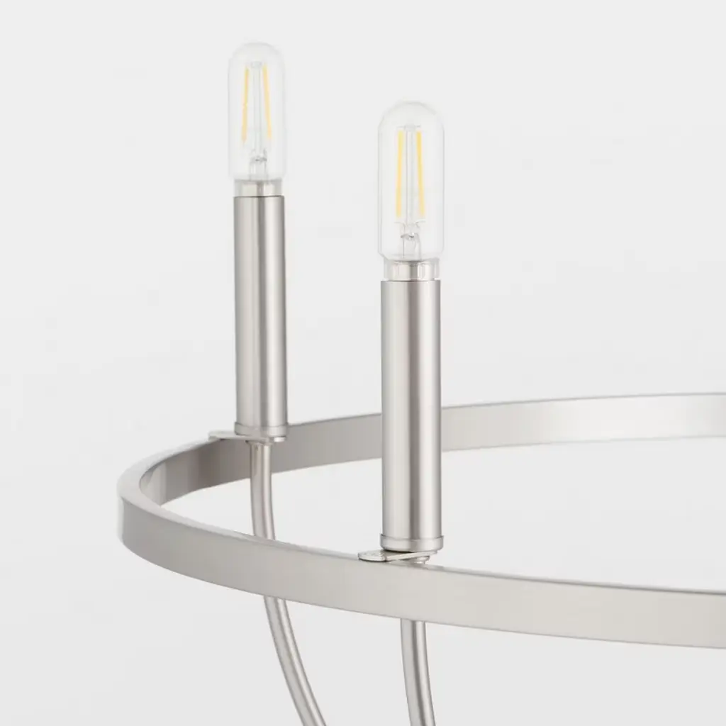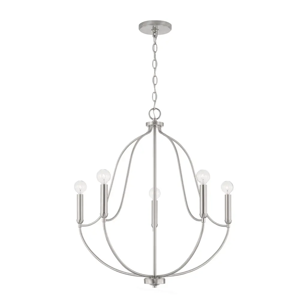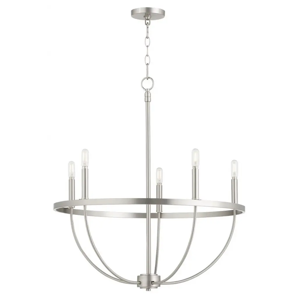 Collection: Tribute, Finish Color: Satin Nickel, Width: 28", Height: 31.75", Hanging Method: Chain, Lamping Type: Incandescent, Number Of Bulbs: 5, Wattage: 300 Watts, Moisture Rating: Damp Rated,