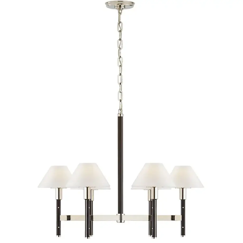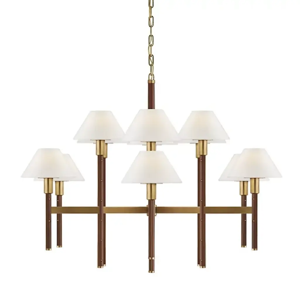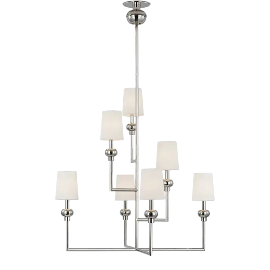 Add a warm, homey touch to your favorite space with the Radford 2-Tier Chandelier from Visual Comfort Signature, formerly known as Visual Comfort, Expressing a clean and welcoming elegance, this modern piece adds charm and grace when placed in the home. A central downrod extends a series of thin, matching arms that uphold a series of twelve candelabra-style bulbs. Each bulb rests under a soft, yet sharply-angled shade that shapes the light emitted into a soft layer of illumination.