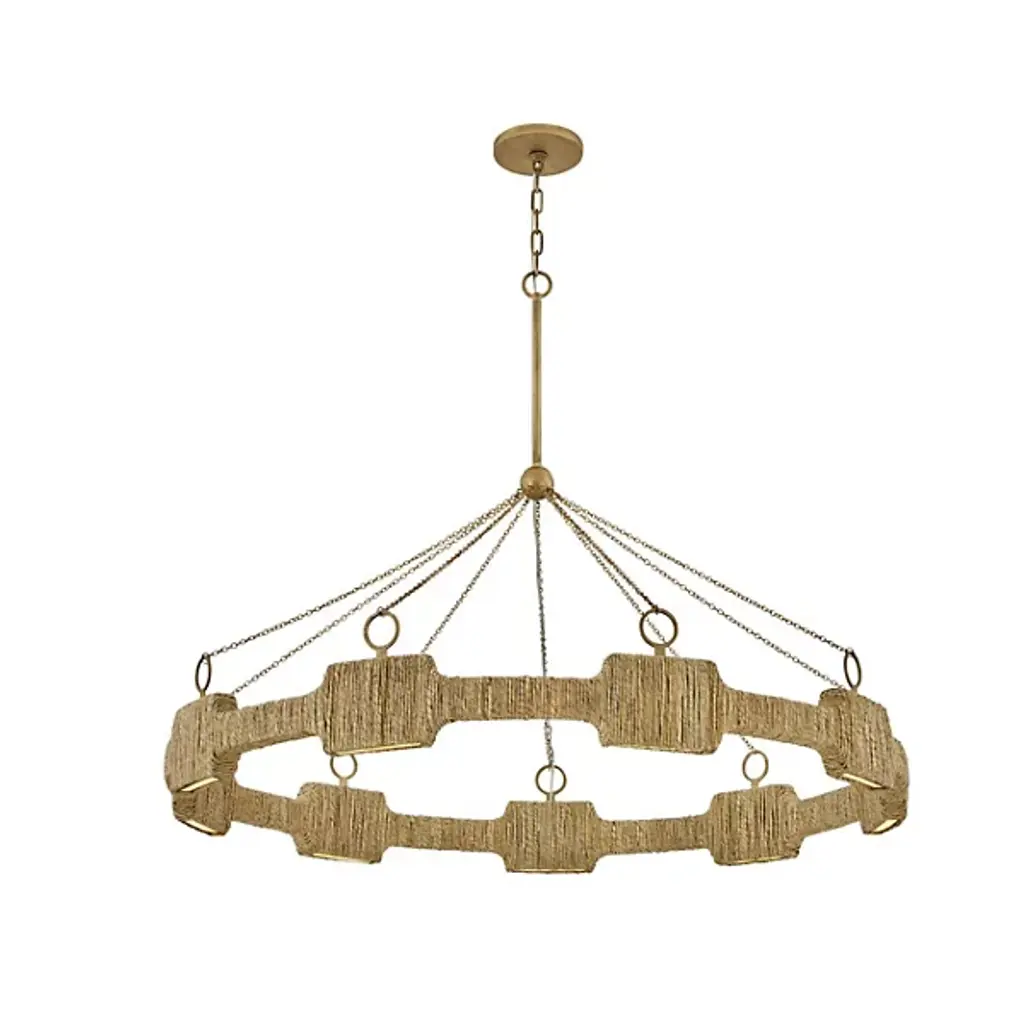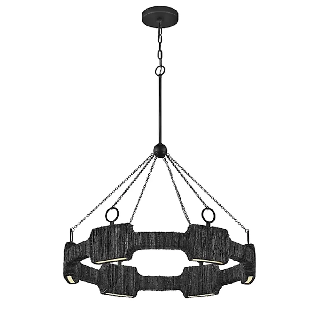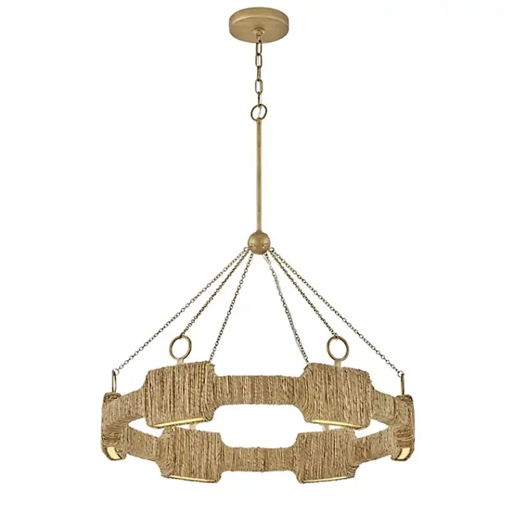 Raffi Chandelier by Hinkley blends a coastal bohemian character with a distinct, modern shape. Its unique LED design ensures abundant light with lamping set into bays inside the horizontal ring, while a slim frame hand-wrapped in natural reeds introduces an unexpected textural element. A steel construction wrapped in natural reeds, its design embodies the creative vision of designer Lisa McDennon. It adds a coastal presence to its surroundings, providing a bit of relaxed elegance to any space, merging organic textures with contemporary design for a unique lighting experience.