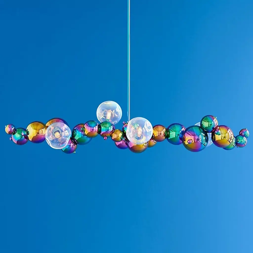 Bring a feeling of playfulness to your decorative arrangement with the Rainbow Bubbly 04 Chandelier by Rosie Li Studio. Made by Rosie Li, this chandelier features a fine brass framework that has been fashioned into the shape of a delicate bubble stream. The chandelier’s body is lined with glass globes that neatly house luminous bulbs. Your chandelier maintains suspension in midair through attachment to a downrod secured by a ceiling canopy. This artful piece gives your living space a contemporary look.