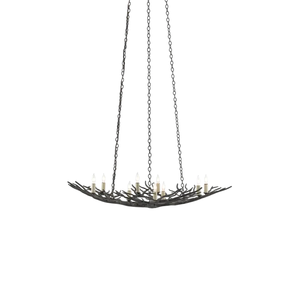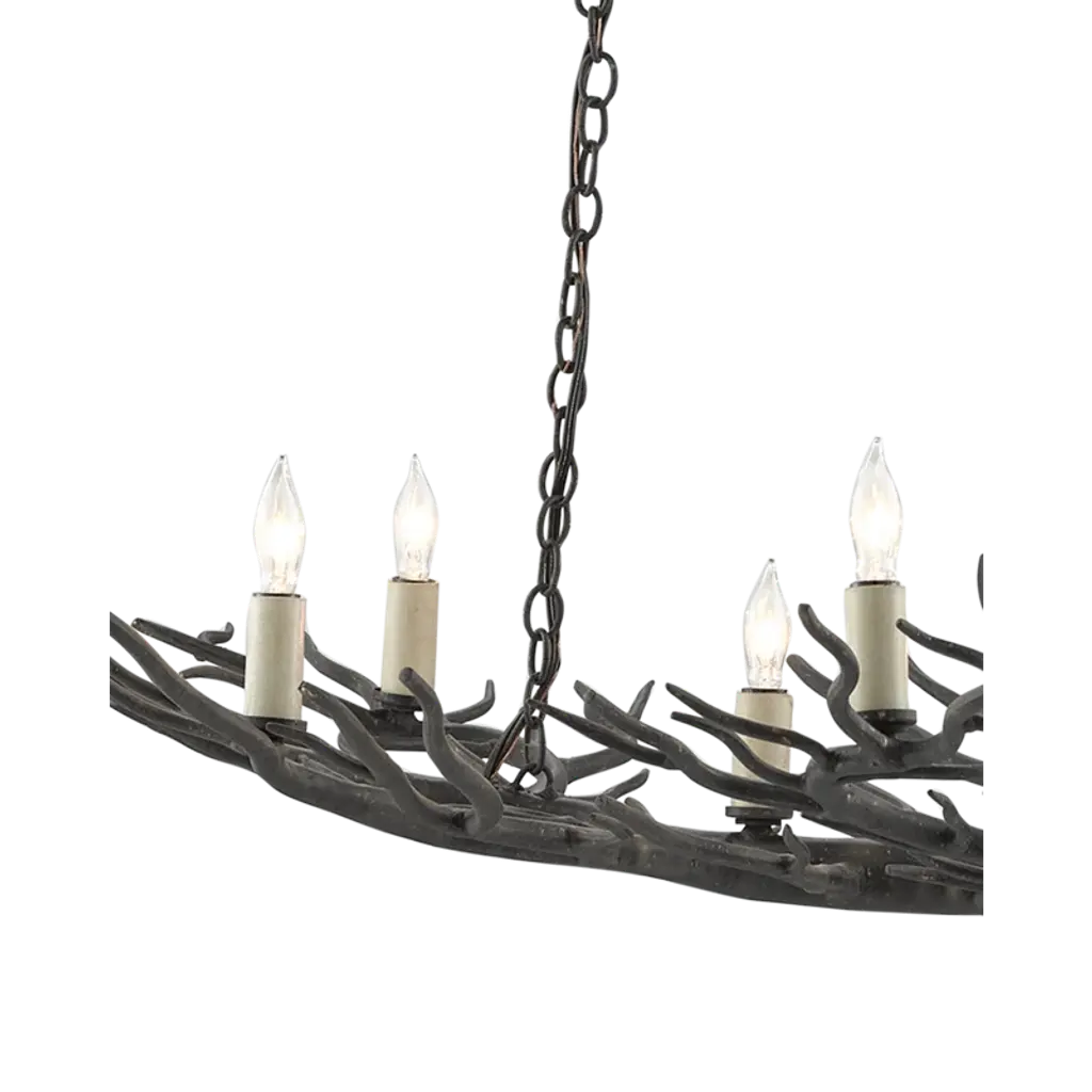Our Rainforest Bronze Chandelier has fourteen lights nestled within the hand-forged wrought iron shade of this fixture. The limbs, in a rustic bronze finish, are life-like as they cup the bulbs placed so skillfully on them. We also offer the chandelier in gesso white and silver leaf finishes, and in a smaller bronze chandelier.