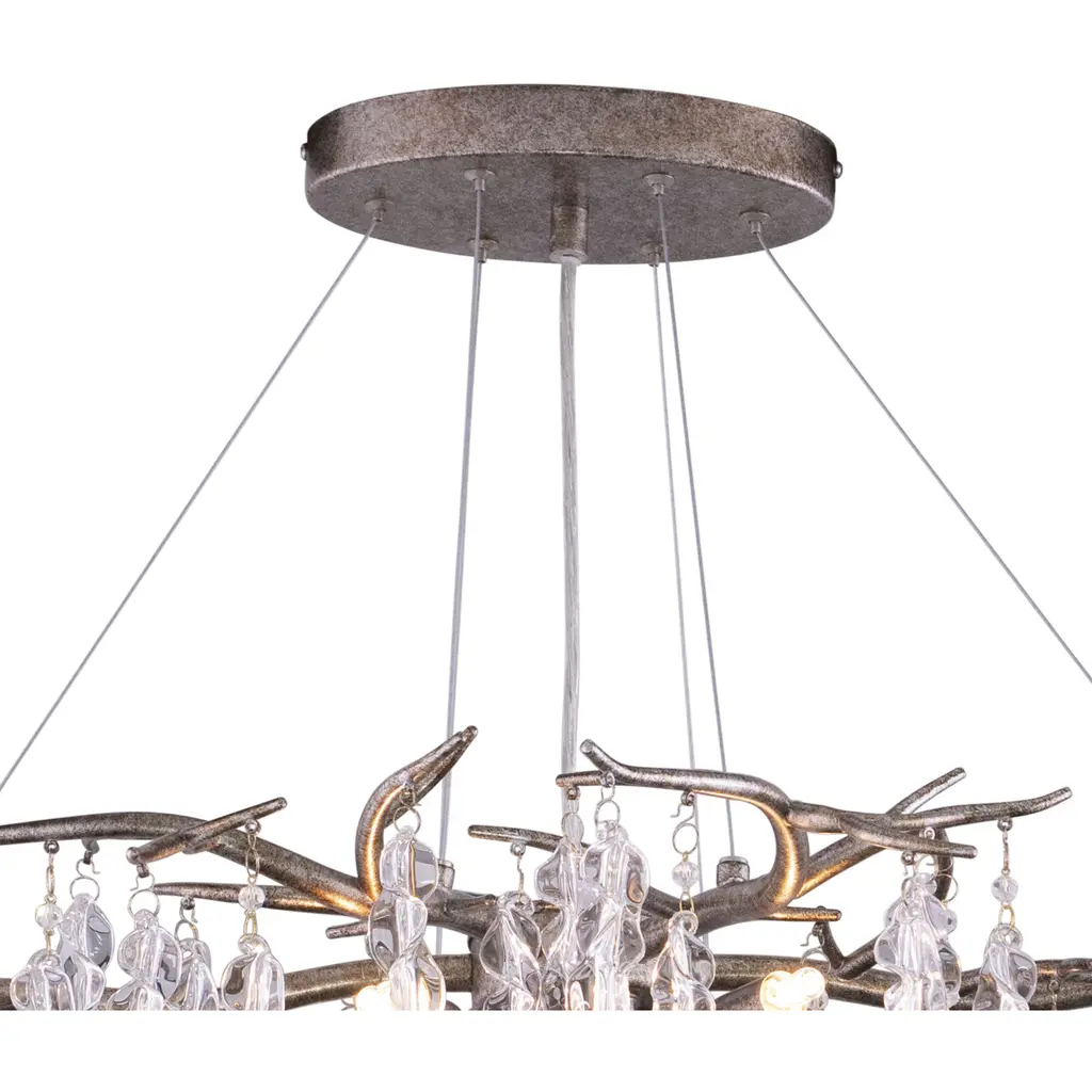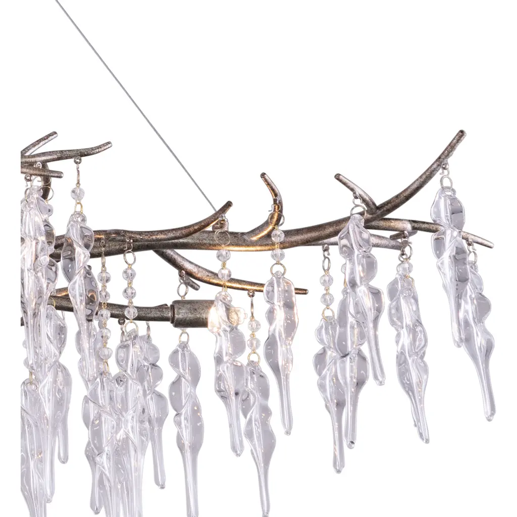 The beauty of nature is uniquely captured in this stunning collection called Rainier. A silver leaf branch-like structure gracefully suspends icicle glass strands with topped crystal beads for a glistening display of light. The elegantly styled ceiling mounted fixtures are a sure way to bring the wow factor to any dining room, living room or entryway.
