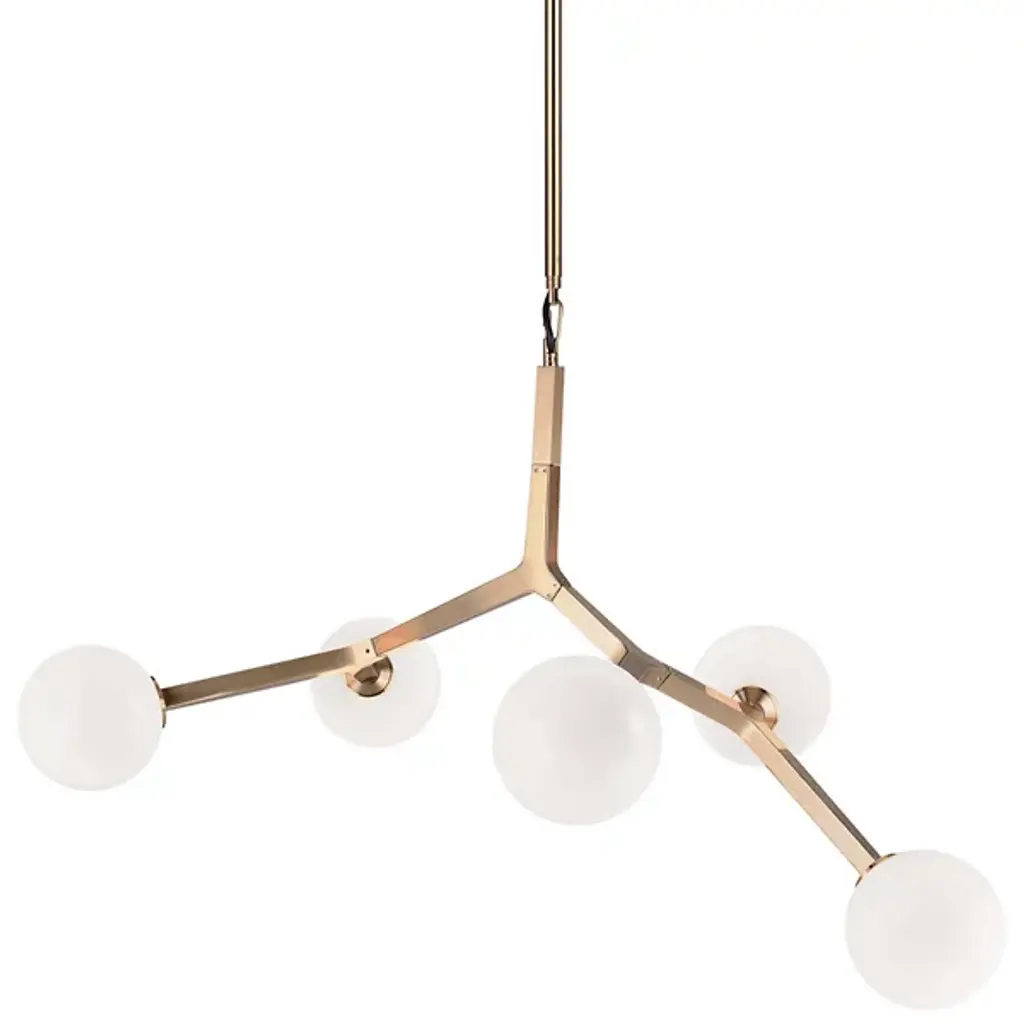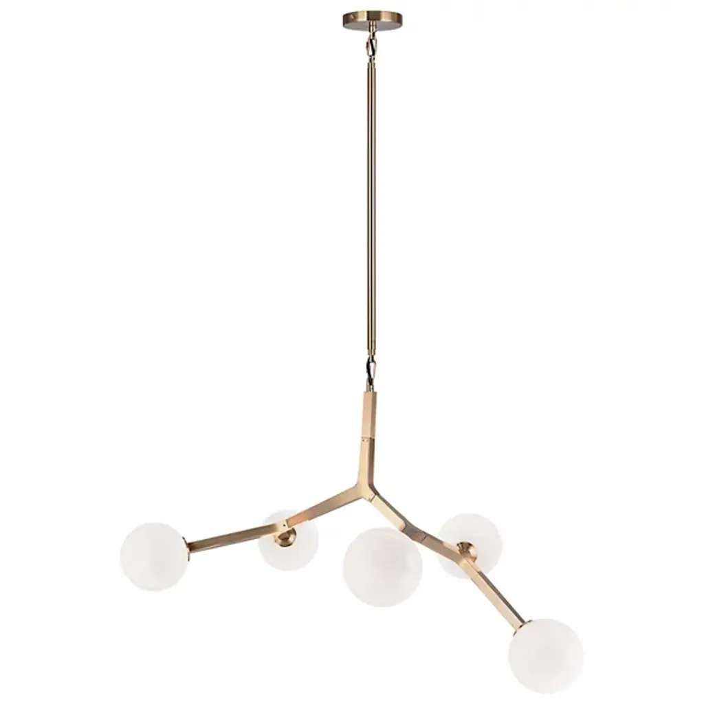 Inspired by mid-century modern design, the Rami Chandelier from Matteo Lighting fascinates like the energetic contours of a natural tree branch. The piece's open, asymmetric construction grabs the attention at every viewing angle. Its metal framework flows below with neat angle changes to create a graphic silhouette. The opal glass globes evoke plump berries as they radiate with a rich golden light.
