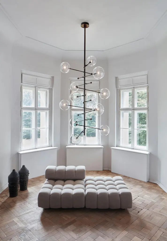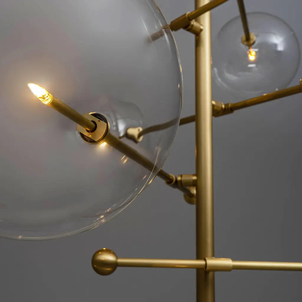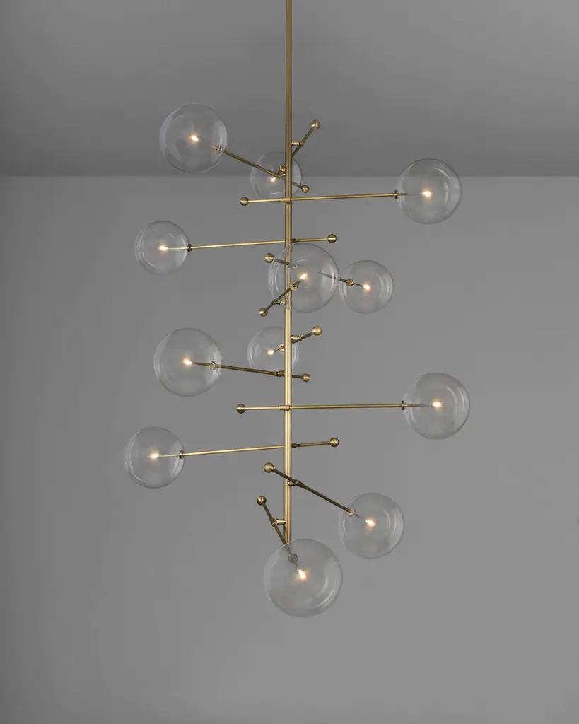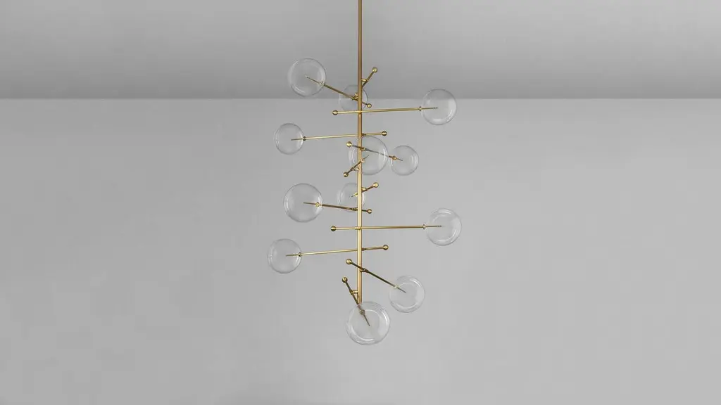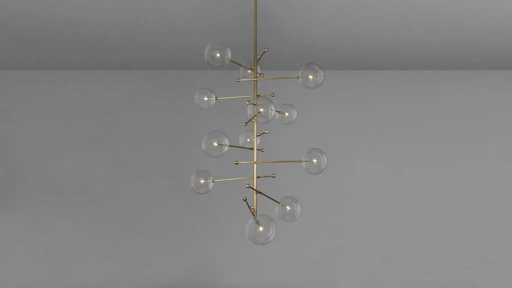 A duodecet of mouth-blown glass globes orbit a central axis, balanced on cantilevered brass arms. The poised asymmetry of the intersecting angles forms a gyroscopic composition, bringing an interstellar elegance to a space.Available in our three signature finishes: Lacquered Burnished Brass (LBB); Black Gunmetal (BGM); Polished Nickel (PN)Schwung ClassicsClassic is a concept, a family of lamps inspired by the visual nature of glass and electric light. Rather than a collection, the Classic concept comprises an array of signature pieces realized with “soap bubble” glass and exposed bulbs. Striking illuminated arrangements, the Schwung Classics are constellations of brass and glass. Carefully crafted in Poland, the precision of shape and material amplify their arresting crisp quality of light. Made in the tradition of Bohemian glass, with its lineage in Central Europe for over a century; highly durable borosilicate glass is blown into thin, durable transparent globes, intensifying minimal brass fixtures with an irresistible sparkle.Dimensions:Diameter: Ø 978 mm / 38.5”Height: 2001 mm - 2901 mm / 78.8'' - 114.2''(Extension rods included)Weight: 31.9 kg / 70.3 lbLight sources available:LED Bulb (included) 12 x 1.6 W.