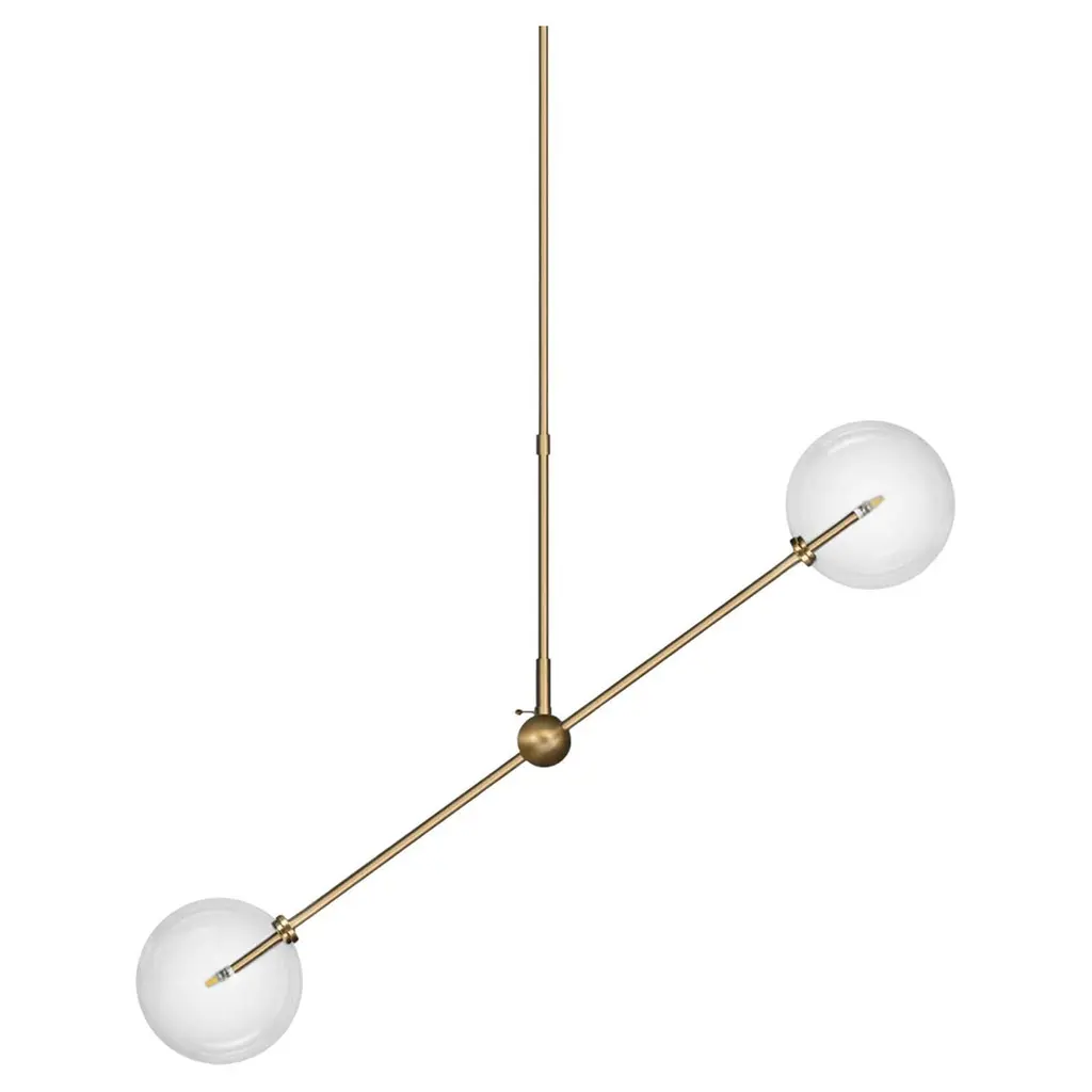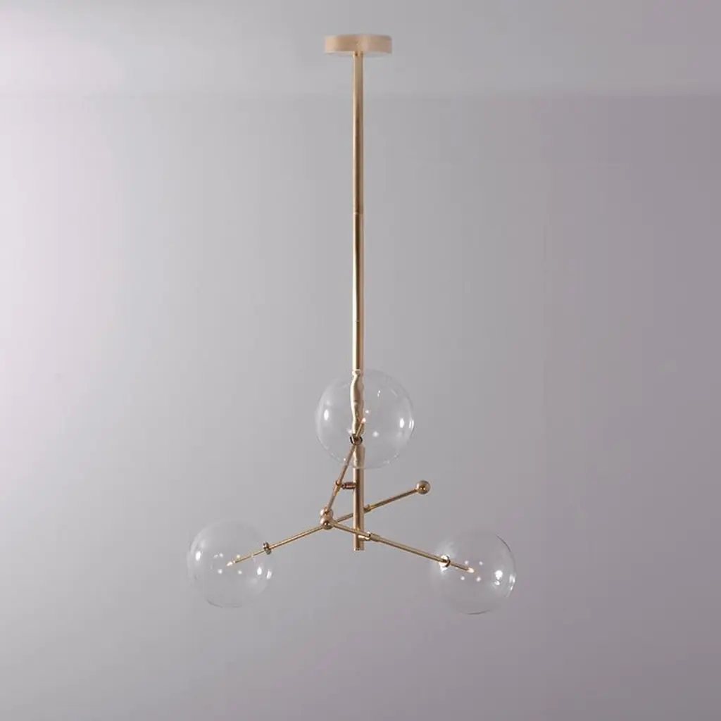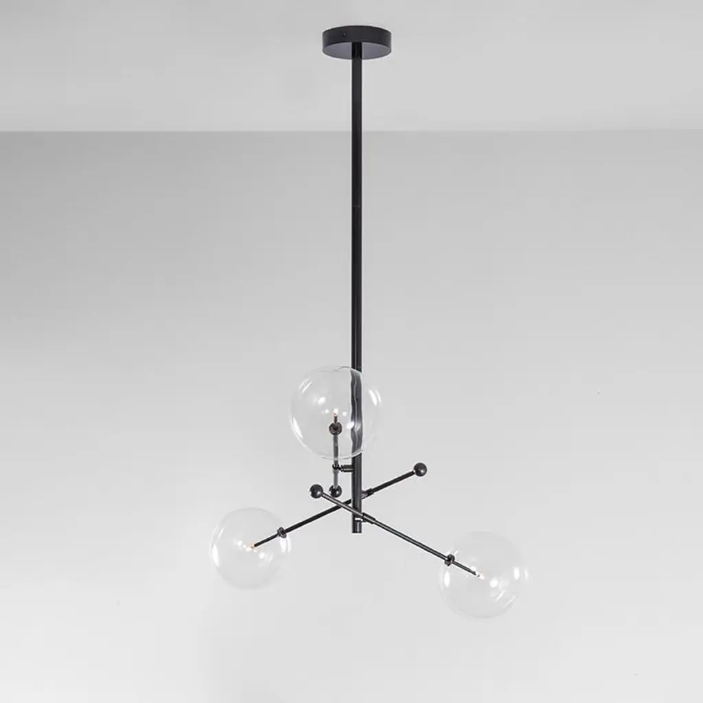 Polished Nickel 3 arm chandelier by Schwung Dimensions: W 97.8 x D 97.8 x H 53 cmMaterials: Solid brass, hand-blown glass globesLamp: 3 LED 1,6WExtension Rods: 1 x 15.24, 1 x 27.9 cm, 1 x 43.2 cmmax wattage 20W / 1.6Wbulb base G4, 12V AClumens 600lmcolor temperature 2700kFinish: Polished Nickel. Also available in finishes: Natural Brass or Black Gunmetal. All our lamps can be wired according to each country. If sold to the USA it will be wired for the USA for instance. Made entirely of solid brass and handblown glass globes. Extension Rods included. Could be dimmable. Schwung is a German word, and loosely defined, means energy or momentumm of a positive manner. Synonyms: verve, zest, panache, momentum.MissionDeveloping lighting fixtures through simple and timeless materials, sustainably; We are committed to creating quality products that last. Beginning with the design we are constantly refining aesthetic and function. Both in the lamps themselves and throughout the manufacturing process we pursue a holistic approach to efficiency, and the reduction of environmental impact.ConceptSchwung is a lighting concept, connecting aesthetic and quality through matter. An exploration of history, forms and function, elegantly fulfilling an essential need of modern life, capturing light. Our pieces play with architecture or create spaces of their own. Founded by Dominique Sente (Belgium) and Rudi Nijssen (Netherlands). What began as a curiosity for objects, a venture in collecting, curating and trading antiques—became a passion to create original designs.ProcessFrom the beginning, Schwung home has striven for cutting-edge and quality lighting, handcrafted in Europe. Emphasising brass and glass, which are not only durable but can be reused indefinitely, our lamps are 98% recyclable. Today the company operates out of an integrated design and manufacturing facility in Poland. This local approach allows us to significantly shorten the product lead time and greatly improve quality standards.All our lamps can be wired according to each country. If sold to the USA it will be wired for the USA for instance.