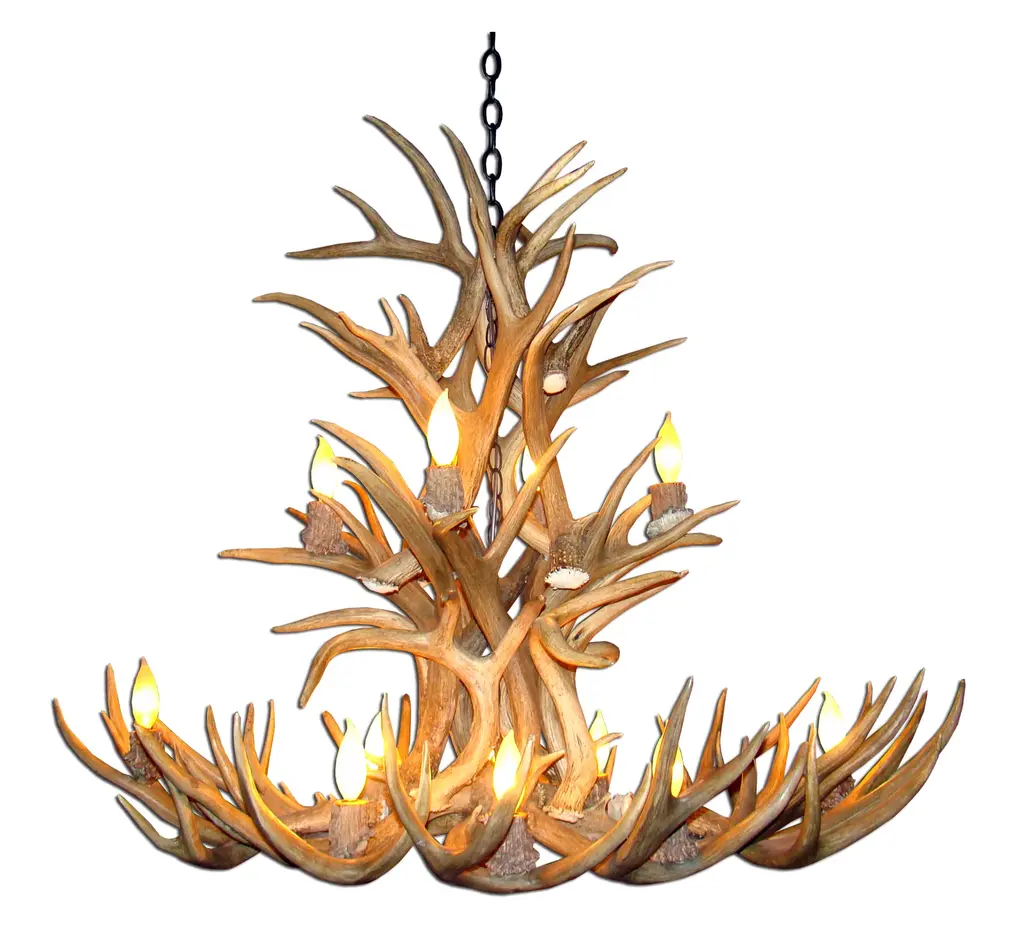 Real Naturally Shed Antler Whitetail / Mule Deer Cascade Chandelier (34-36"D x 35-36"H), 12 light sockets, 6 feet of Rustic Bronze Chain, 12 Parchment Shades, Natural BrownSkillfully assembled by hand and as unique as the natural contours of real animal antlers.Wires are all seamlessly threaded through the antlers, hidden from view.Handmade in North America using top quality naturally shed Real Naturally Shed Antlers.Sockets are made to resemble Real Naturally Shed Antler, each socket rated up to 60 Watts.Comes balanced and ready to hang.Frosted Bent Tip Candelabra Bulbs included.Certified in U.S & Canada (CSA listed to comply with UL 1598)Hardwired