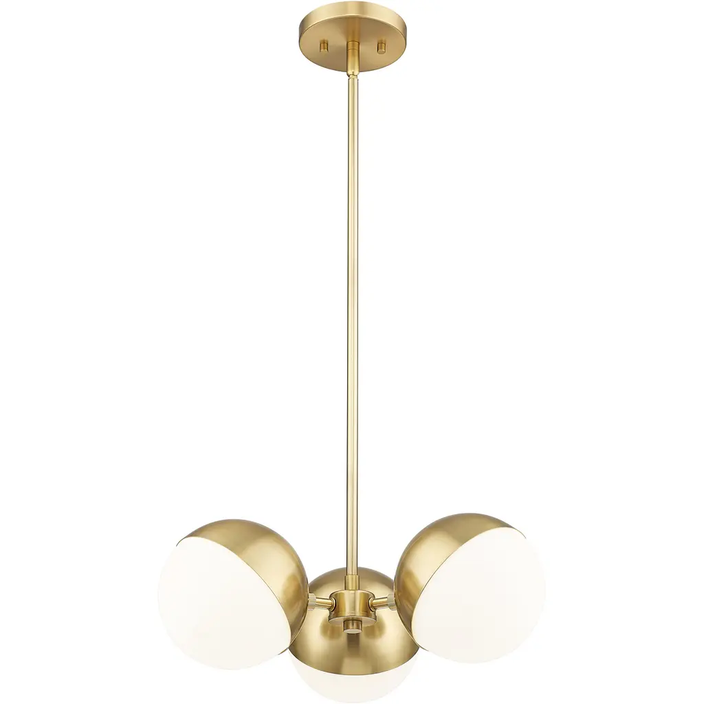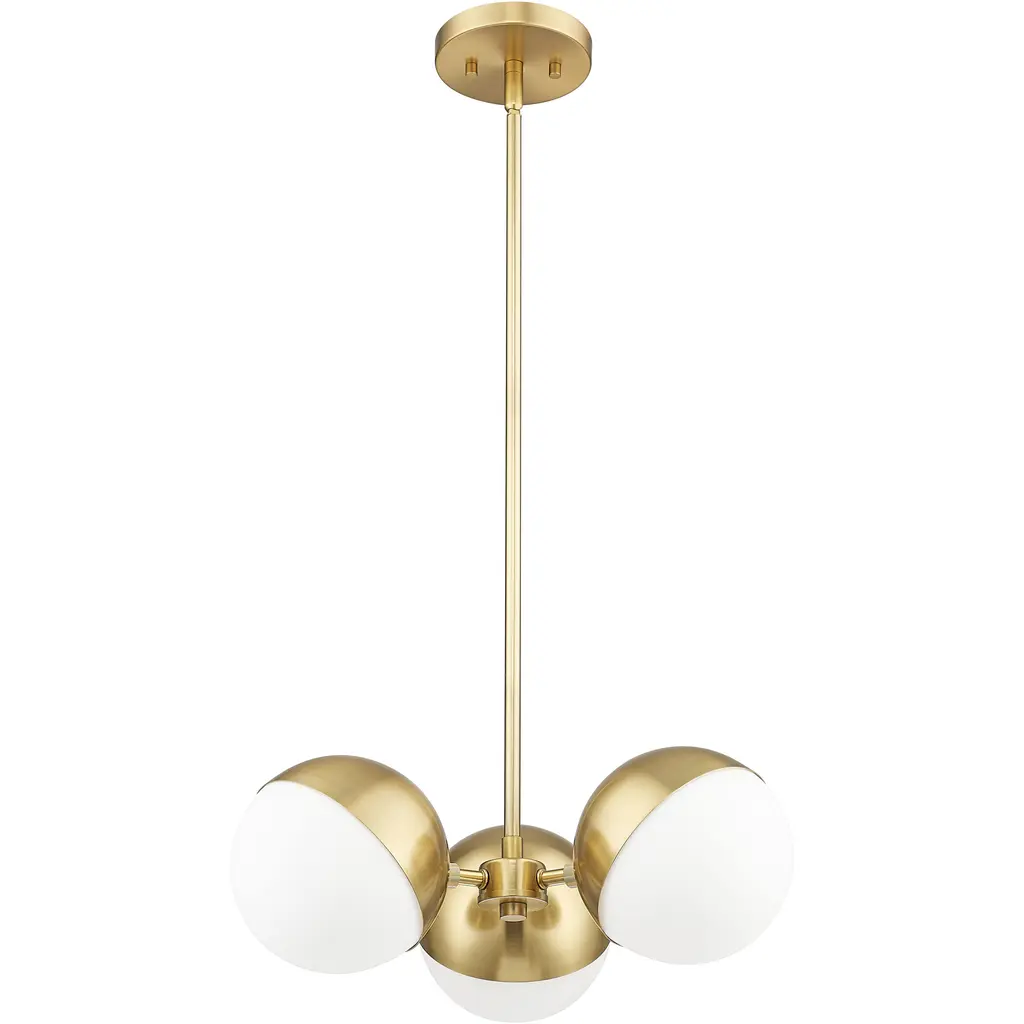 The rich warmth of a modern gold finish highlights this mid-century inspired three-light chandelier. Its vintage character brings eye-catching style, while three orb lights cast multi-directional illumination, perfect for a breakfast nook or cozy seating group. The chandelier features orb shades, each with opal glass and a moveable metal shield that allows for a custom look and precision illumination.