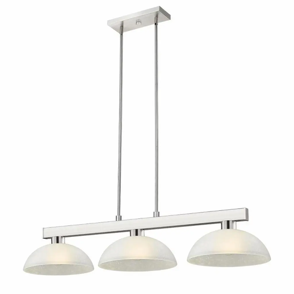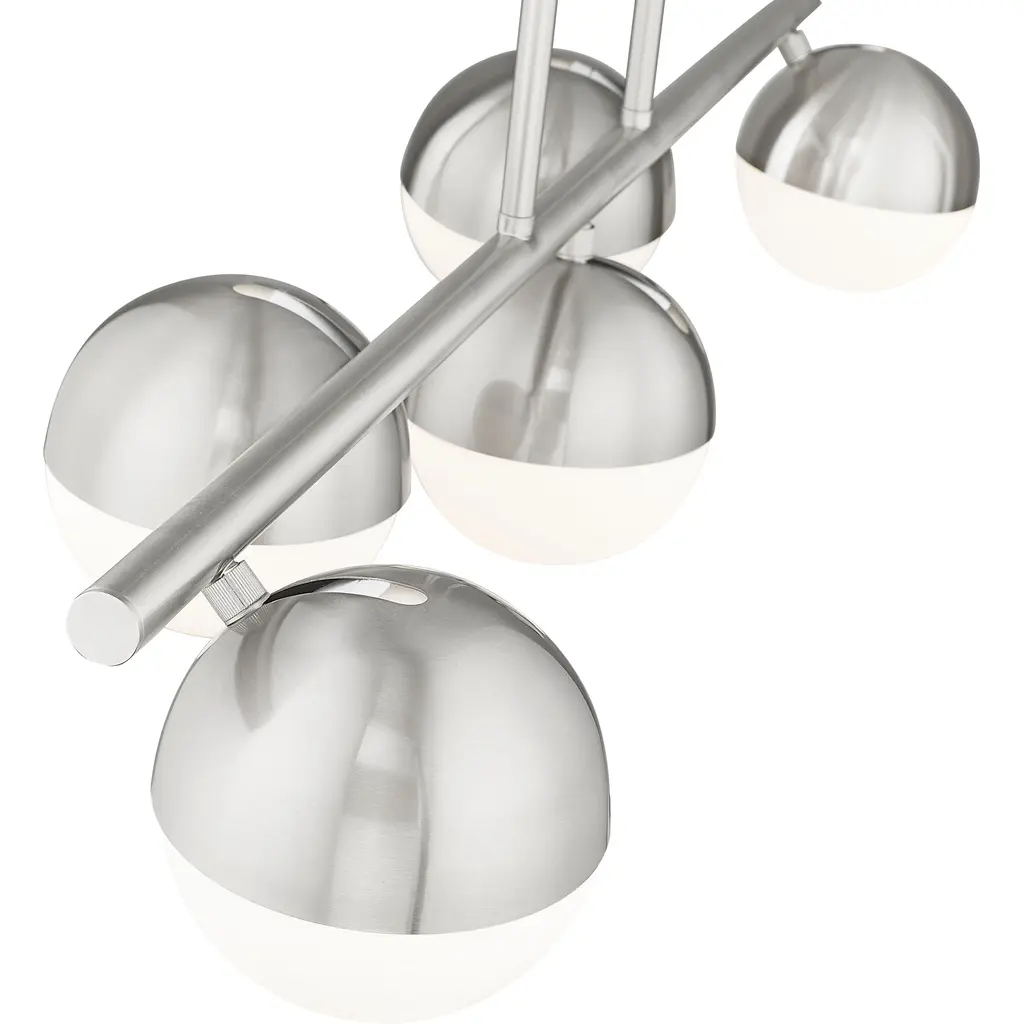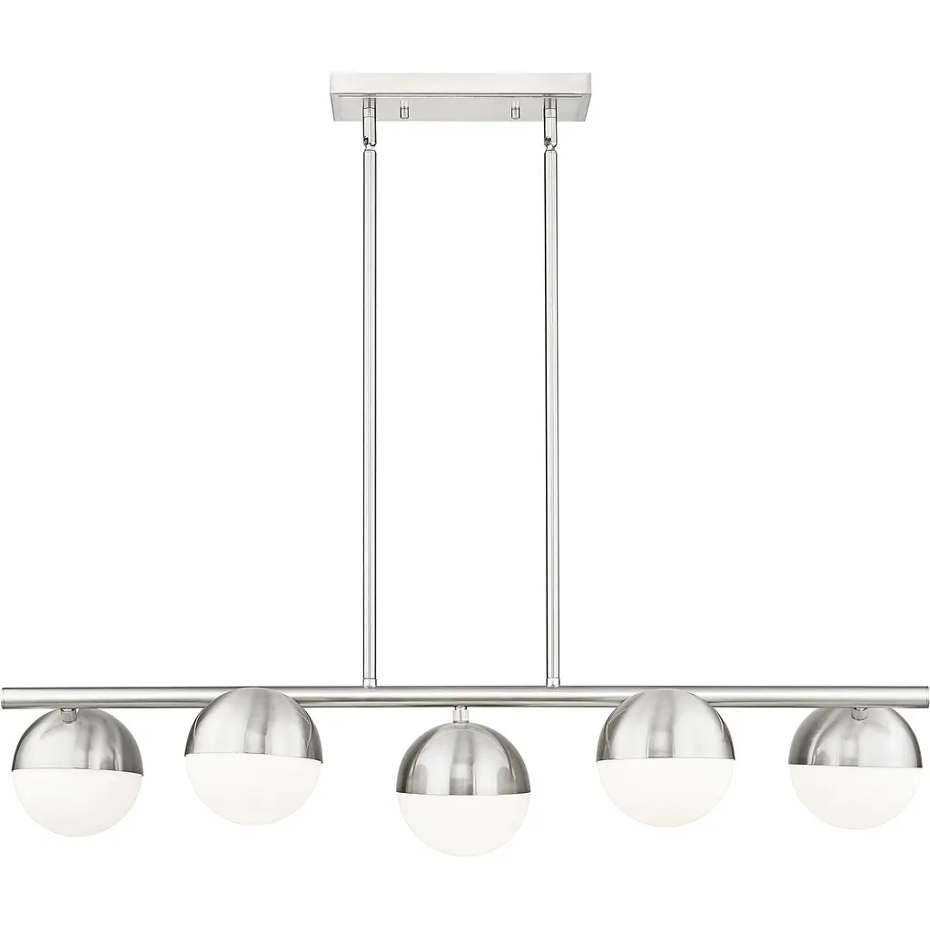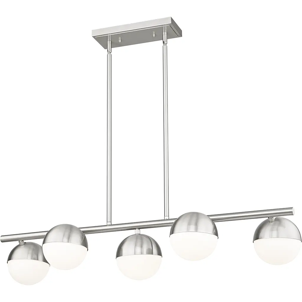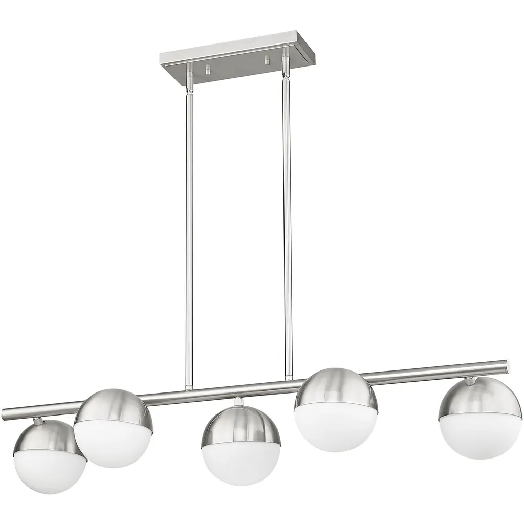 Offset orbs create a compelling linear silhouette for this modern five-light island chandelier. Perfect for your kitchen, it boasts a clean-lined profile with a sleek brushed nickel finish. Its five lights are surrounded with opal glass orbs and boast metal shields for a chic, custom look and feel.