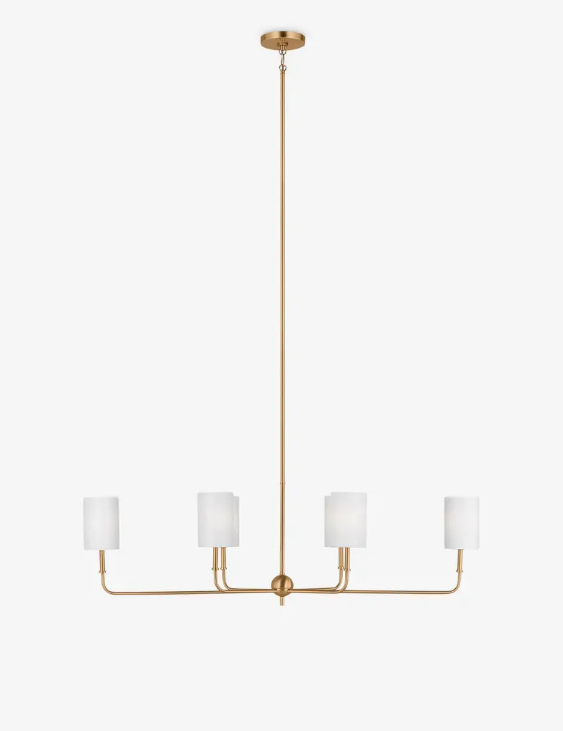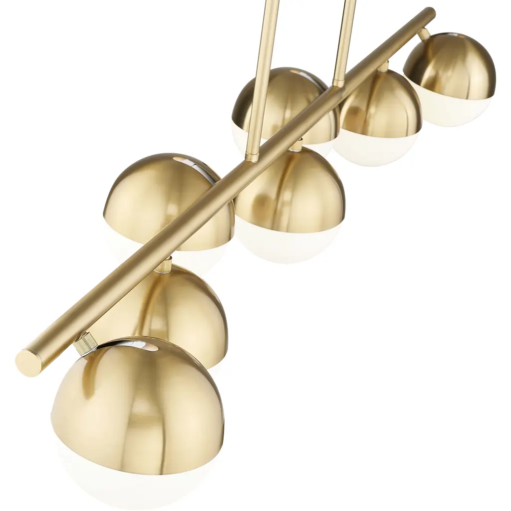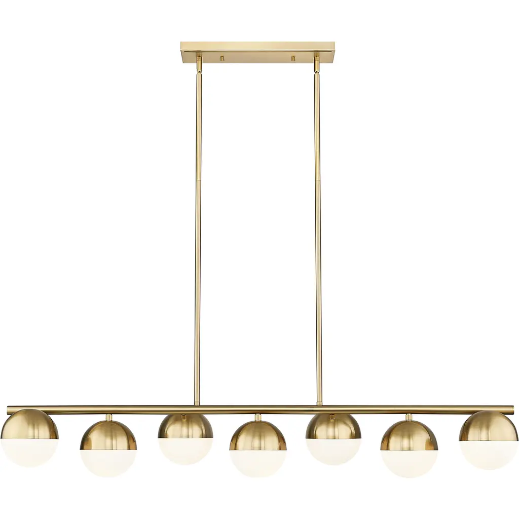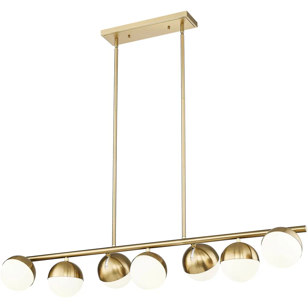 Infuse your kitchen or dining room with the exceptional warmth of this modern seven-light linear chandelier. Its striking silhouette features alternating offset orb lights, complete with modern gold finish shields and opal glass shades that create soft, inviting ambiance. Its straight-lined frame silhouette and round tube arm are perfect finishing touches.
