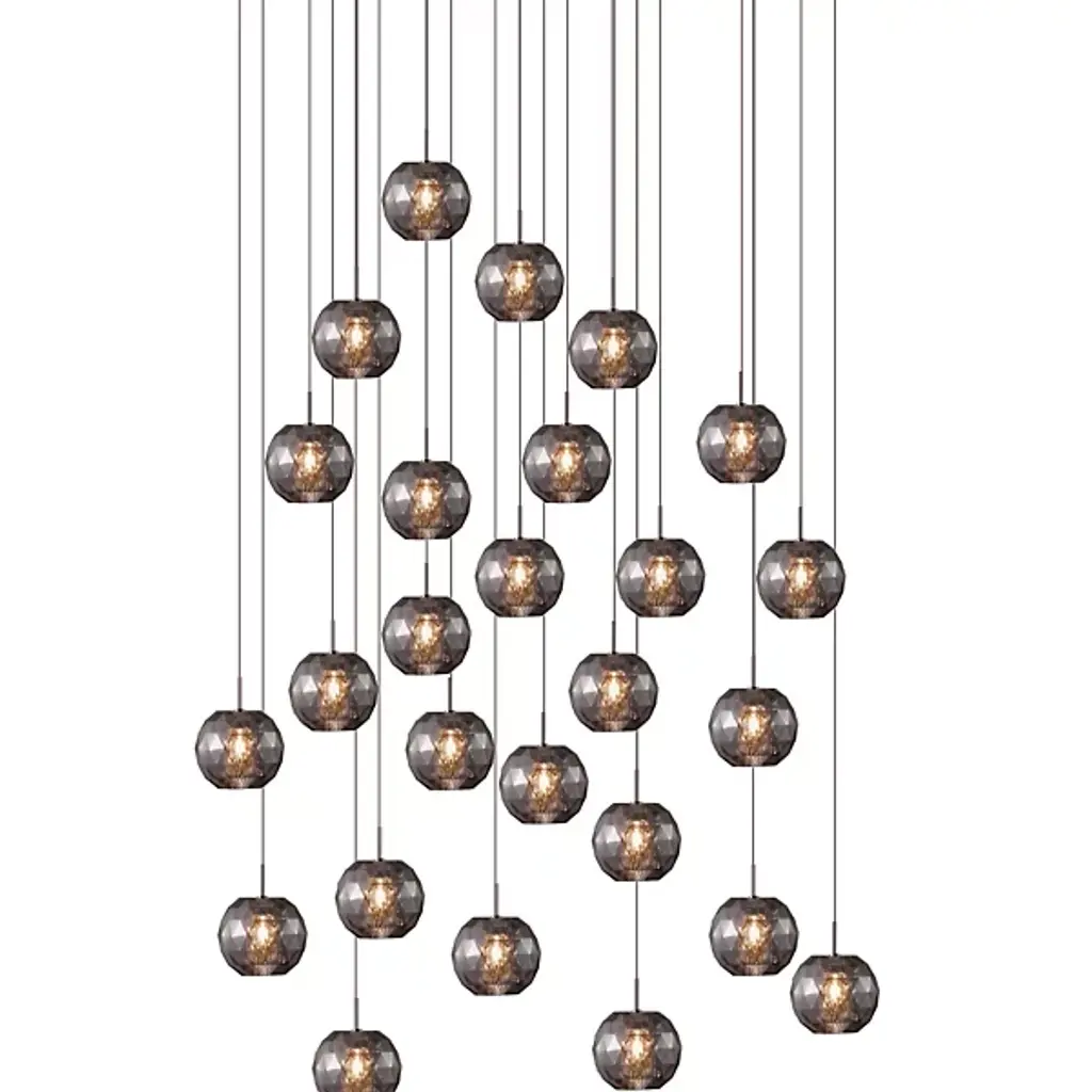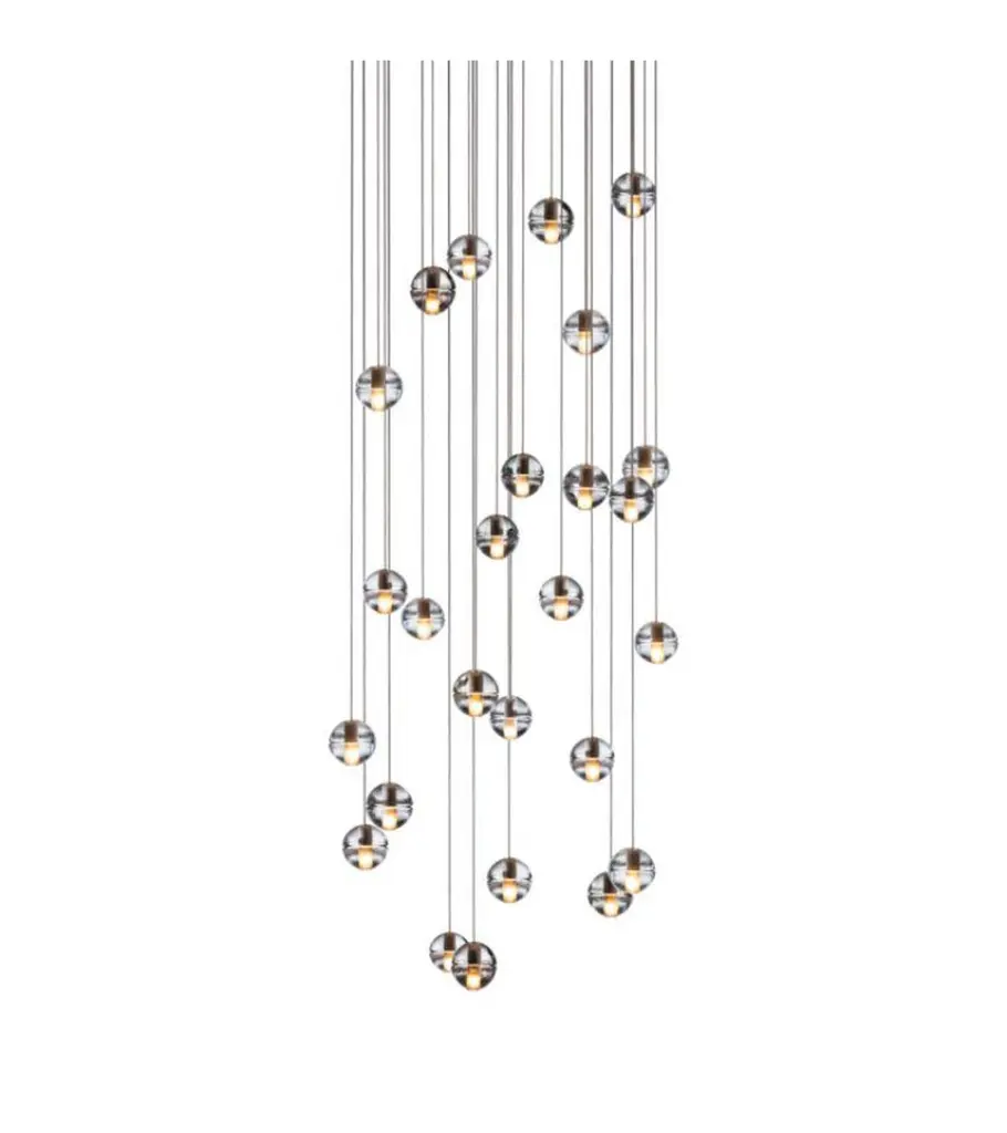 Rectangular 14.26 chandelier lamp by BocciDimensions: D 33.5 x W 100 x H 300 cm Materials: Brushed nickel, Cast glass, blown borosilicate glass, braided metal coaxial cable, electrical components, white powder-coated canopy.Available in rectangular, or square canopy. Sold individually and in different sizes. Also available in 350 cm height. All our lamps can be wired according to each country. If sold to the USA it will be wired for the USA for instance.14.26 is a low-voltage arrangement of 26 articulated, cast glass spheres with cylindrical voids, each housing either a 10-watt xenon or 1.5-watt LED lamp. 14.26 uses headphone jack connections, which allow the pendants to be “plugged into” the canopy for fast and easy installation. Pendant lengths are pre-set during production and are not site adjustable. There are three standard canopy options. All options have a white, powder-coated finish. Non-adjustable height. Bocci is a design and manufacturing company based in Vancouver and Berlin. Founded in 2005 under the creative directorship of Omer Arbel, Bocci is committed to fostering a lateral and open-ended relationship between creative direction and craft. The company launched with one lighting design, ‘14’, which became an instant classic and remains a design staple and bestseller. Bocci’s growing portfolio of sculptural lighting is developed, engineered, and fabricated in-house, through an infrastructure calibrated to provide full control over technique, quality, and scale.In 2015, Bocci transformed a historic Berlin building into a showroom and archive. ‘Bocci 79’ inhabited a 2,200 m² / 23,600 sq ft former courthouse, constructed in 1896, and showcased over a decade of works by Omer Arbel, ranging from pieces in progress, prototypes, and ideas, to the complete range of catalog pieces developed for Bocci.Bocci 79 closed in June 2020 and we are currently working on our new, permanent Berlin showroom which will open soon.