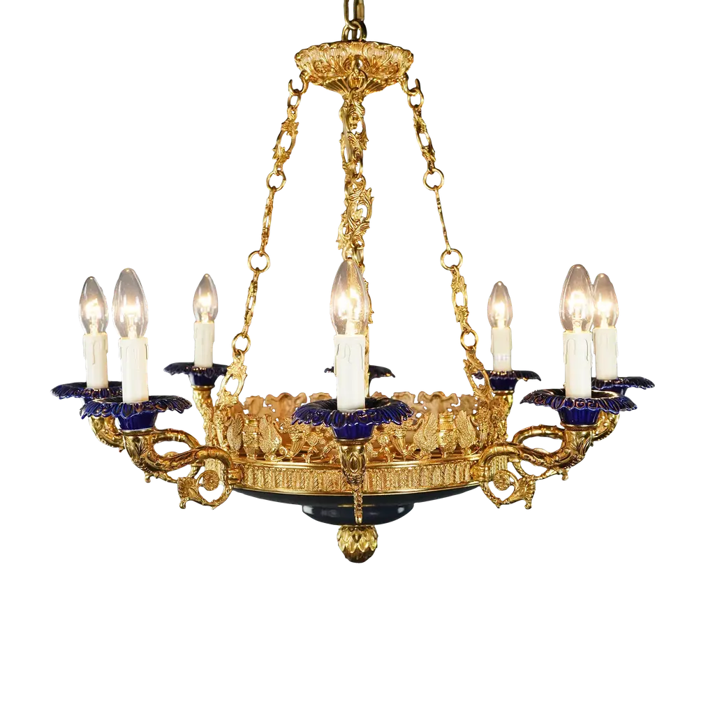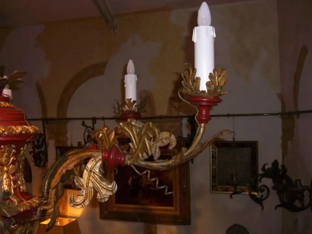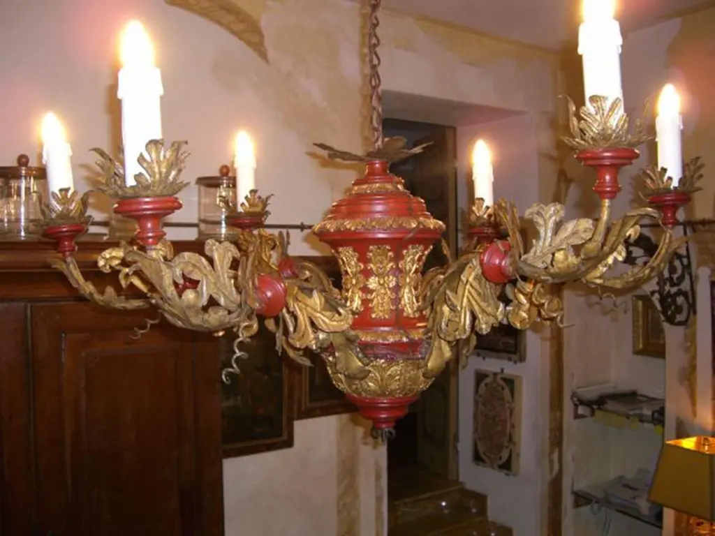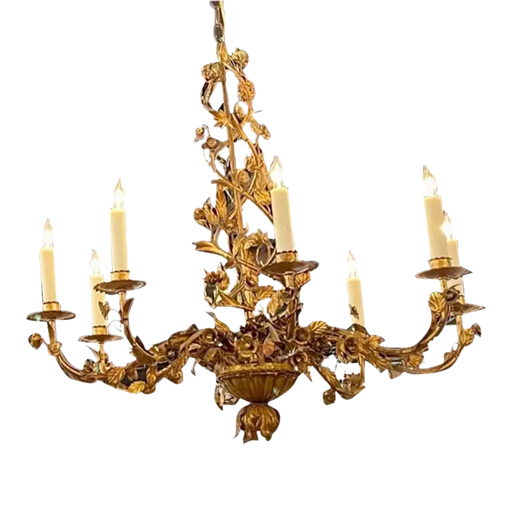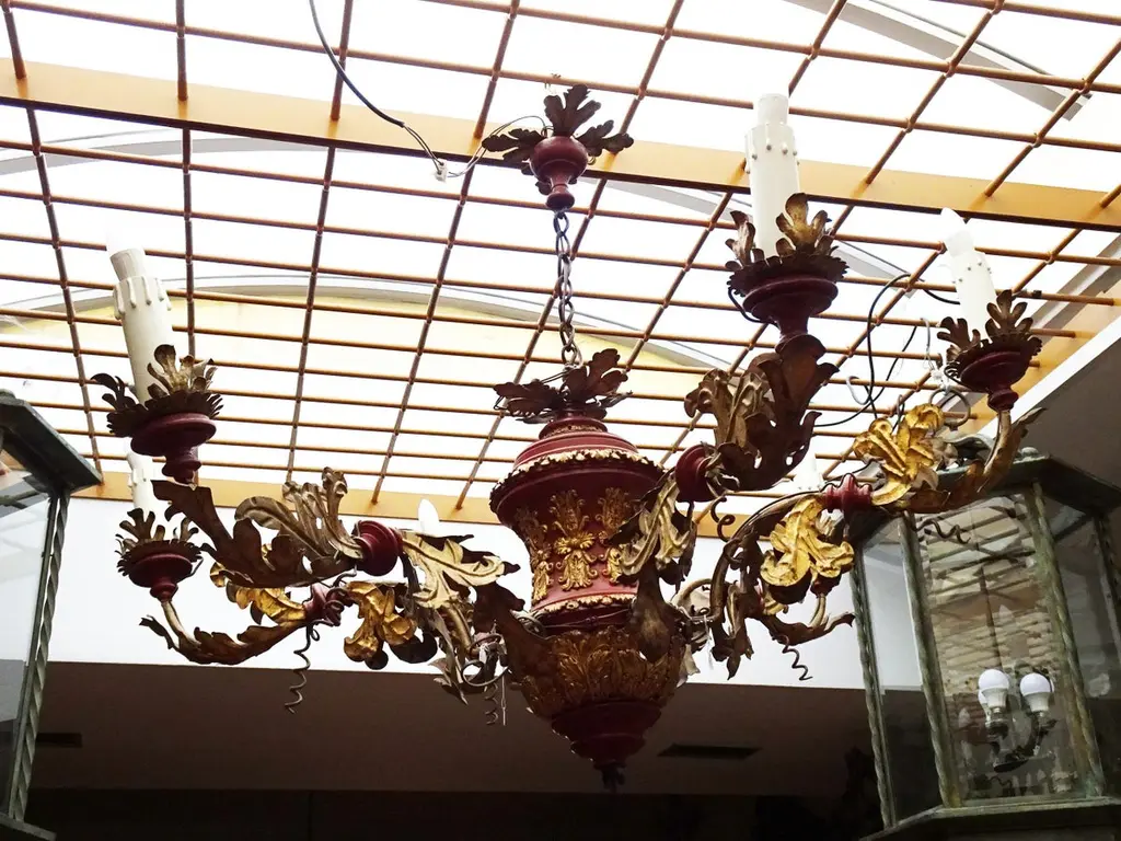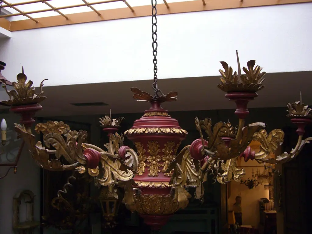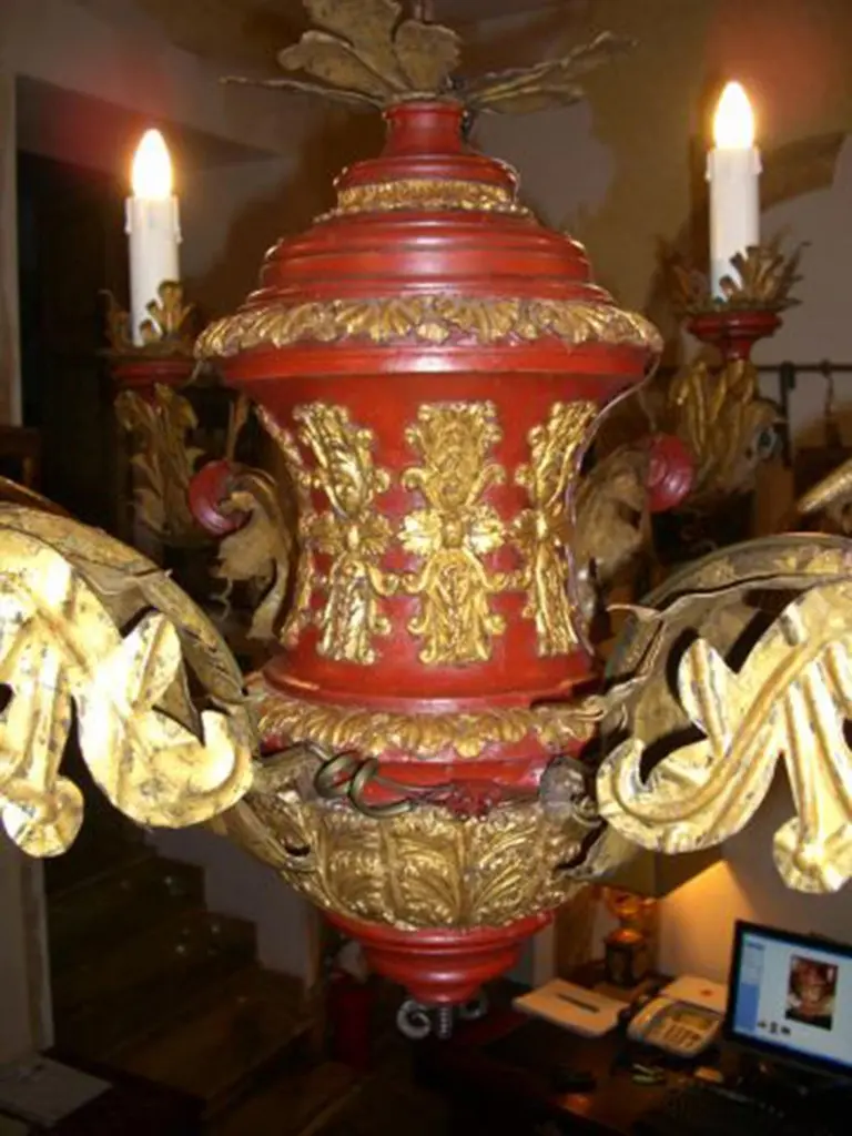 The chandelier consists of a red wooden stem with relief gilded acanthus leaf carvings and six iron and sheet metal arms with gilded decorations, in the Baroque style. A derivation from the Roman or southern Italian area and a date between the 17th and 18th centuries are assumed.
