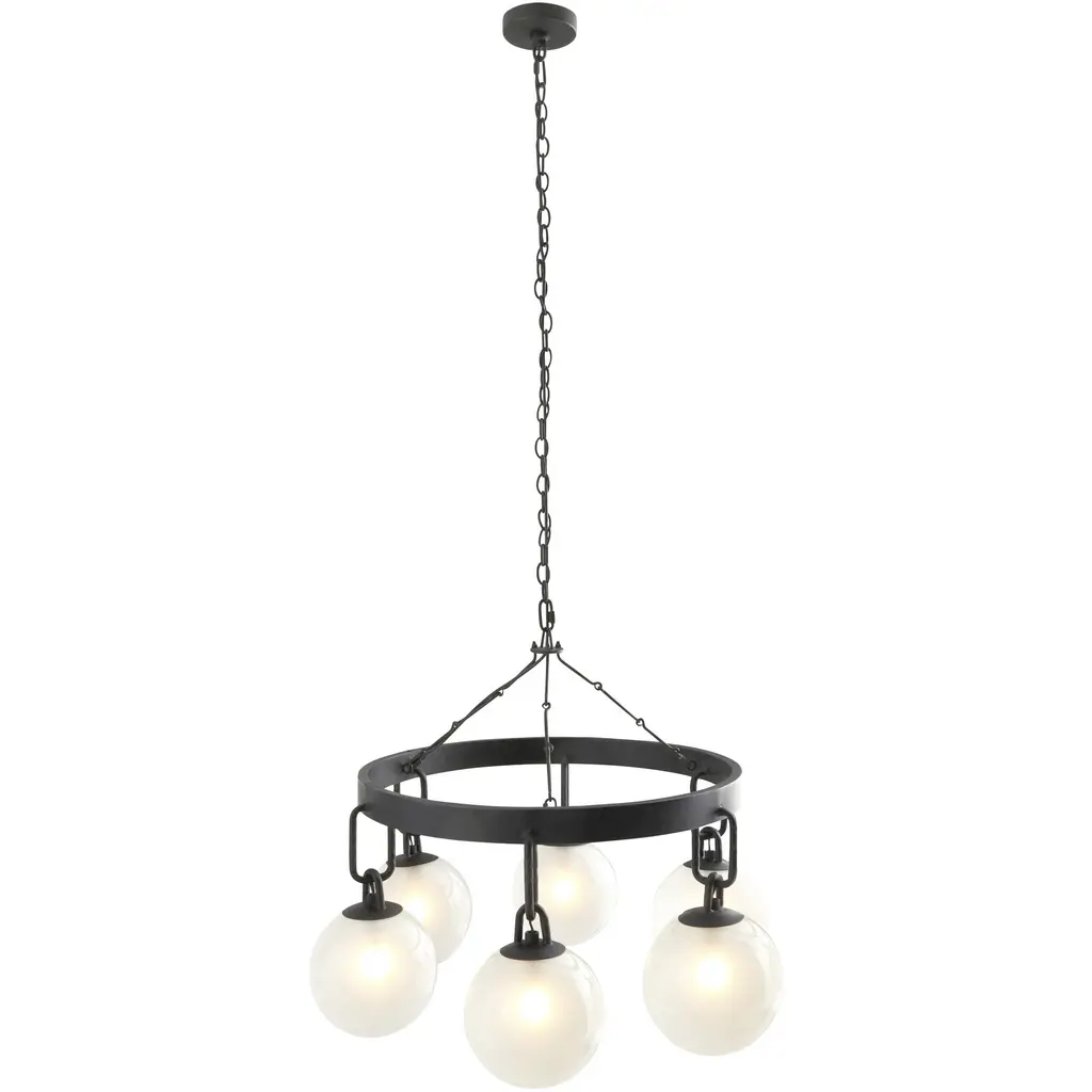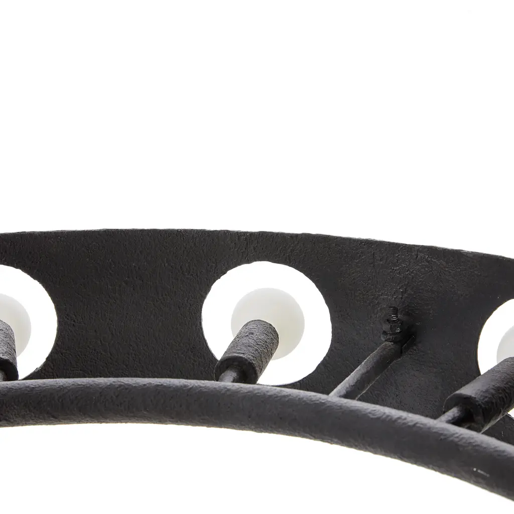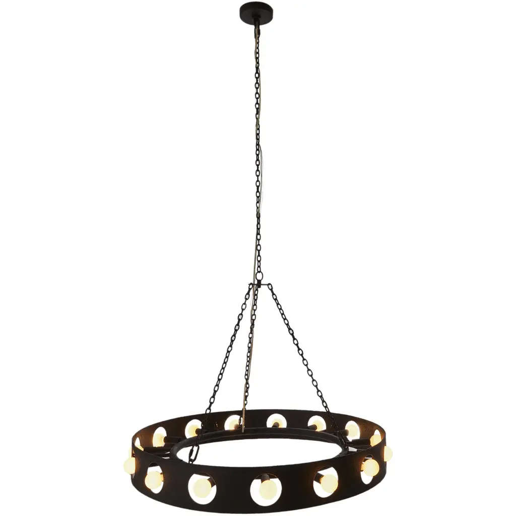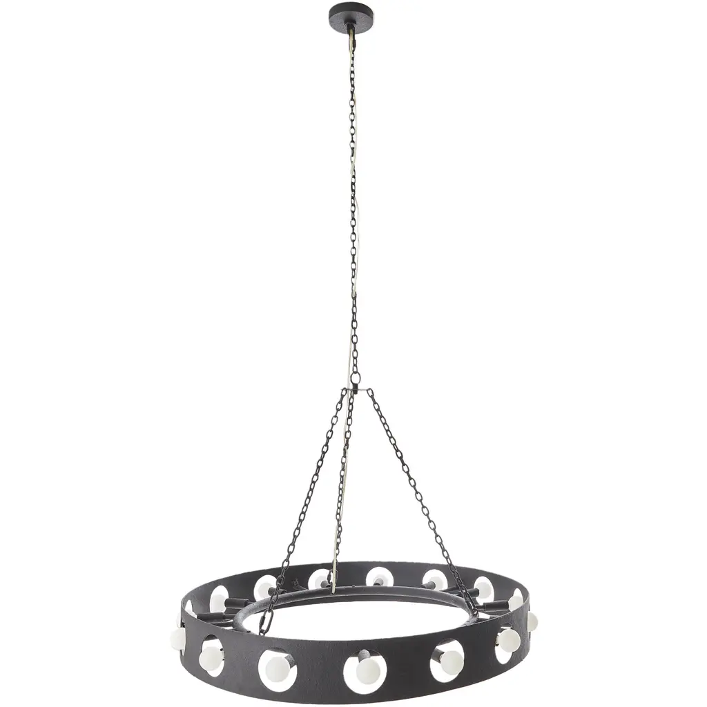 Taking a cue from brutalist design, the Redondo chandelier is interpreted in a cuffed drum silhouette with punchwork encircling the perimeter, that allows the bulbs to project slightly through the frame. The piece is created in textured matte charcoal iron and features a triangular chain-link suspension system. Finish will vary.