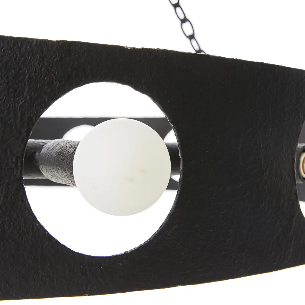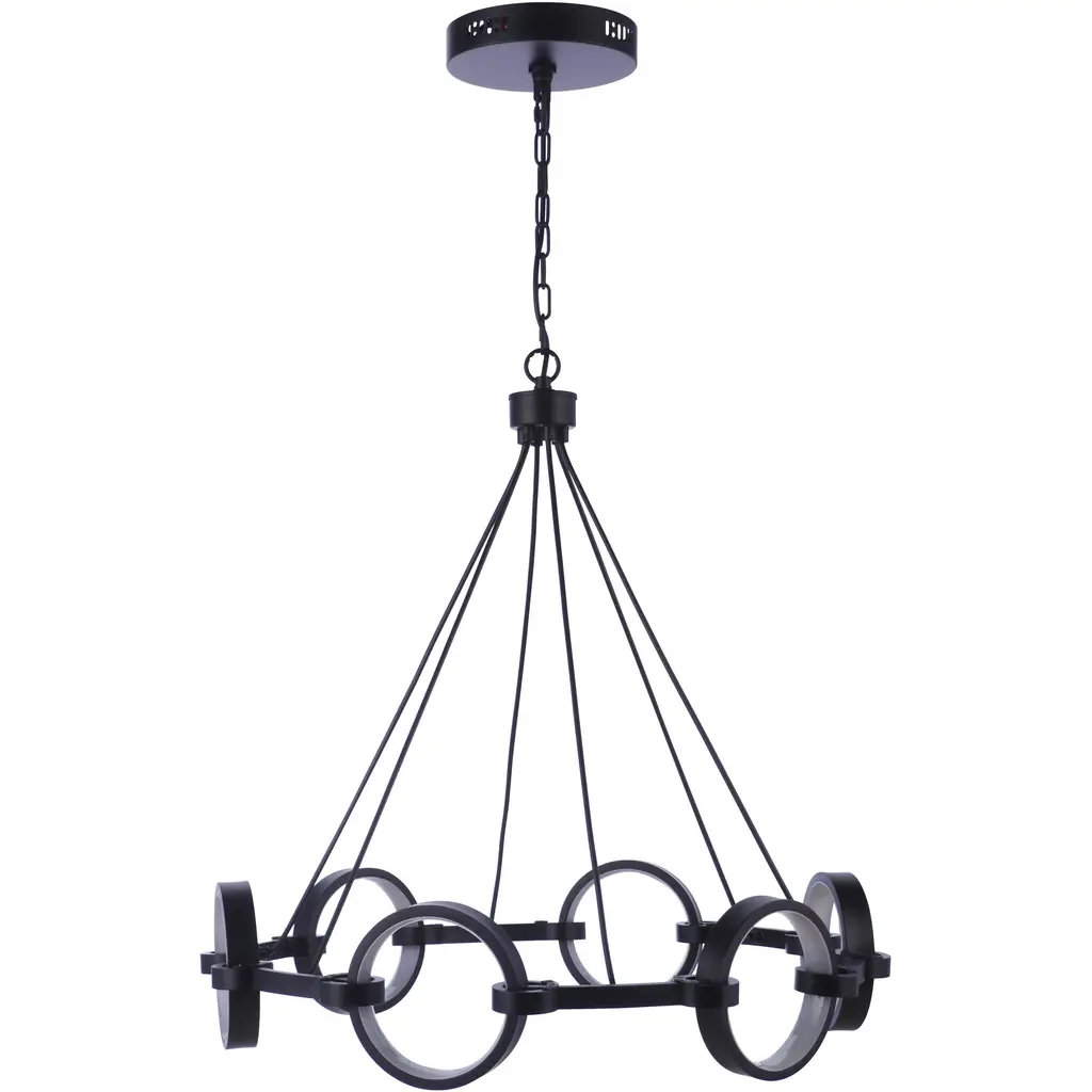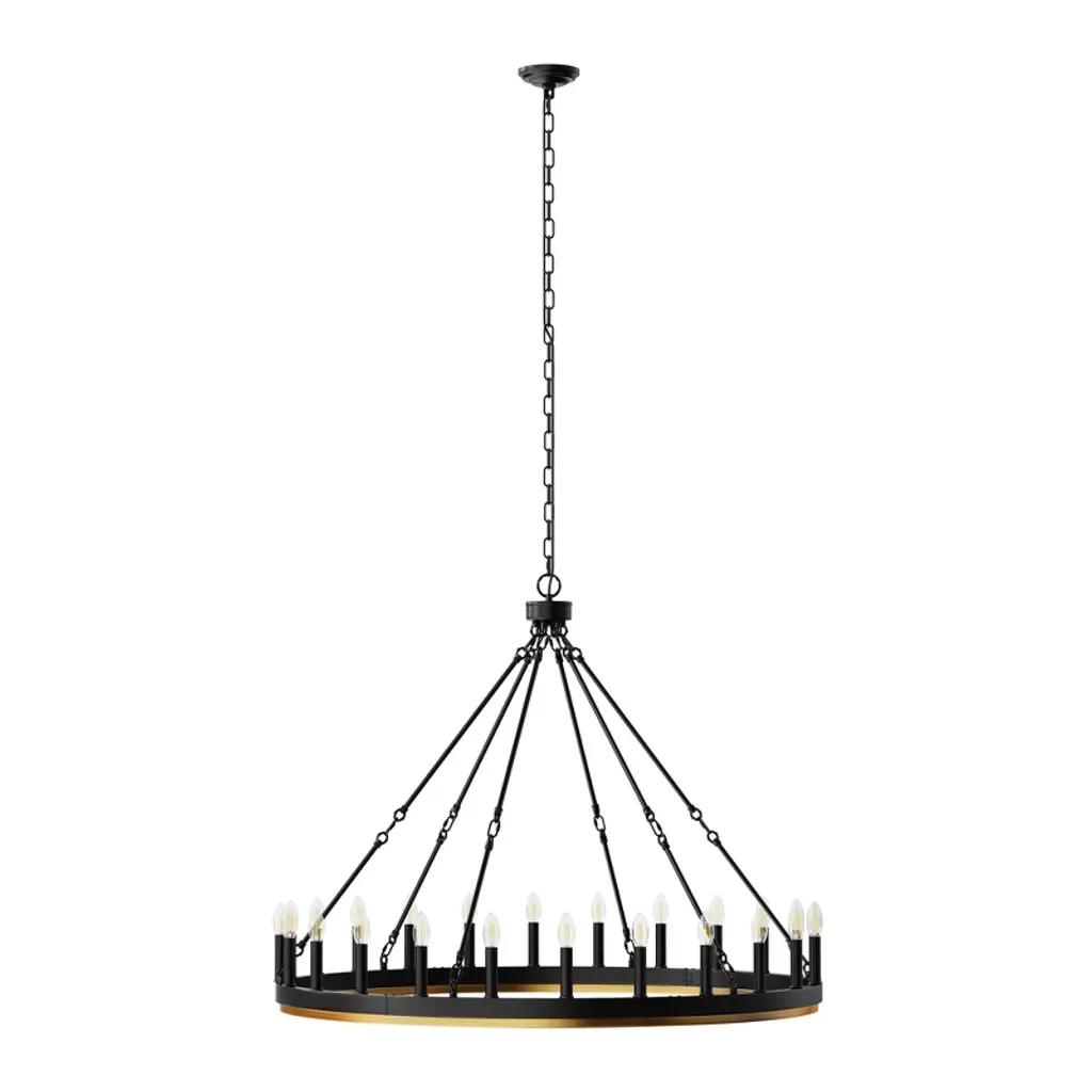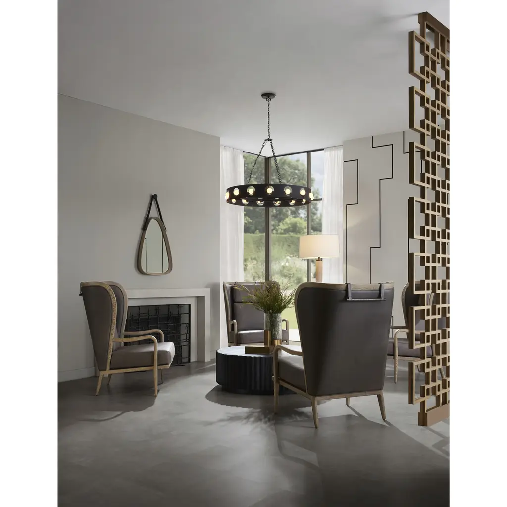 Taking a cue from brutalist design, the Redondo chandelier is interpreted in a cuffed drum silhouette with punchwork encircling the perimeter, that allows the bulbs to project slightly through the frame. The piece is created in textured matte charcoal iron and features a triangular chain-link suspension system. Finish will vary.