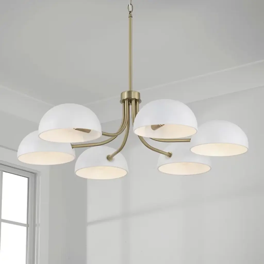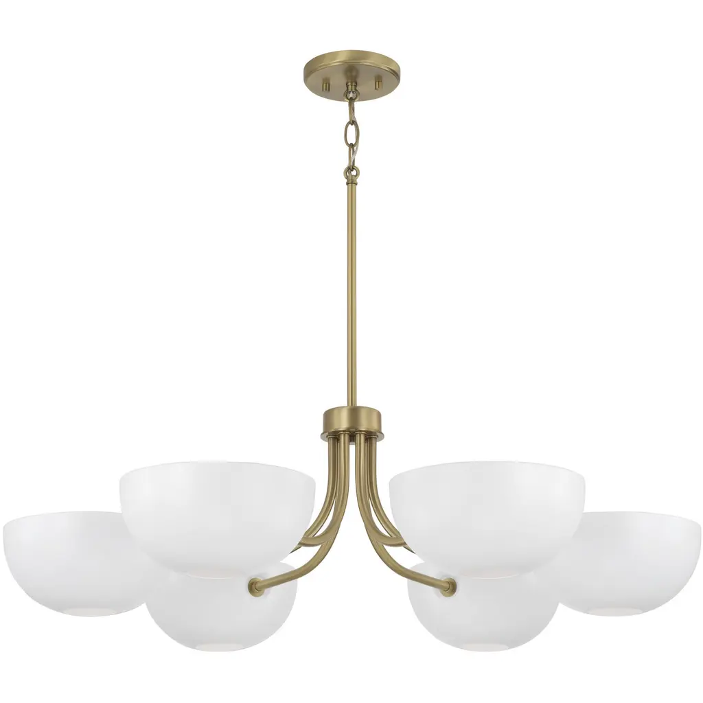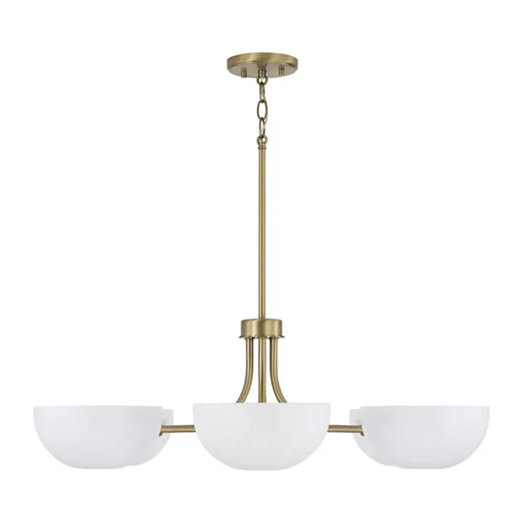 Introducing the Reece Chandelier from Capital Lighting, blending a classic aesthetic with a hint of retro flair. The smooth finish, paired with Aged Brass details, creates a timeless yet stylish design. The rounded metal shades are adjustable, which allows you to cast the perfect ambient glow by turning them up or down. Illuminate your space with a touch of nostalgic charm and modern versatility, courtesy of the Reece Chandelier.