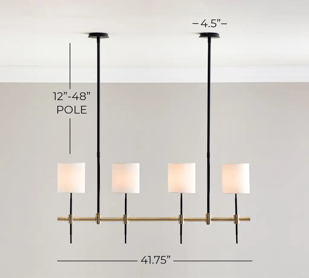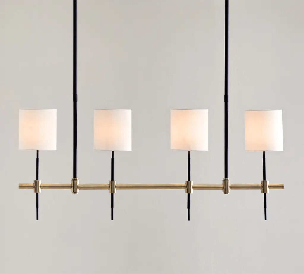 With a level of detail achieved only through high-end design and craftsmanship, our Reese Lighting Collection is clean-lined and sophisticated, defined by a masterful mix of rich finishes and materials that feel balanced and refined. An elegant interplay of vertical lines, the chandelier features four lights punctuating a brass- and bronze-finished steel rod, each topped with a linen drum shade for a soft and inviting glow.