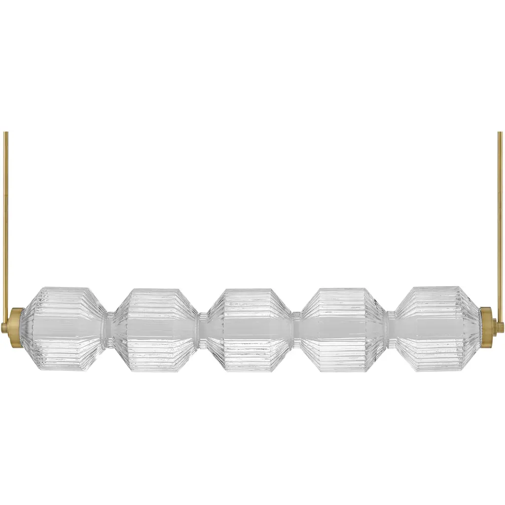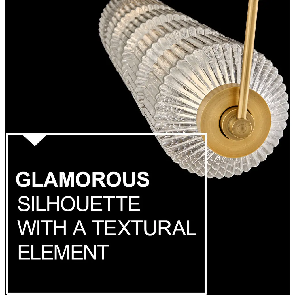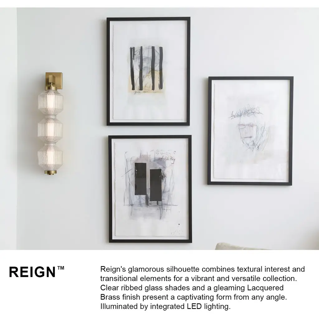 Reign's glamorous silhouette combines textural interest and transitional elements for a vibrant and versatile collection. Clear ribbed glass shades and a gleaming Lacquered Brass finish present a captivating form from any angle. Illuminated by integrated LED lighting.