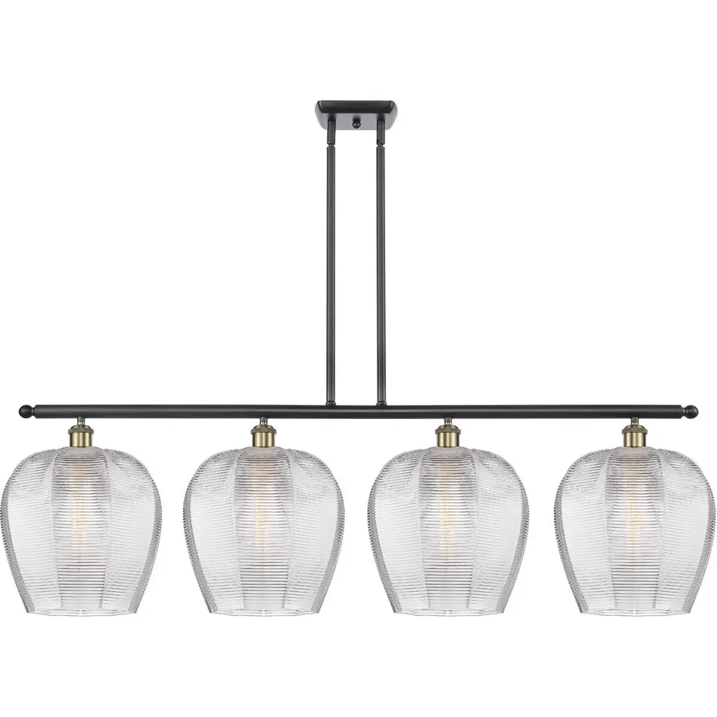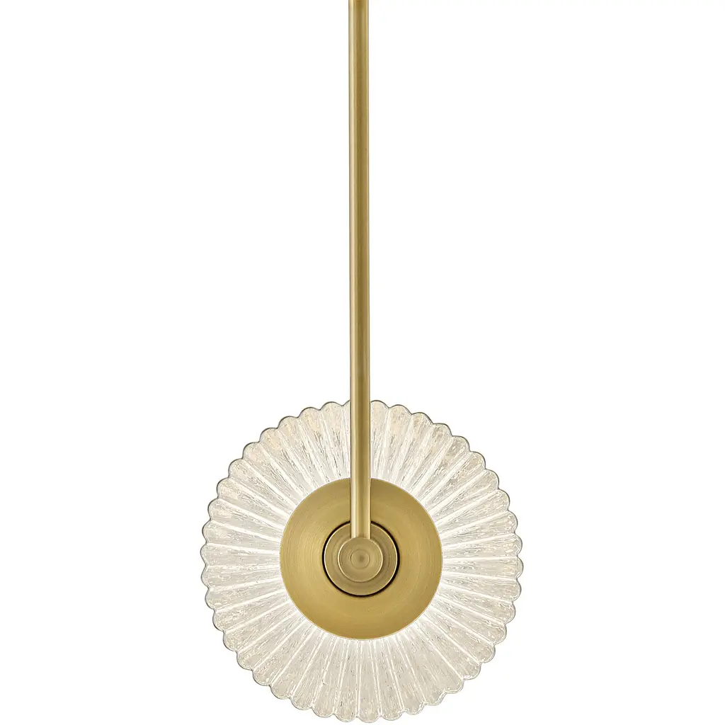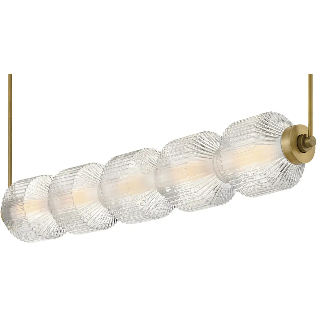 Reign's glamorous silhouette combines textural interest and transitional elements for a vibrant and versatile collection. Clear ribbed glass shades and a gleaming Lacquered Brass finish present a captivating form from any angle. Illuminated by integrated LED lighting.
