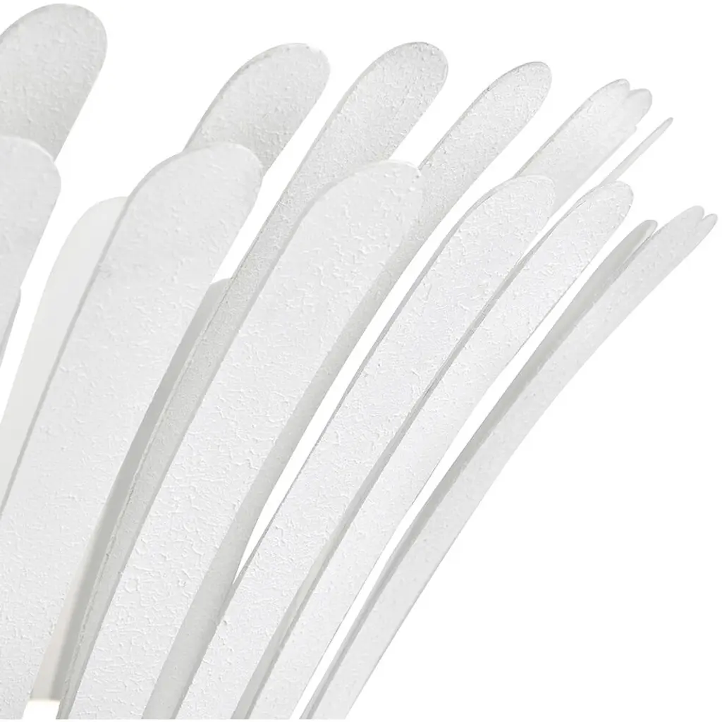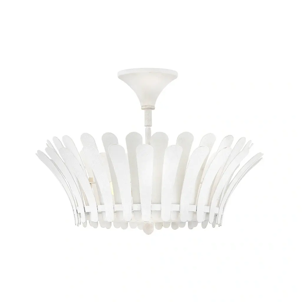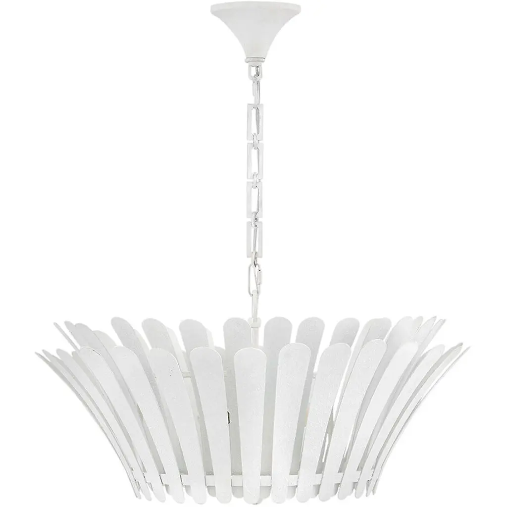 Remarkably dramatic, Reinas repeating flared fronds surround its central drum and etched white glass diffuser, making a refined yet striking statement within any space. A Distressed Brass finish creates a classic look while the white Textured Plaster finish provides a more modern feel.