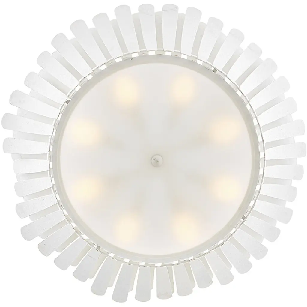 Remarkably dramatic, Reinas repeating flared fronds surround its central drum and etched white glass diffuser, making a refined yet striking statement within any space. A Distressed Brass finish creates a classic look while the white Textured Plaster finish provides a more modern feel.