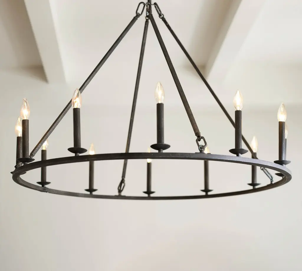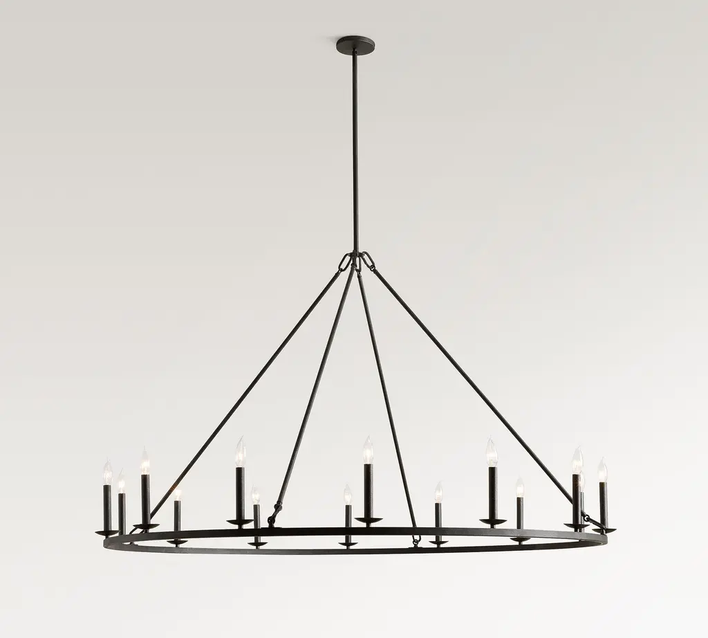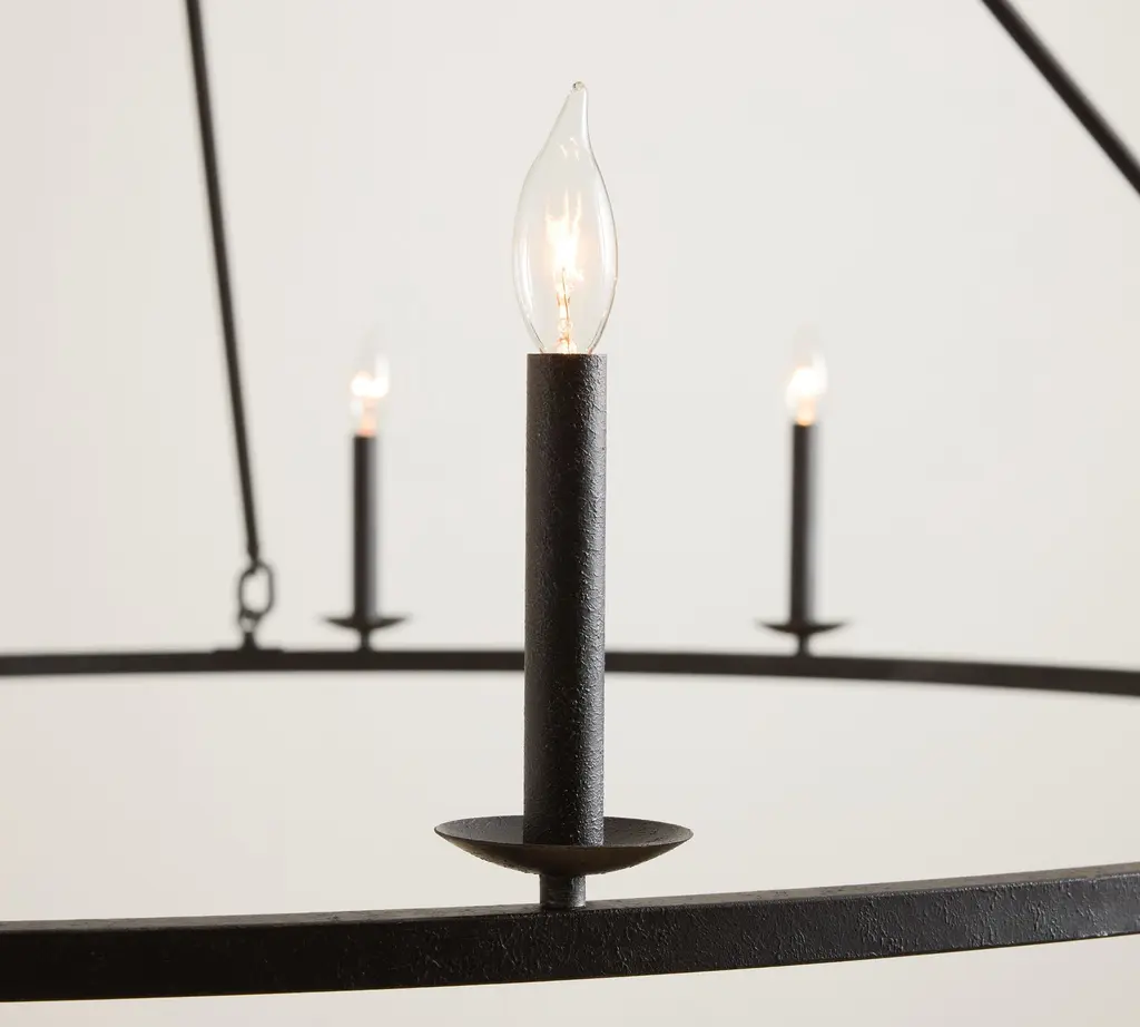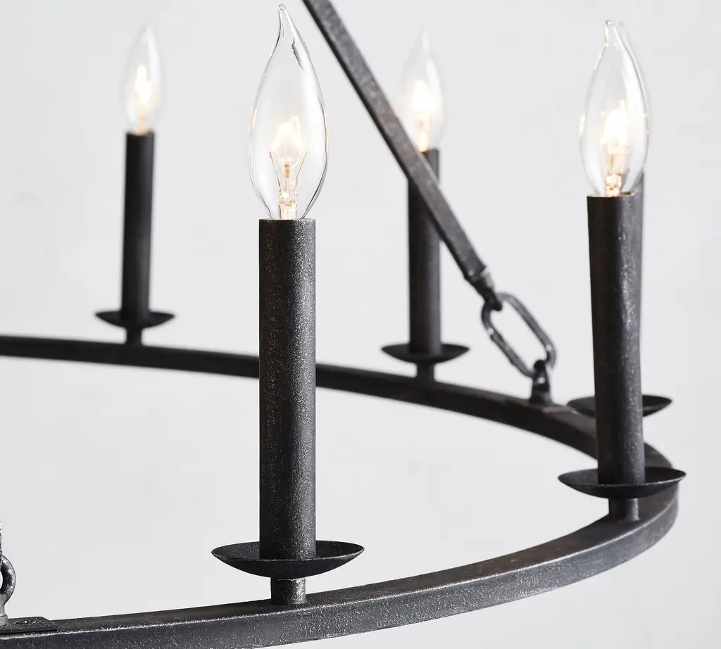 Inspired by candelabra chandeliers once common in the great rooms and dining halls of America's historic lodges, the Remington Lighting Collection makes a grand statement in the modern home. This chandelier's forged ring is held in place by distinctive rods and links, and the candle-style lights provide a warm, inviting glow.