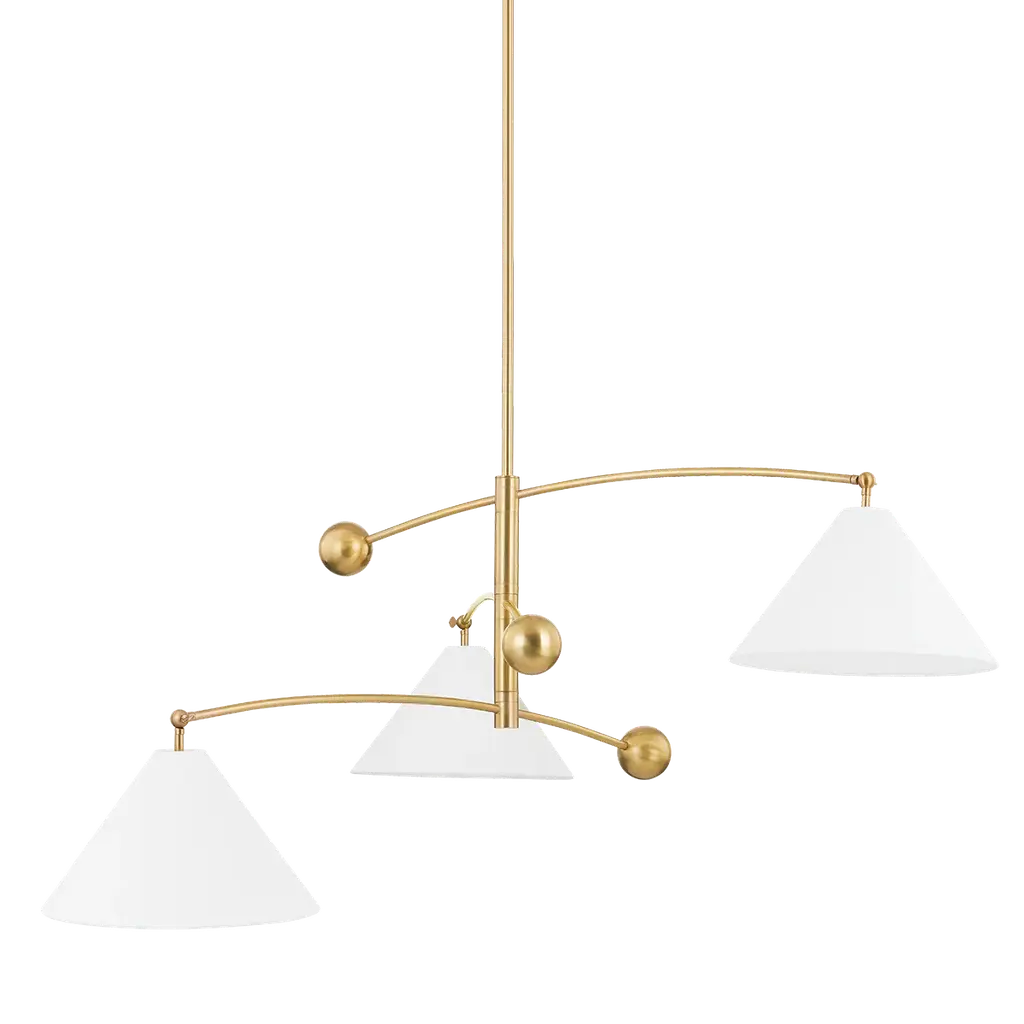 Airy, whimsical, and gorgeously abstract, the Remy Chandelier from Alora Mood offers a bright-lighting design. This modern piece complements the open dining or living space. Hanging with a slender downrod, a trio of slender arms reaches out and down to strong lamping held inside conical steel shades. Each lamp extends from within the shade with opal glass diffuser that mellows direct glare. Each lamp produces a warmly cast downlight.