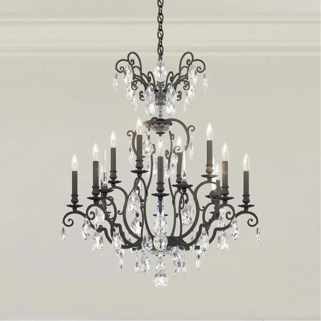 Renaissance Nouveau: Complex, bold, and richly detailed, Renaissance Nouveau is inspired by the glorious opulence of baroque chandeliers and is an homage to the 17th century court of Louis XIV of France. Its open laser-cut frame features lyre patterns and bouquet-shaped bobeches topped with Bohemian crystal spikes. With large Heritage Crystal pendants creating remarkable sparkle, Renaissance Nouveau provides a magnificent focal point for an entry hall or formal dining room. It is also particularly impactful as a traditional contrast piece in a contemporary home.