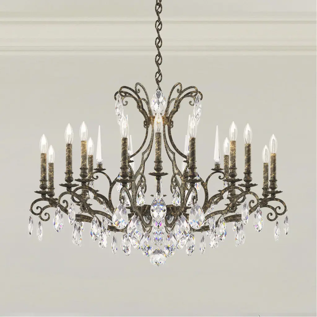 Renaissance Nouveau: Complex, bold, and richly detailed, Renaissance Nouveau is inspired by the glorious opulence of baroque chandeliers and is an homage to the 17th century court of Louis XIV of France. Its open laser-cut frame features lyre patterns and bouquet-shaped bobeches topped with Bohemian crystal spikes. With large Heritage Crystal pendants creating remarkable sparkle, Renaissance Nouveau provides a magnificent focal point for an entry hall or formal dining room. It is also particularly impactful as a traditional contrast piece in a contemporary home.