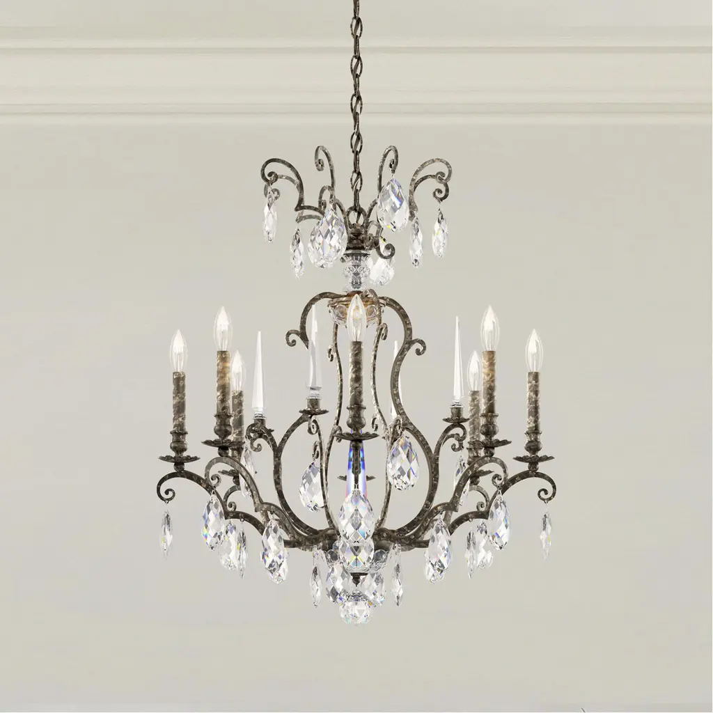 Renaissance Nouveau: Complex, bold, and richly detailed, Renaissance Nouveau is inspired by the glorious opulence of baroque chandeliers and is an homage to the 17th century court of Louis XIV of France. Its open laser-cut frame features lyre patterns and bouquet-shaped bobeches topped with Bohemian crystal spikes. With large Heritage Crystal pendants creating remarkable sparkle, Renaissance Nouveau provides a magnificent focal point for an entry hall or formal dining room. It is also particularly impactful as a traditional contrast piece in a contemporary home.