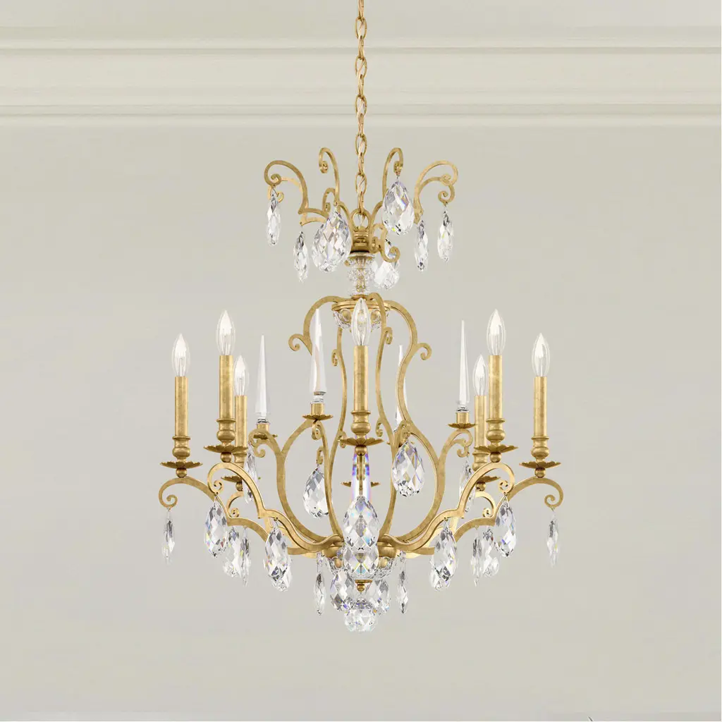 Renaissance Nouveau: Complex, bold, and richly detailed, Renaissance Nouveau is inspired by the glorious opulence of baroque chandeliers and is an homage to the 17th century court of Louis XIV of France. Its open laser-cut frame features lyre patterns and bouquet-shaped bobeches topped with Bohemian crystal spikes. With large Heritage Crystal pendants creating remarkable sparkle, Renaissance Nouveau provides a magnificent focal point for an entry hall or formal dining room. It is also particularly impactful as a traditional contrast piece in a contemporary home.