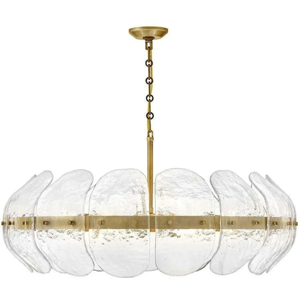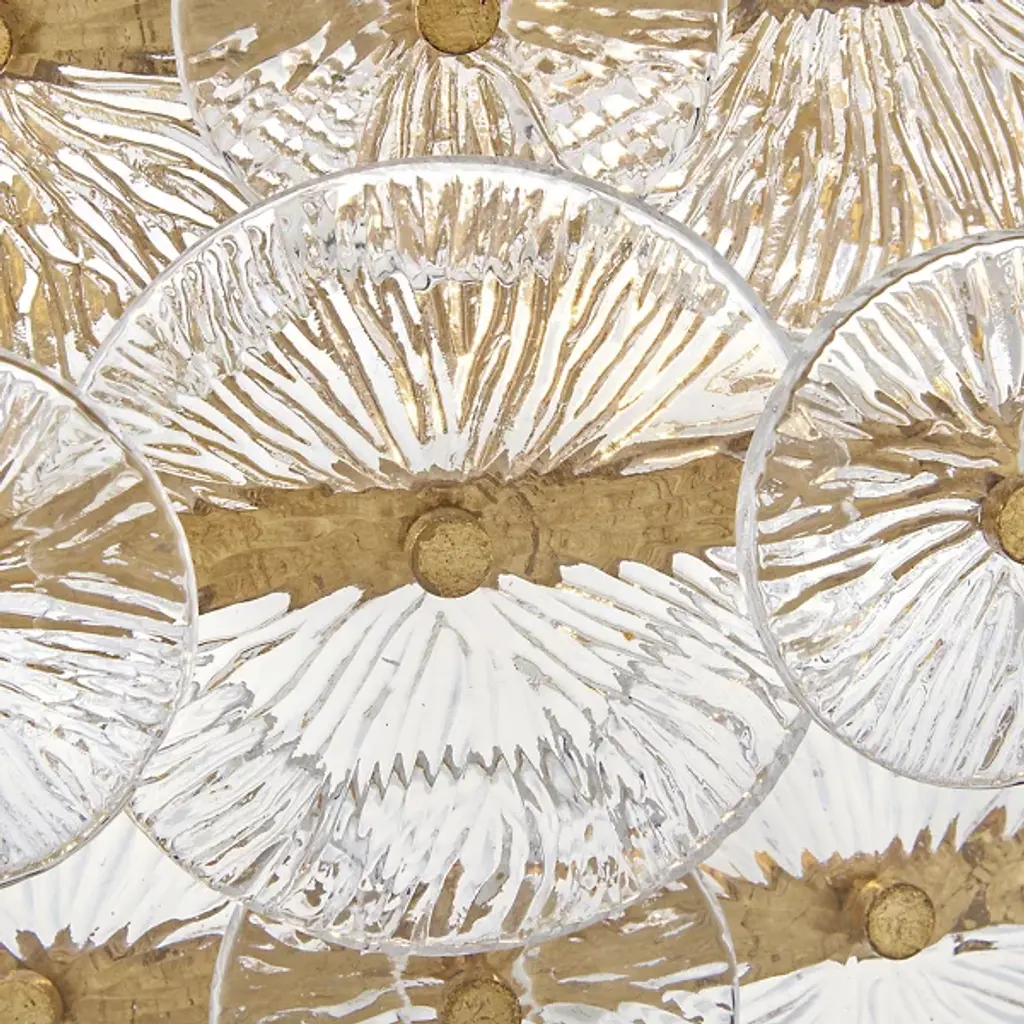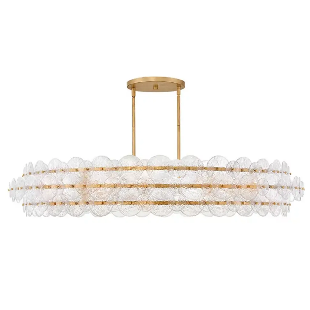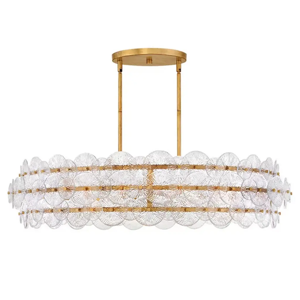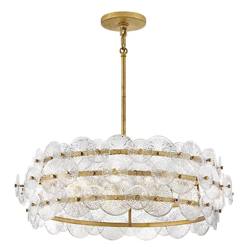 Give your home an Art Deco sensibility with the Rene Drum Chandelier by Fredrick Ramond. Secured by a canopy at your ceiling, this fixture radiates light through multiple layers of beautiful, pressed glass disks. Rene's signature touch highlights a fine metal framework, evoking both transitional and glam influences. The Rene Chandelier is defined by its drum shape.