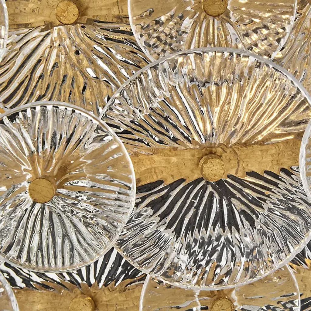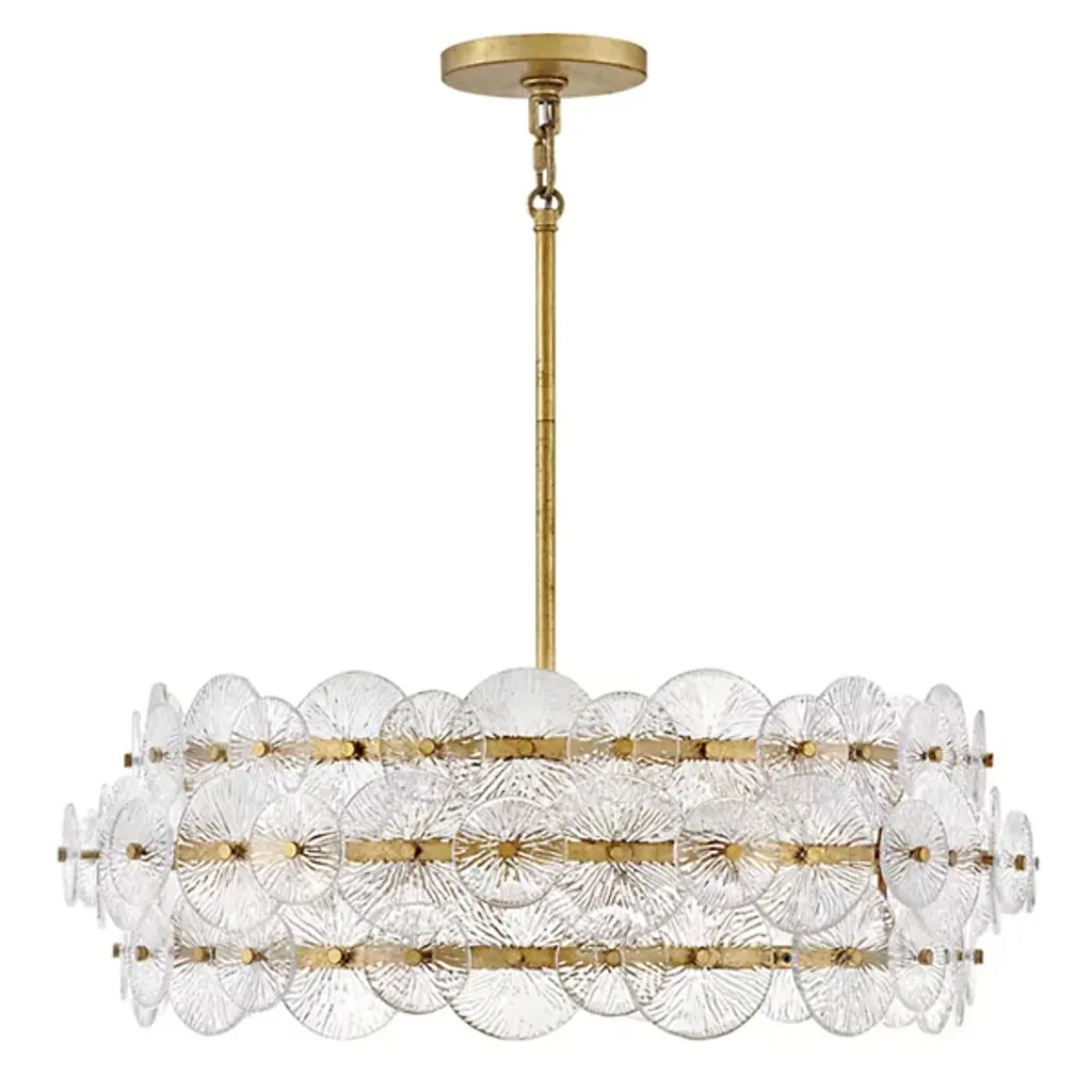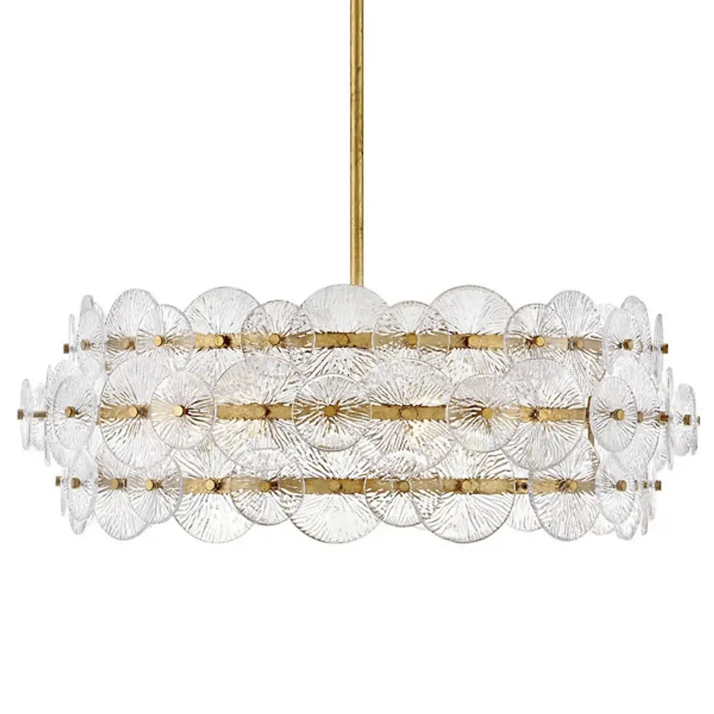 Give your home an Art Deco sensibility with the Rene Drum Chandelier by Fredrick Ramond. Secured by a canopy at your ceiling, this fixture radiates light through multiple layers of beautiful, pressed glass disks. Rene's signature touch highlights a fine metal framework, evoking both transitional and glam influences. The Rene Chandelier is defined by its drum shape.