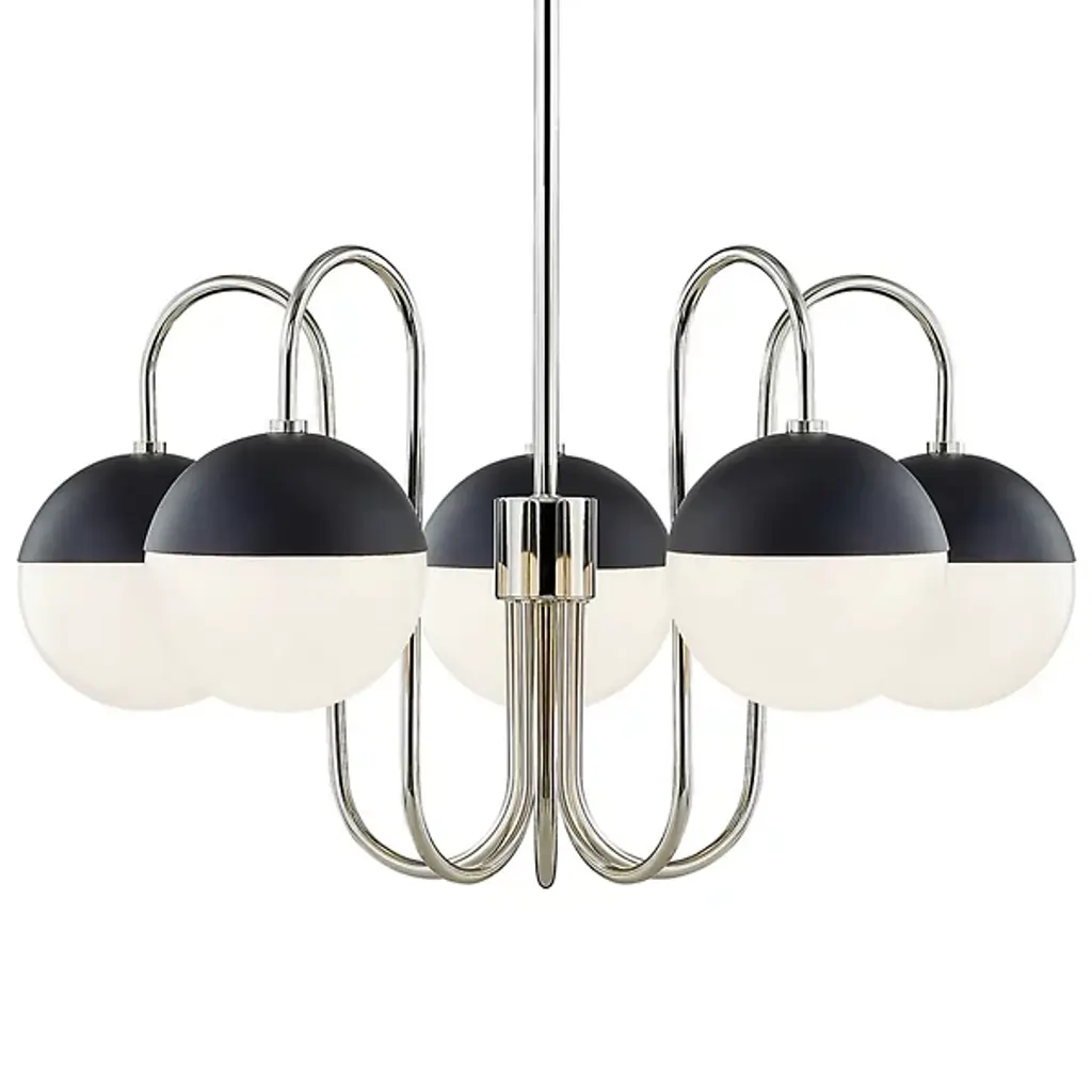 The ideal modern centerpiece. The Renee 5-Light Chandelier by Mitzi is sure to be a stunner that will make a statement in the foyer, dining room or living room. Dramatically curved arms sprout from the Steel frame to support the spherical Glass shades. This fixture will complement modern and contemporary spaces with ease and cast a gorgeously diffused downlight in the room to accentuate decor and furnishings. It's an amazing option to liven up the ambiance and make the room glow with flattering illumination and unforgettable style. This piece comes with a hang straight canopy for mounting on sloped ceilings.