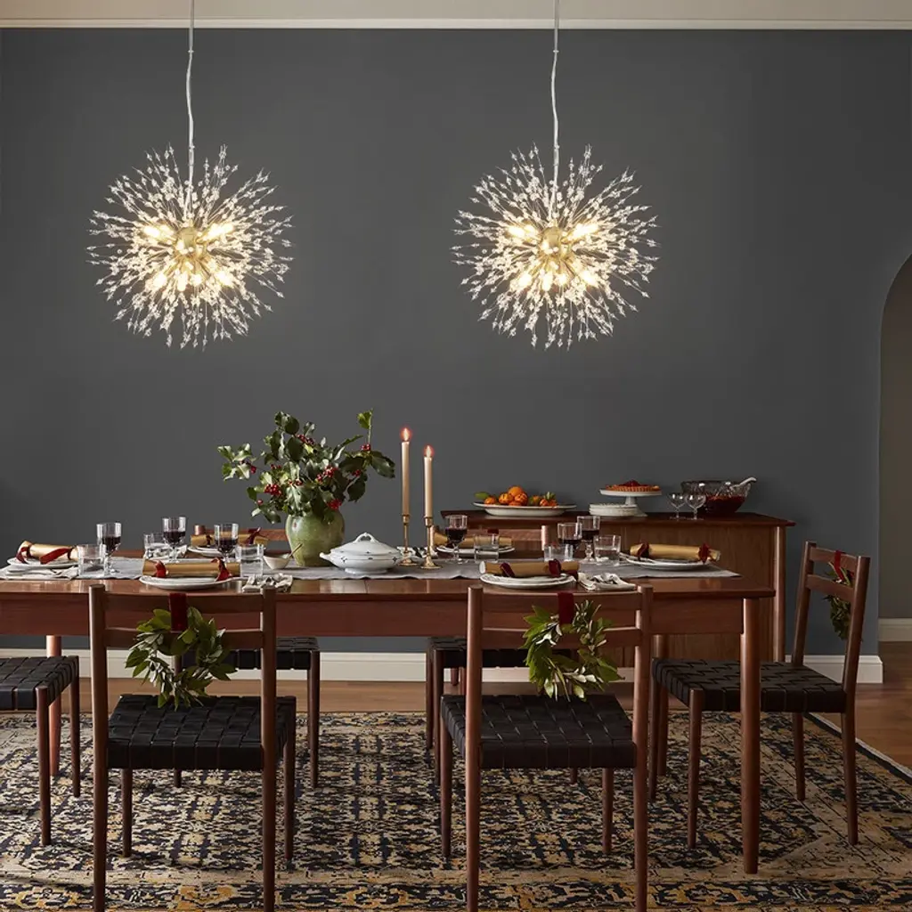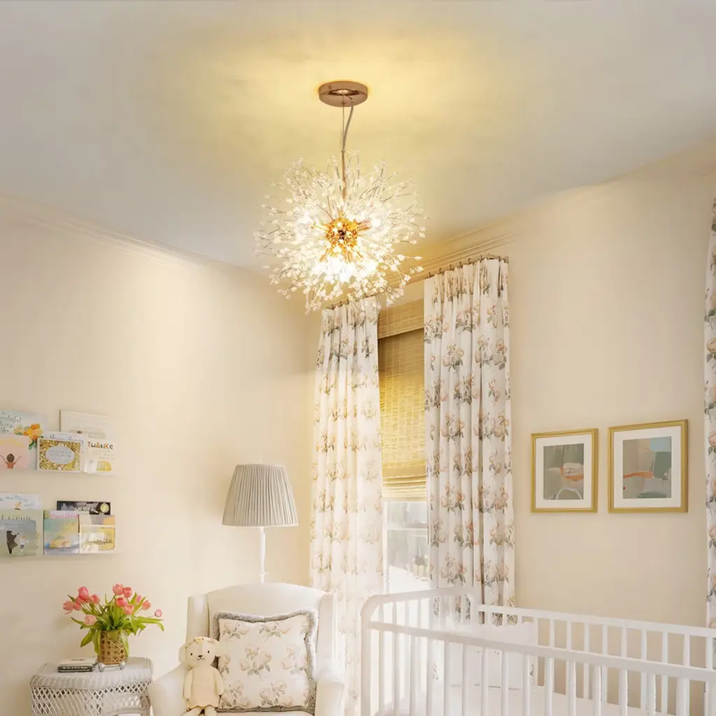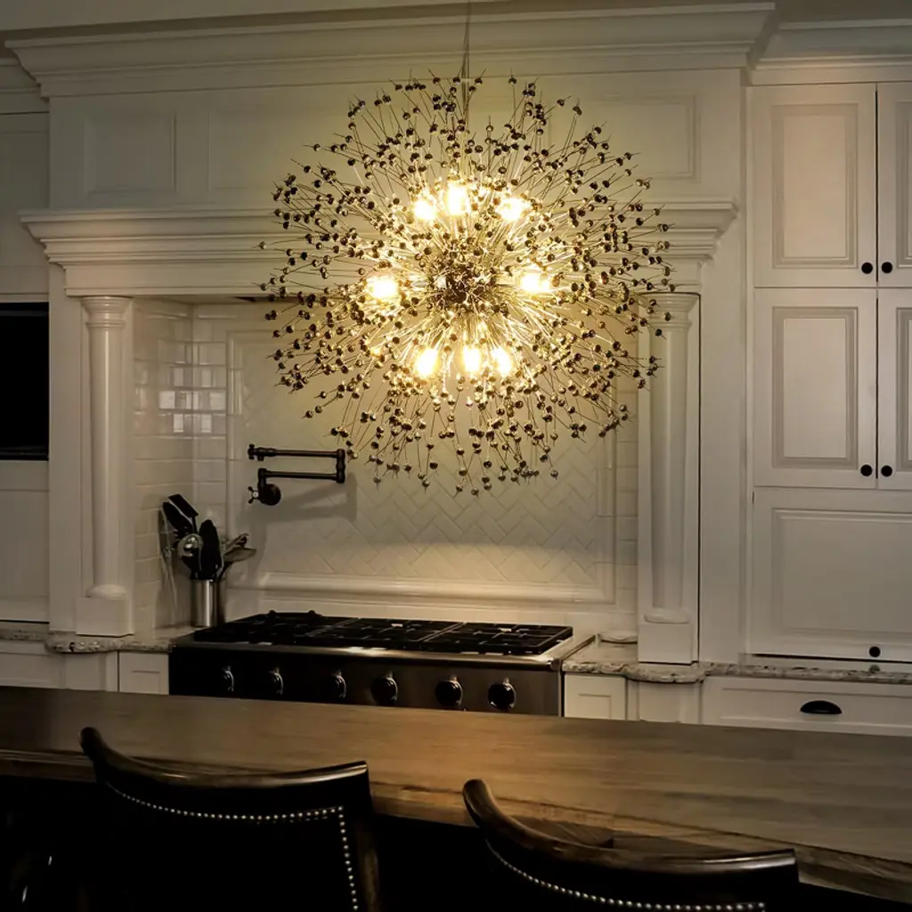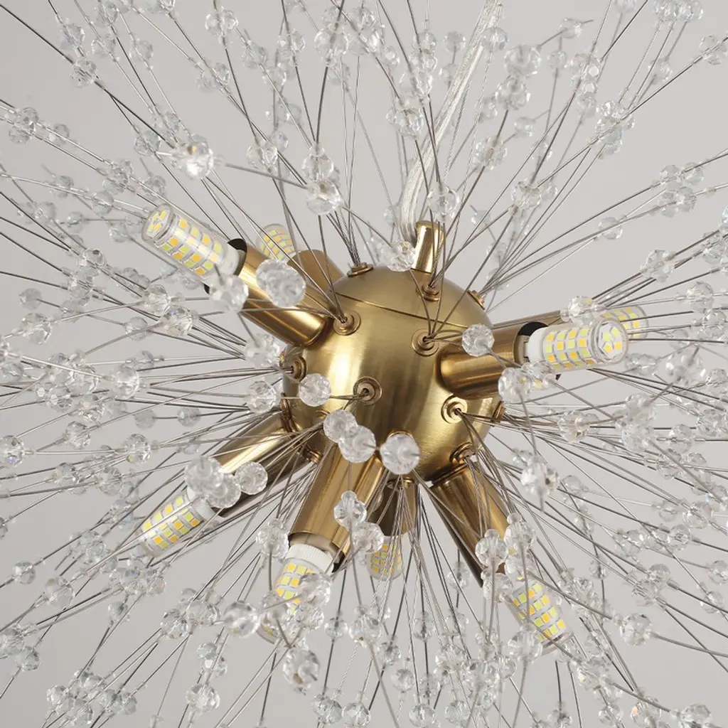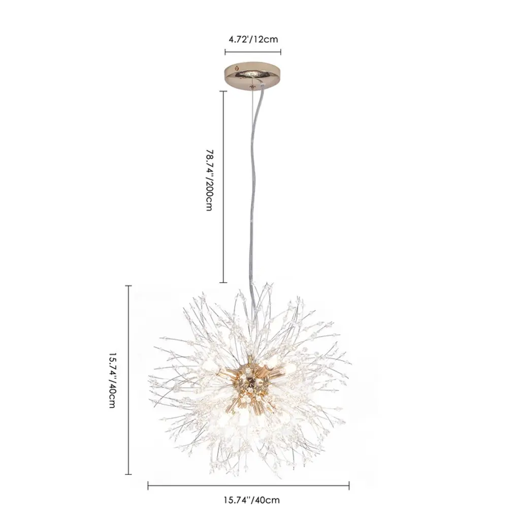 Illuminate your space with this 8-light Sputnik chandelier, designed in a dazzling dandelion shape with radiant crystal branches. Blending sunburst, starburst, and firework inspirations, this 15" modern glam chandelier adds eye-catching brilliance to dining areas, entryways, or bedrooms. The crystal elements refract light beautifully for a sparkling, upscale atmosphere. Equipped with G9 ceramic sockets and compatible with 60W bulbs (not included), this fixture is dimmable and easy to install with all mounting hardware included. Whether you're elevating a glam interior or adding a chic centerpiece, this crystal chandelier delivers a stylish, sculptural statement full of vibrant charm and luxurious glow.