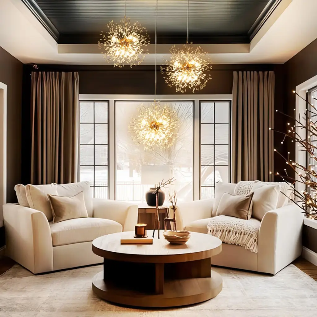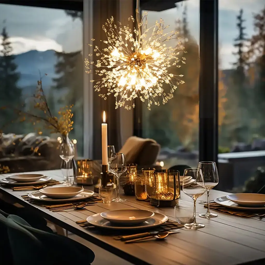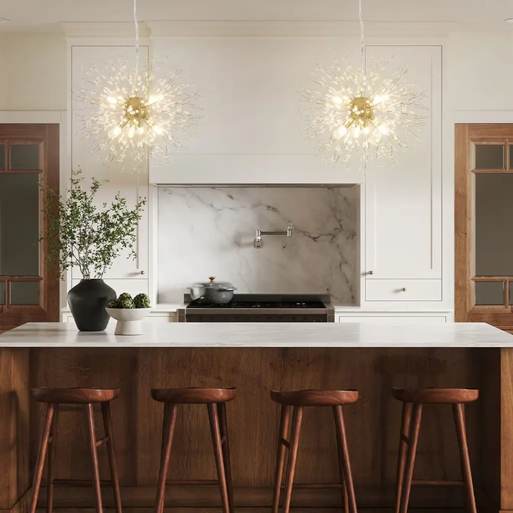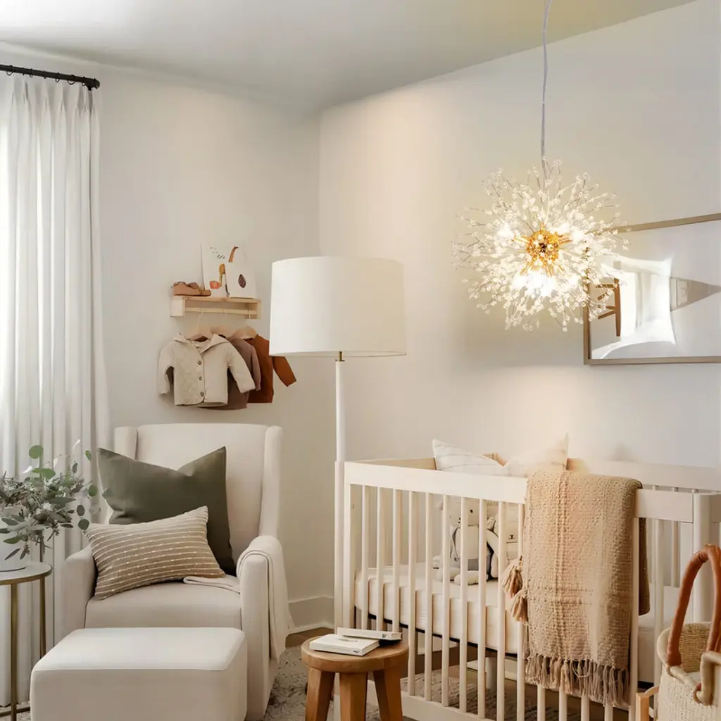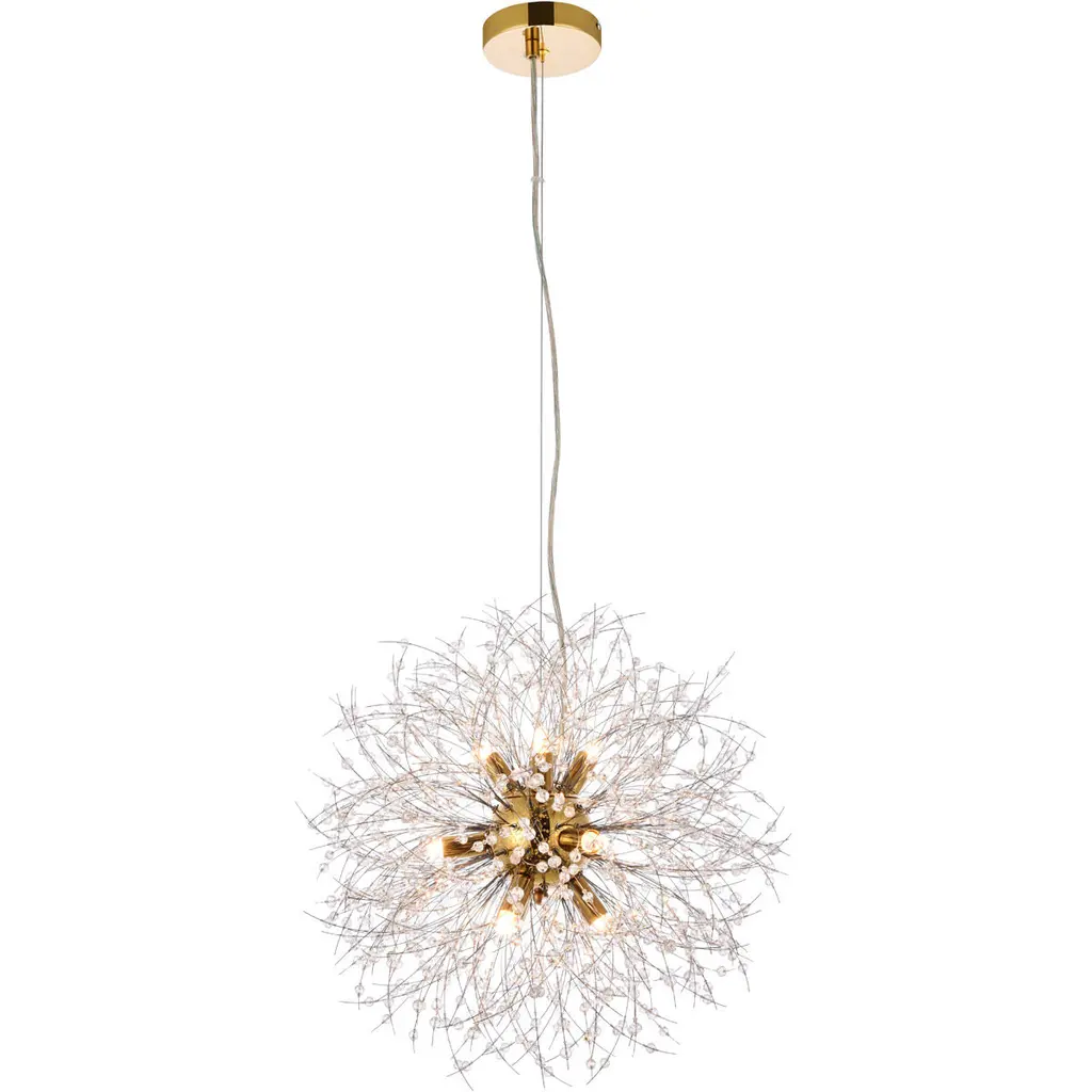 Illuminate your space with this 8-light Sputnik chandelier, designed in a dazzling dandelion shape with radiant crystal branches. Blending sunburst, starburst, and firework inspirations, this 15" modern glam chandelier adds eye-catching brilliance to dining areas, entryways, or bedrooms. The crystal elements refract light beautifully for a sparkling, upscale atmosphere. Equipped with G9 ceramic sockets and compatible with 60W bulbs (not included), this fixture is dimmable and easy to install with all mounting hardware included. Whether you're elevating a glam interior or adding a chic centerpiece, this crystal chandelier delivers a stylish, sculptural statement full of vibrant charm and luxurious glow.