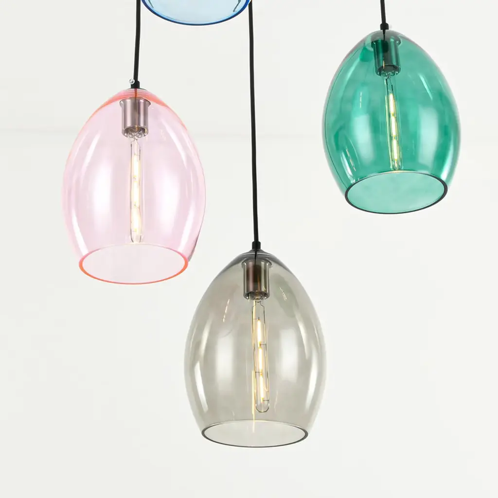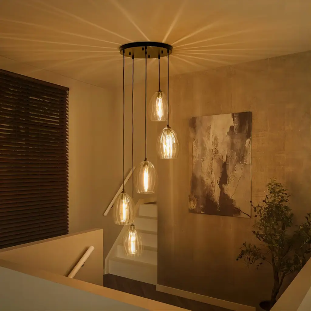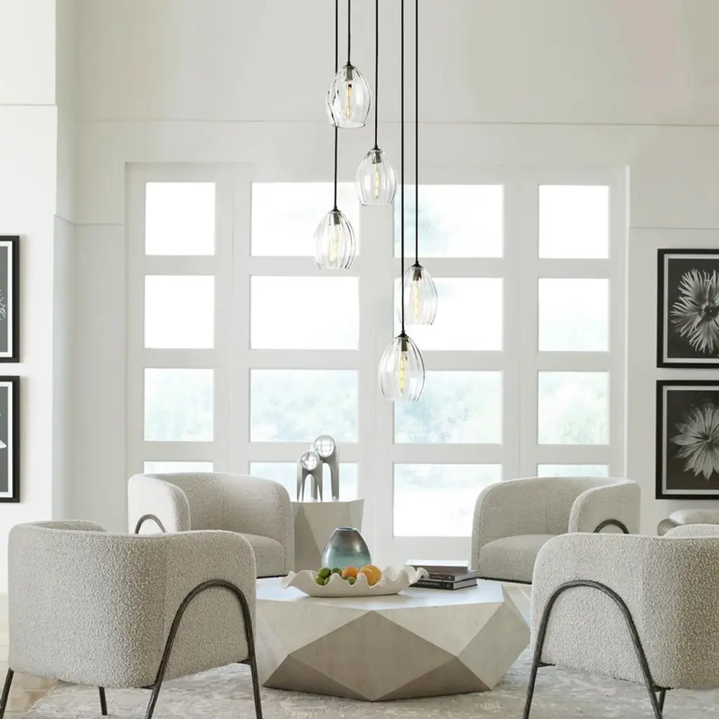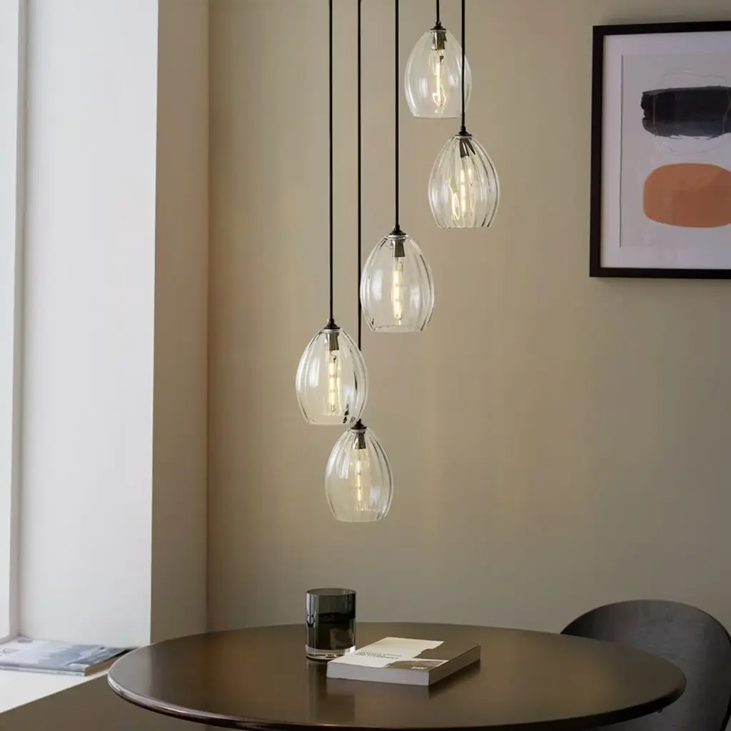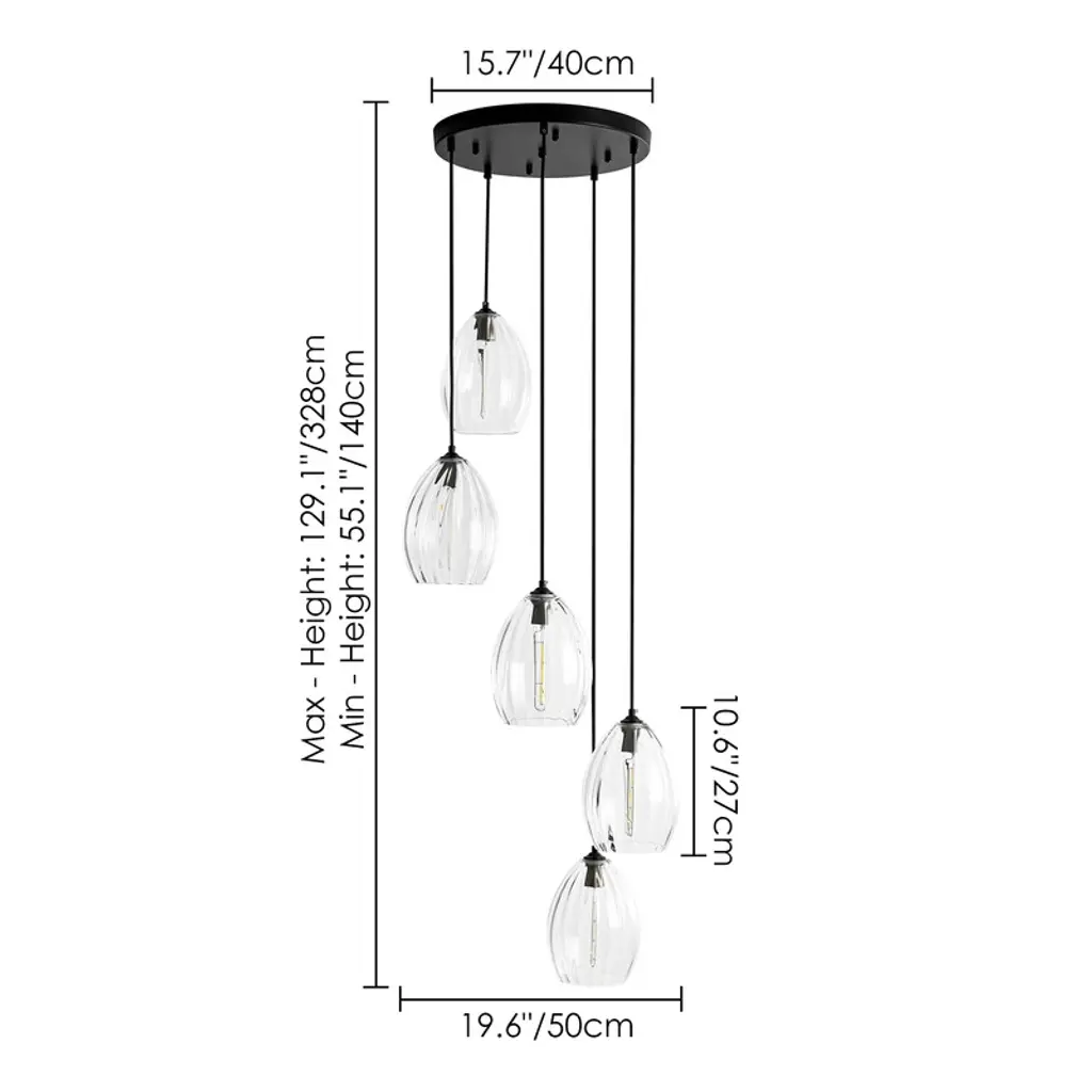 Showcase artistic elegance with this 5-light chandelier, featuring a staggered cluster of textured glass olive globes. The sculptural design blends modern minimalism with rich visual depth, creating a floating centerpiece over dining tables or entryways. The staggered suspension adds dynamic layering and movement, while the textured glass diffuses light beautifully. Enjoy dimmable functionality for mood control and quick installation with included hardware. Compatible with E12 base 60W bulbs (not included), this 19" chandelier offers both striking style and everyday function.