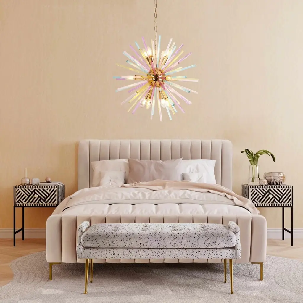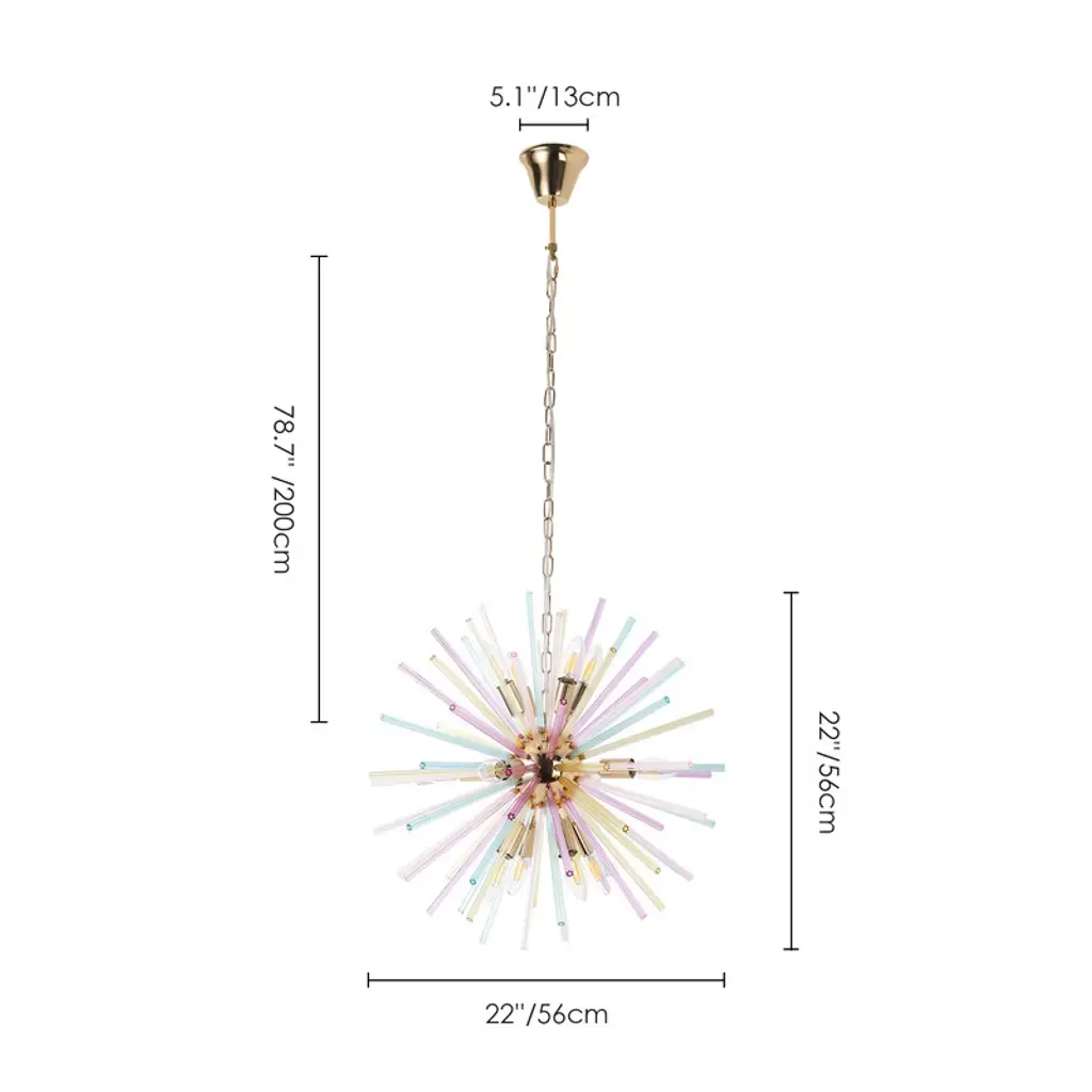 Make a bold statement with this 12-light colorful Sputnik chandelier inspired by firework bursts and dandelion blooms. Featuring radiant sunburst-style glass orbs in vivid hues, this 22" starburst fixture adds instant drama and modern glam to dining rooms, bedrooms, or entryways. The dandelion-like design casts dynamic shadows while softening light. Compatible with E12 40W bulbs (not included) and dimmable for custom ambiance, it comes with all mounting hardware for easy installation. Perfect for those who love vibrant, sculptural lighting with personality, this chandelier blends art and function in a striking starburst form.