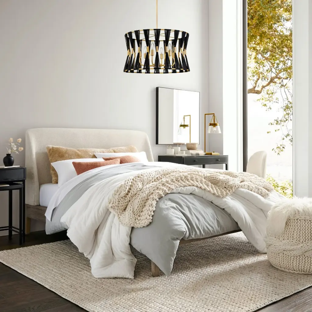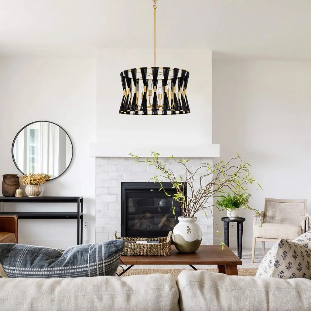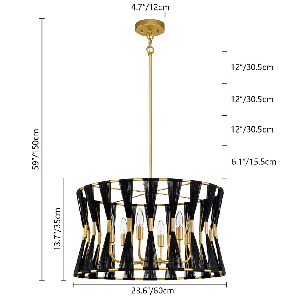 Introduce eye-catching elegance with this 6-light 24" boho-style woven pendant chandelier, featuring a hand-loomed hourglass silhouette crafted from ivory white or black hemp rope. Designed to hang gracefully above dining or living spaces, each handcrafted piece offers subtle artisanal variation. Add a layer of natural texture and organic charm to interiors with this bohemian chandelier, rated for dry locations and recommending the use of E12 bulbs (not included). This artistic fixture brings a soft, woven elegance to modern and vintage interiors alike.